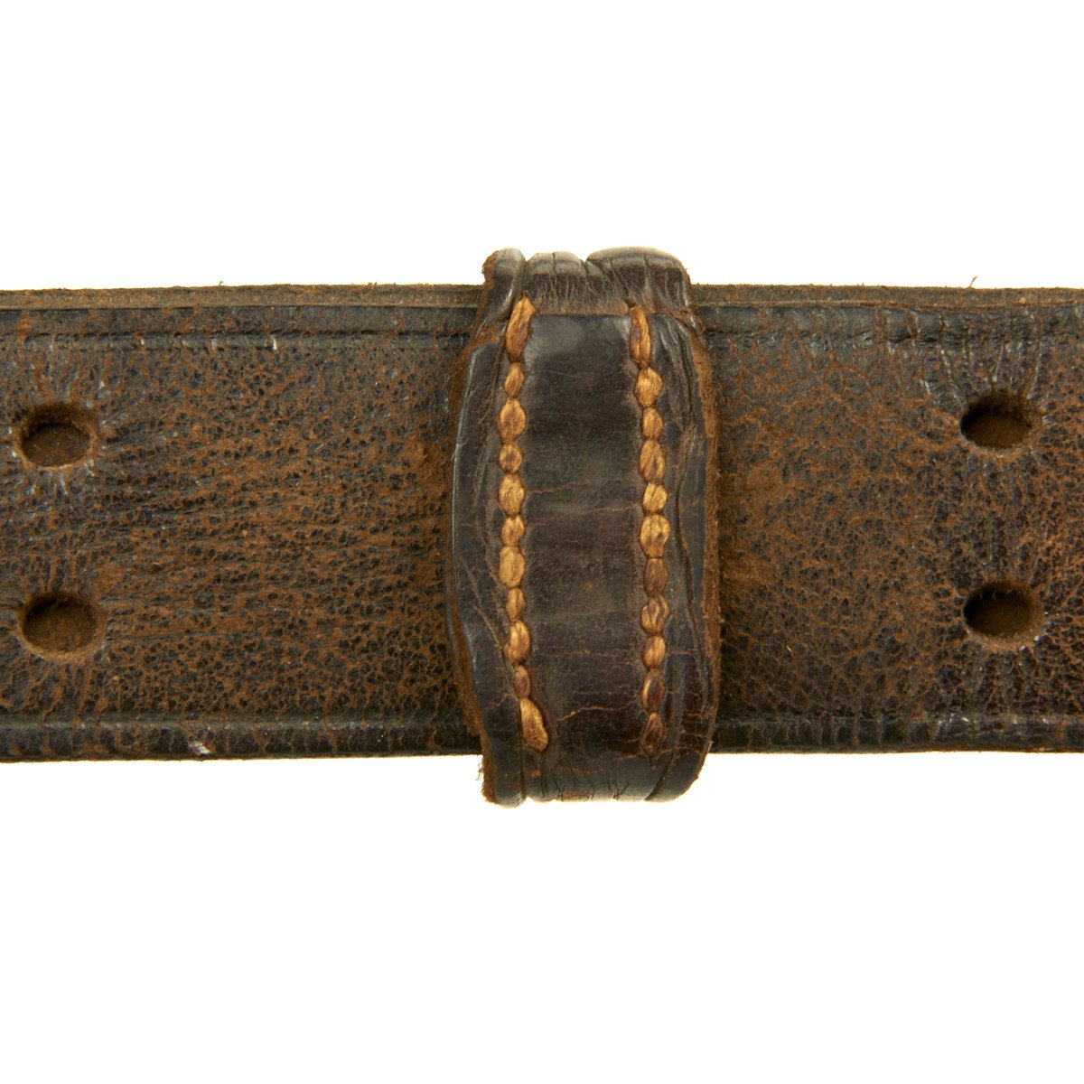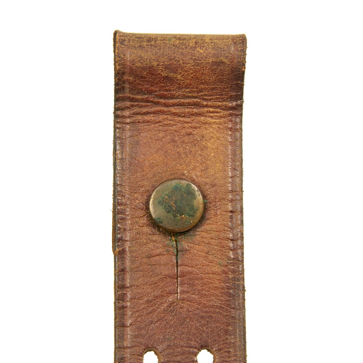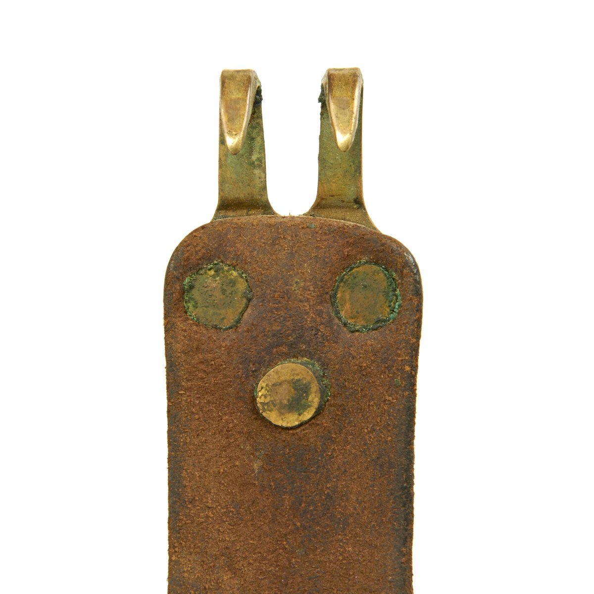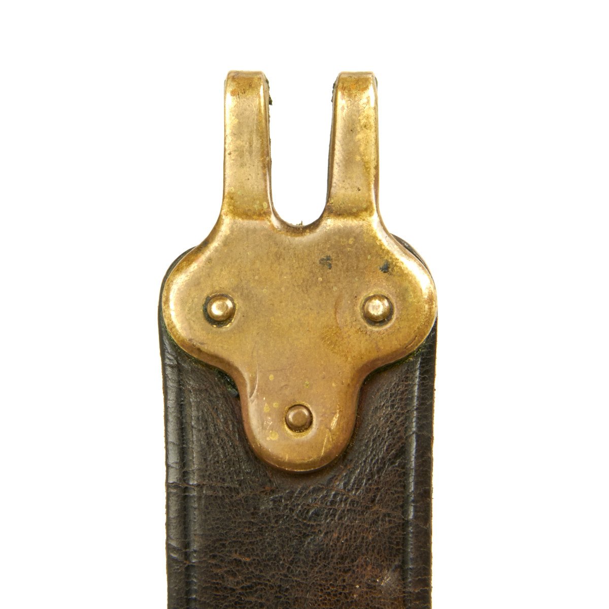 Condition of leather is good and supple, has darkened over time, complete with heavy stitching, one leather keeper loop, proper adjustment holes and correct pattern double brass hook. Some cracking is evident but overall functional and serviceable. An excellent upgrade for any Springfield Trapdoor or Krag rifle!