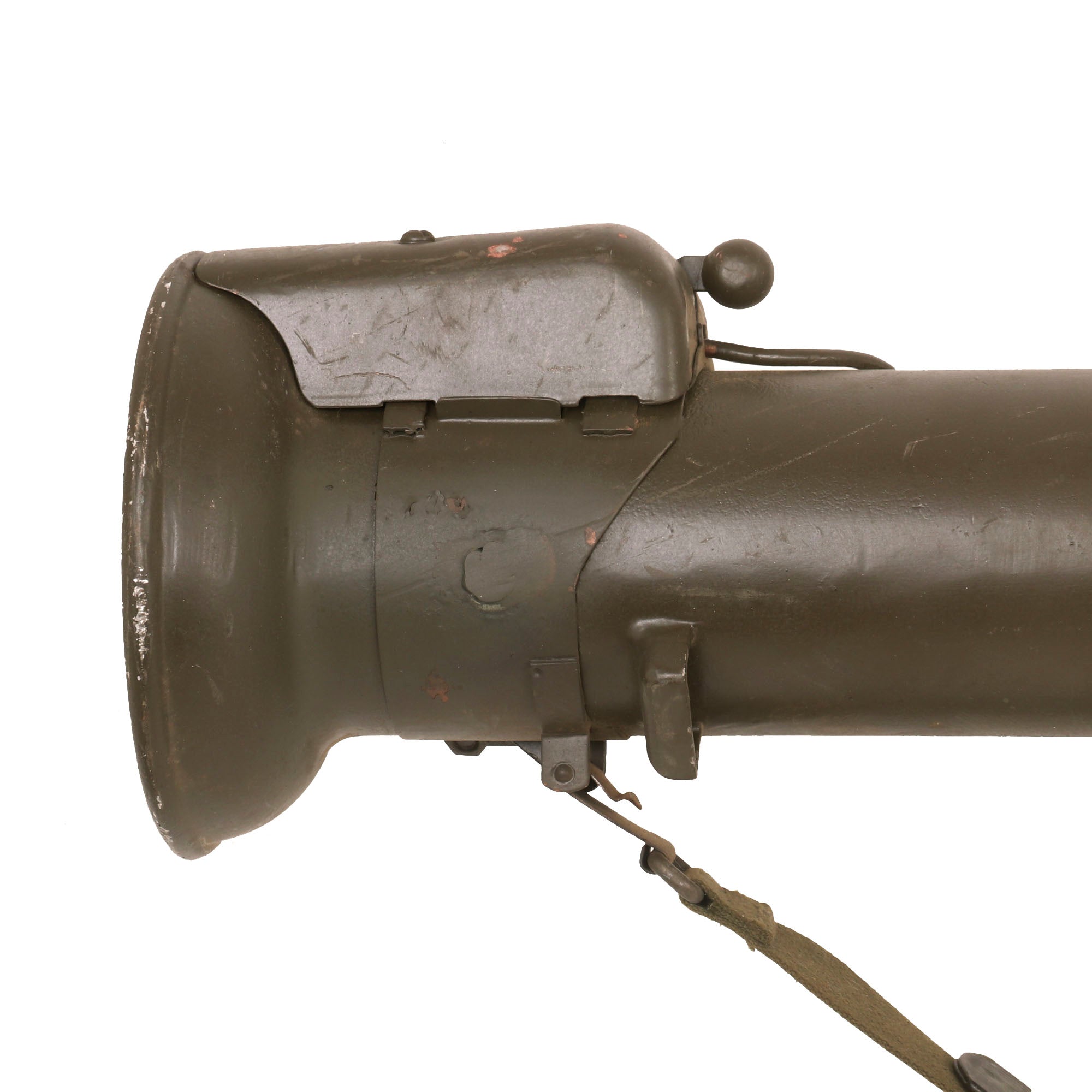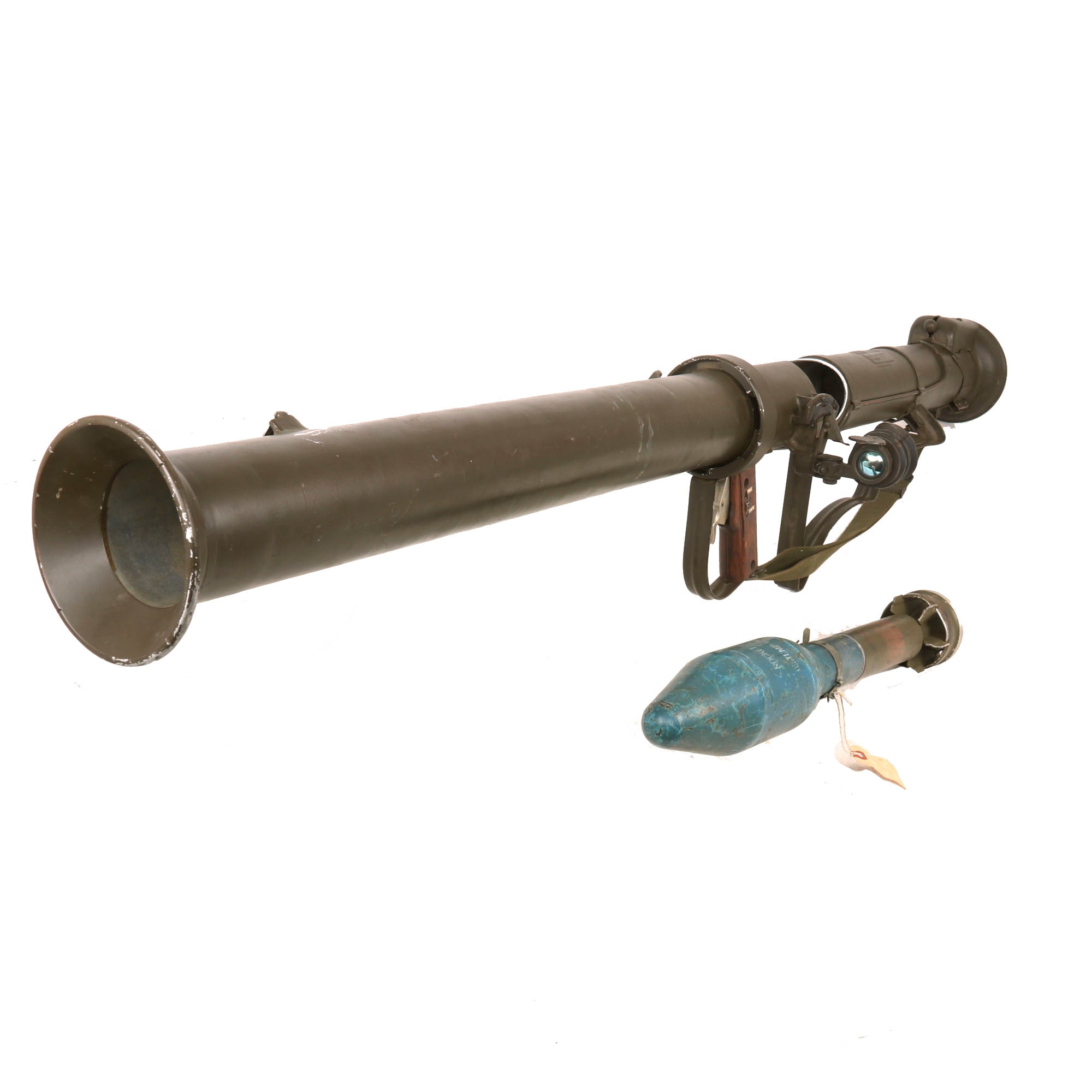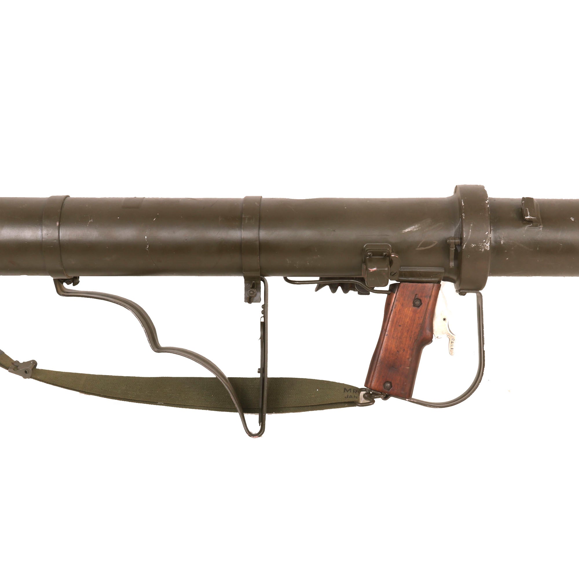 It is in great shape, having been repainted multiple times during service. It still features the original attractive wooden grip featuring a moveable trigger, and fully functional safety. The trigger still dry fires, and the loading lever at the rear still moves as well. It comes complete with an original optical sight, which is in very good shape, and even retains the rubber eye cup, which are almost always missing! The optic still looks clear too. It also has a lovely correct original web sling mounted correctly on the launcher, which is dated January 1953. The original wrench is still contained on the interior of the metal shoulder stock. Light weight and assembles to approximately 60 inches in overall length.