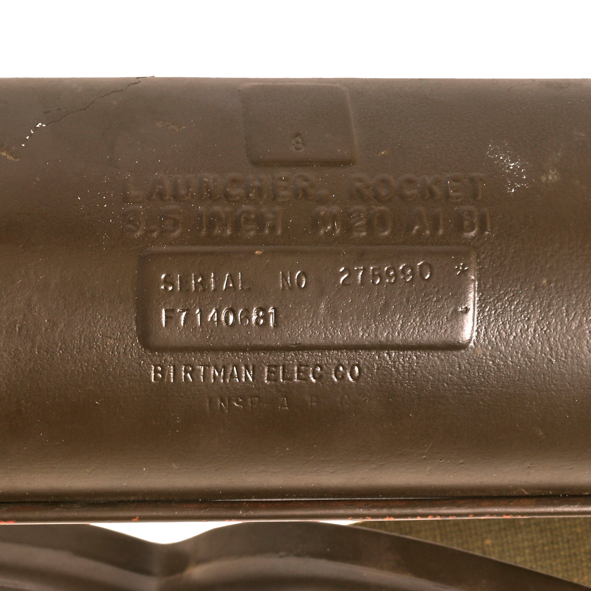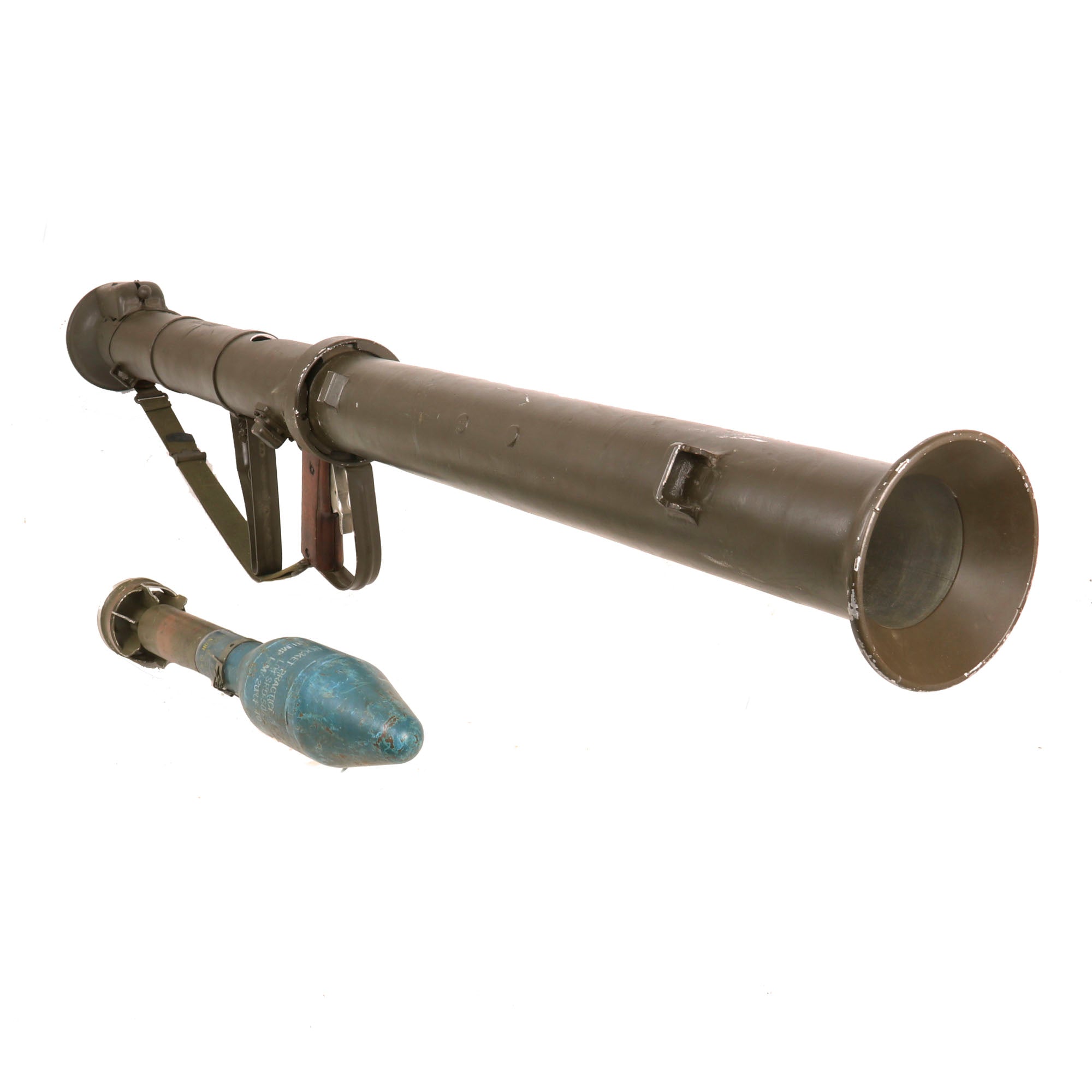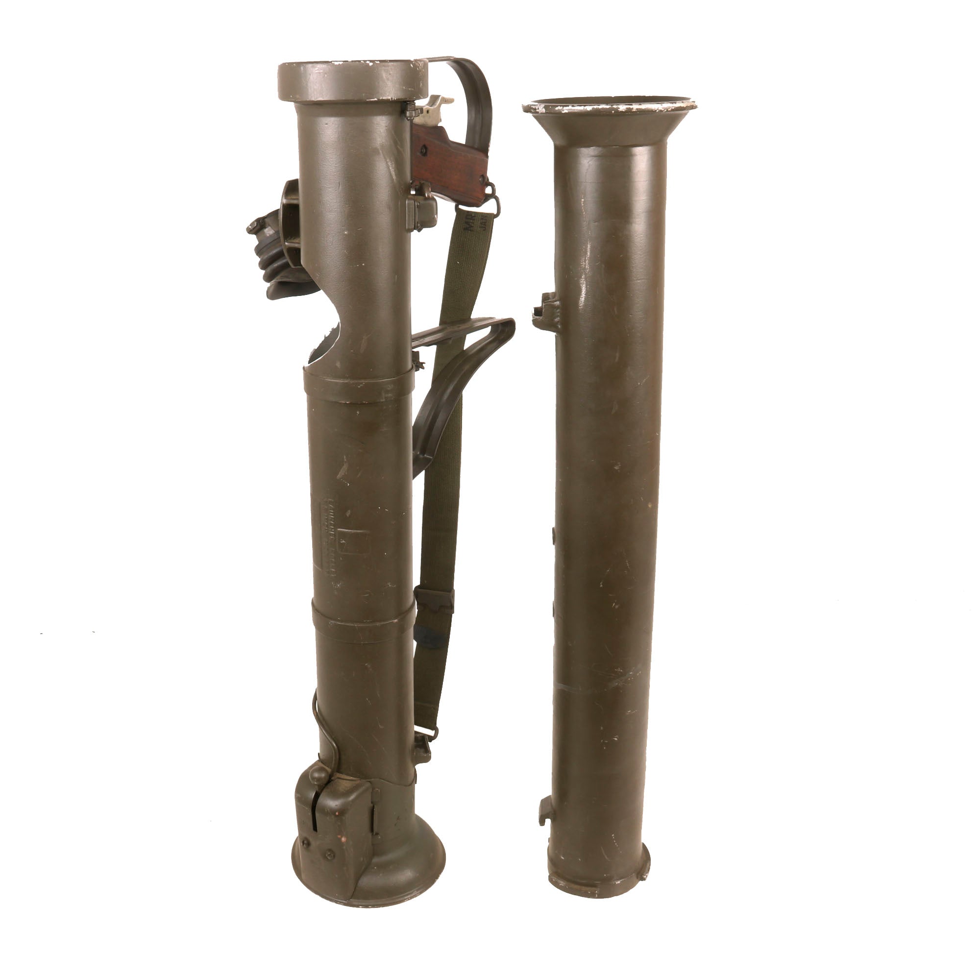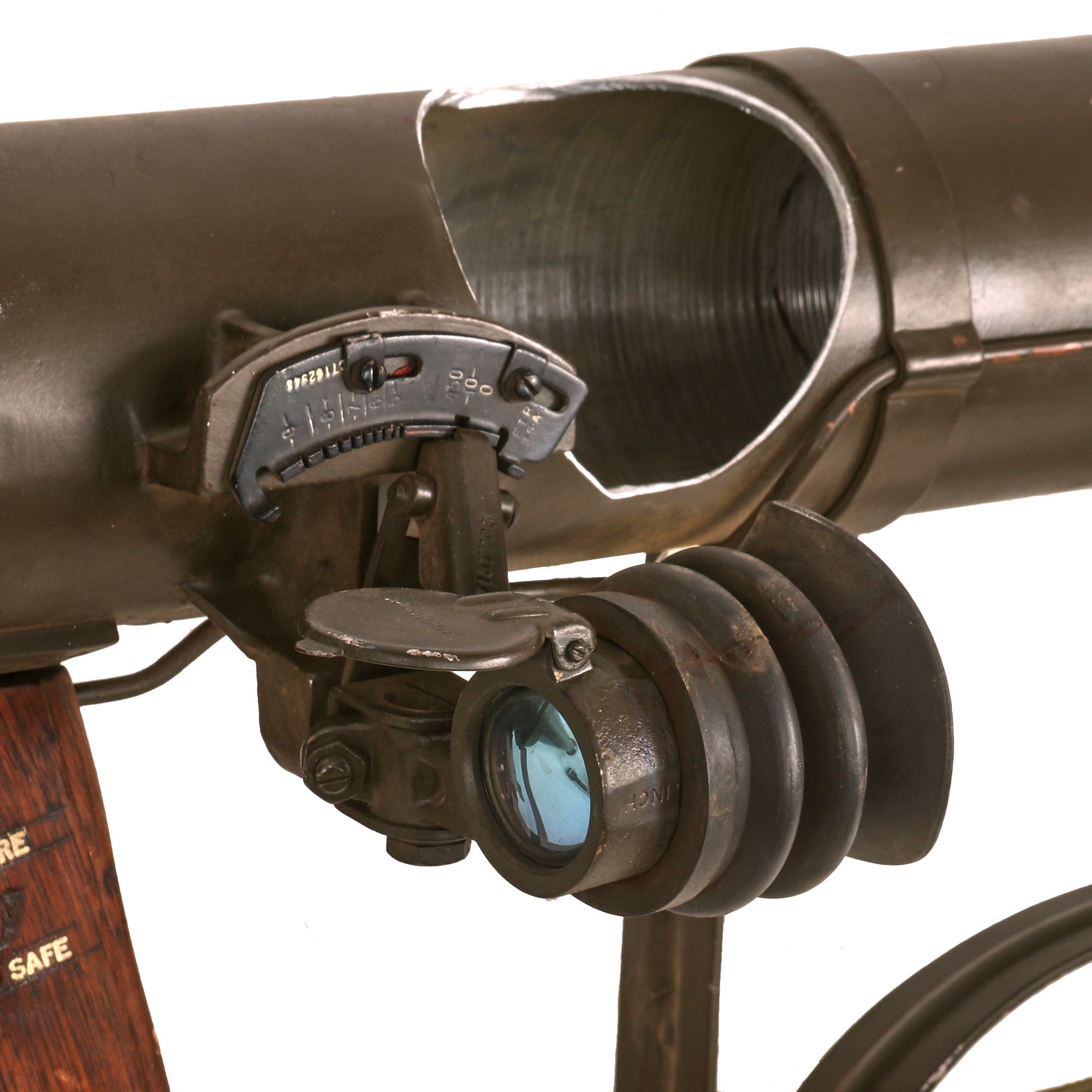 It is in great shape, having been repainted multiple times during service. It still features the original attractive wooden grip featuring a moveable trigger, and fully functional safety. The trigger still dry fires, and the loading lever at the rear still moves as well. It comes complete with an original optical sight, which is in very good shape, and even retains the rubber eye cup, which are almost always missing! The optic still looks clear too. It also has a lovely correct original web sling mounted correctly on the launcher, which is dated January 1953. The original wrench is still contained on the interior of the metal shoulder stock. Light weight and assembles to approximately 60 inches in overall length.