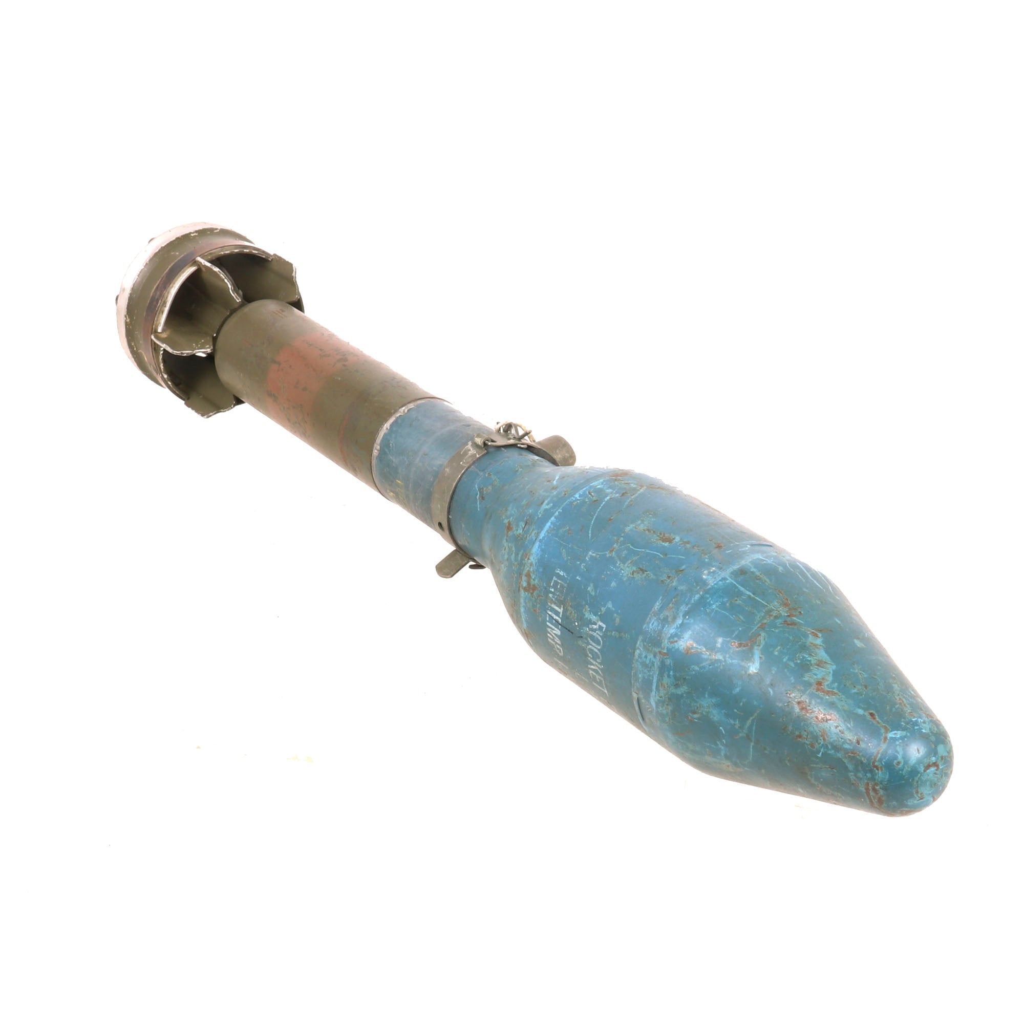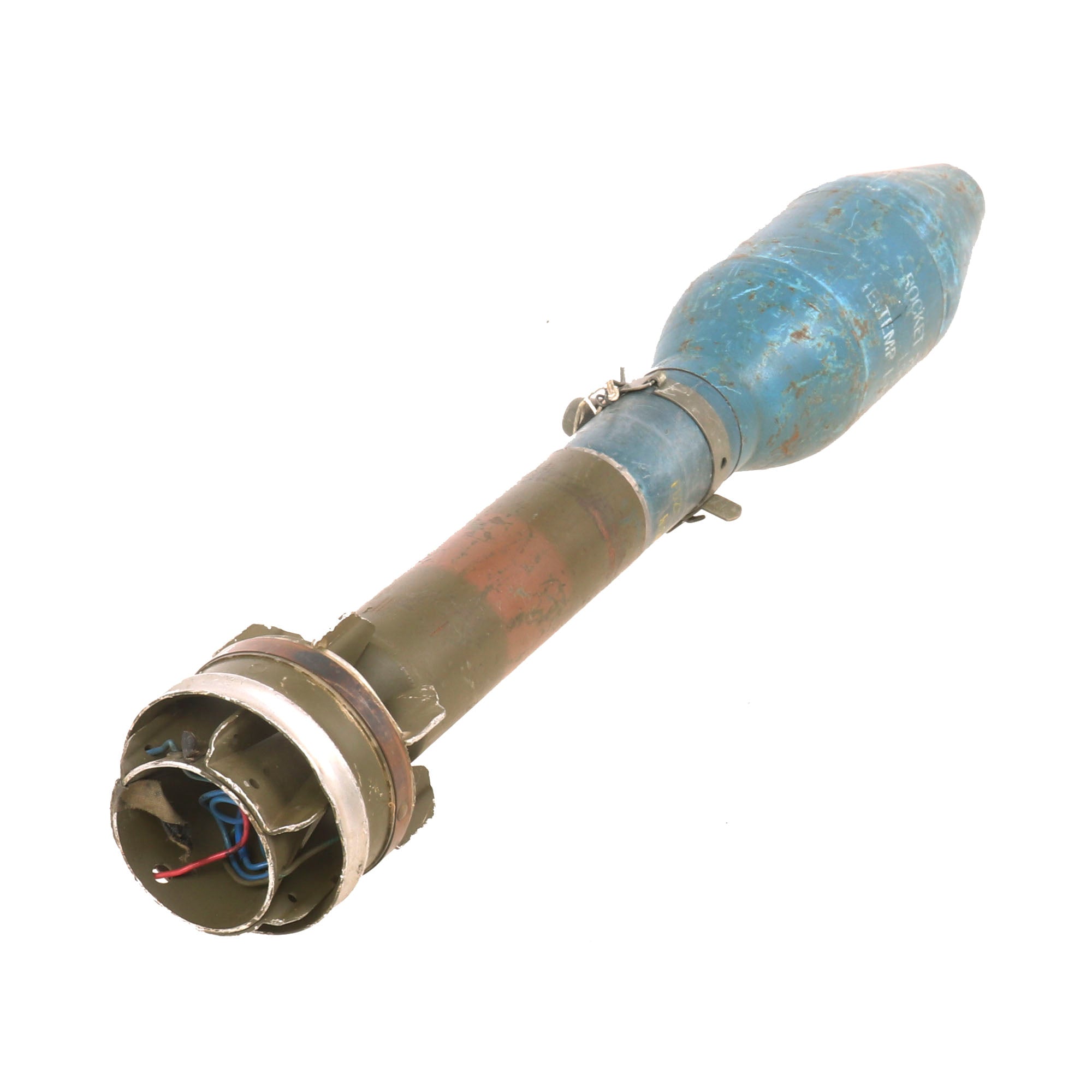 The included practice round is stamped with date 9 - 51 (September 1951) on the inert warhead and 8 - 53 (August 1953) on the fuze section of the inert round, which is still the original color and has not been repainted as so many are. There are stenciled markings on the side of the warhead with a 12 - 70 date for December 1970. It still has the original safety, and the cover is still retained, a real treat!