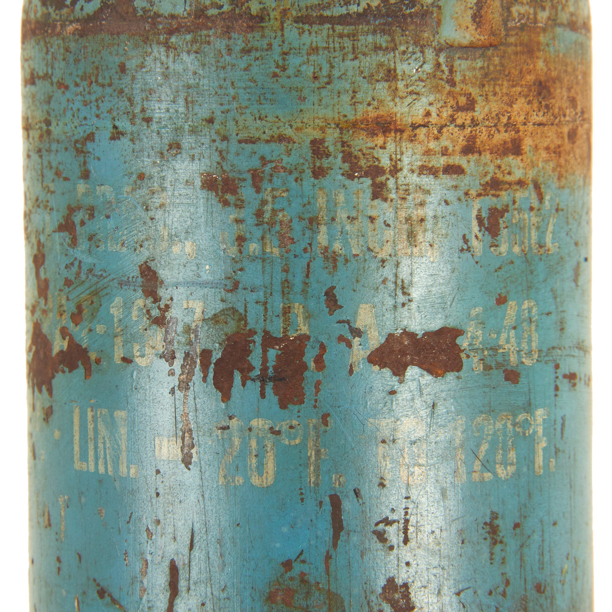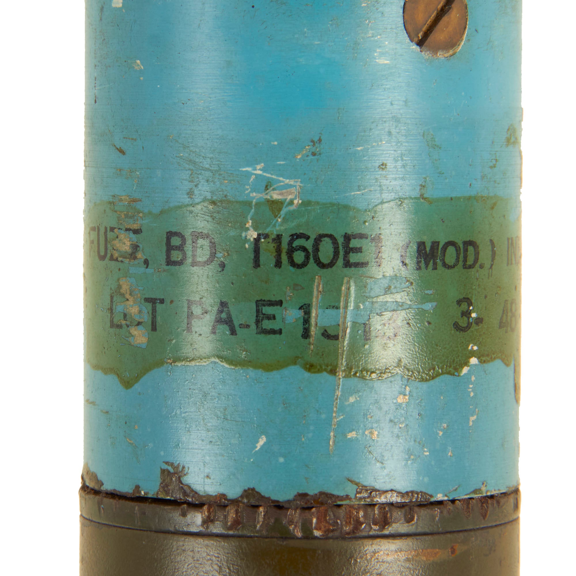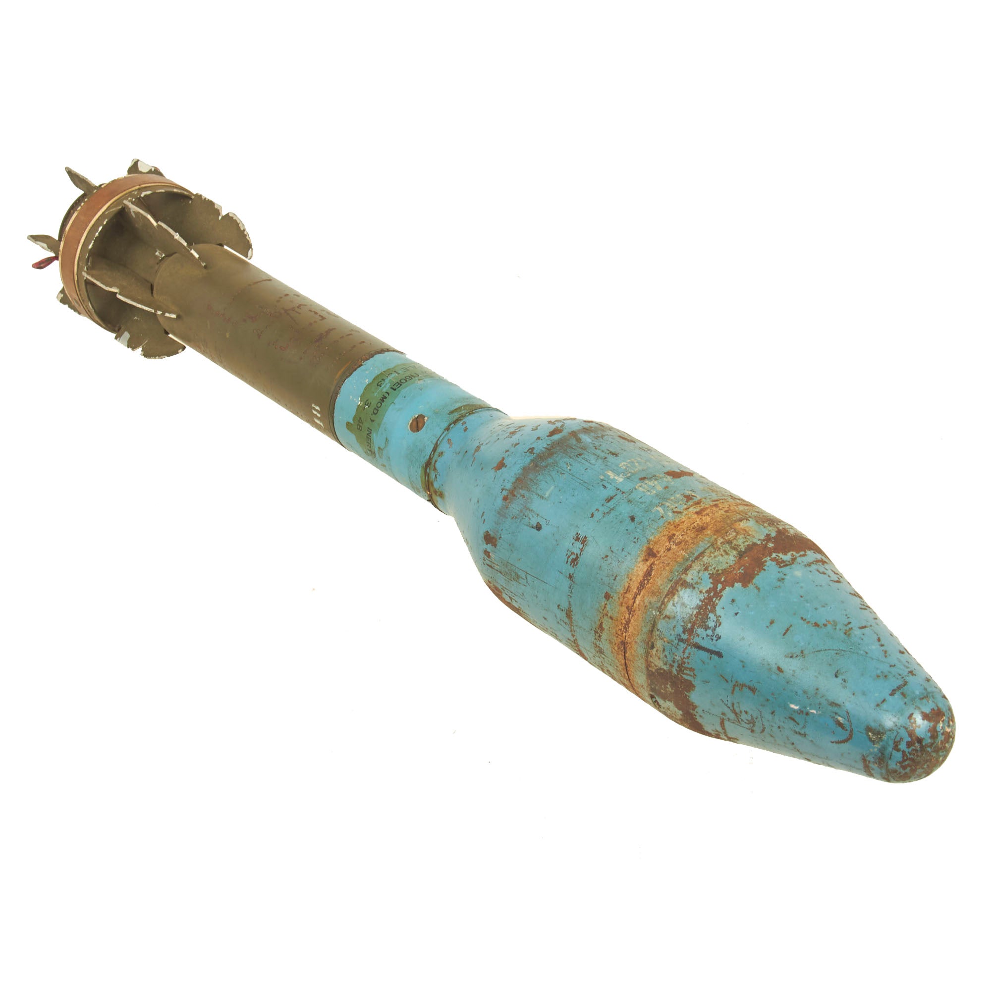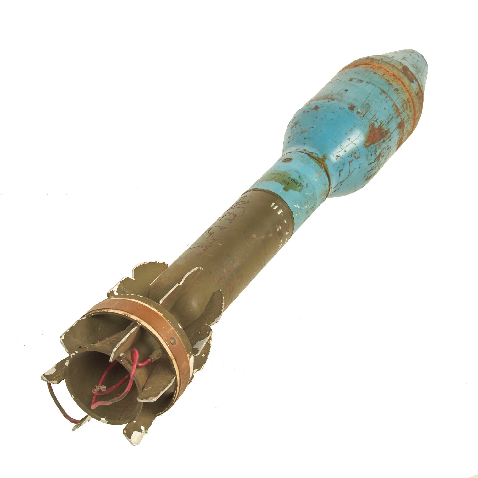The included U.S. M20 Super Bazooka Inert Practice Round is a VERY early example, stamped SEP. - 45 into the metal of the blue warhead, with a 3 - 48 paint decal below. There are various other markings on the round, as they were often recycled, and would have new paint markings added as they continued their service.