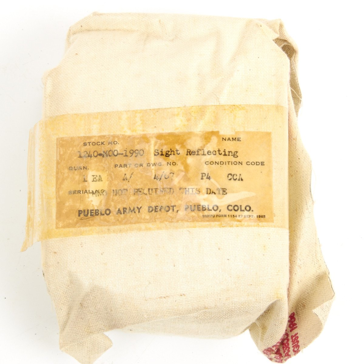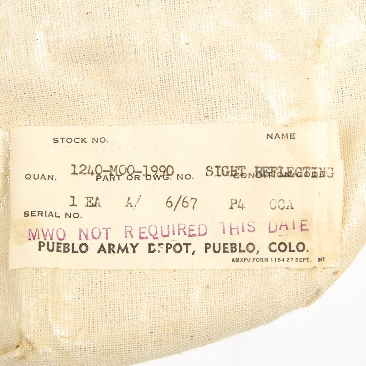 STOCK No: 12450-MOO-1990NAME: SIGHT REFLECTINGQUAN: 1PART or DWG No: A 4/67CONDITION NOTE: P4 CCASERIAL: MWO NOT REQUIRED THIS DATEPUEBLO ARMY DEPOT, PUEBLO, COLOJust what you need to fix up your demilitarized bazooka!