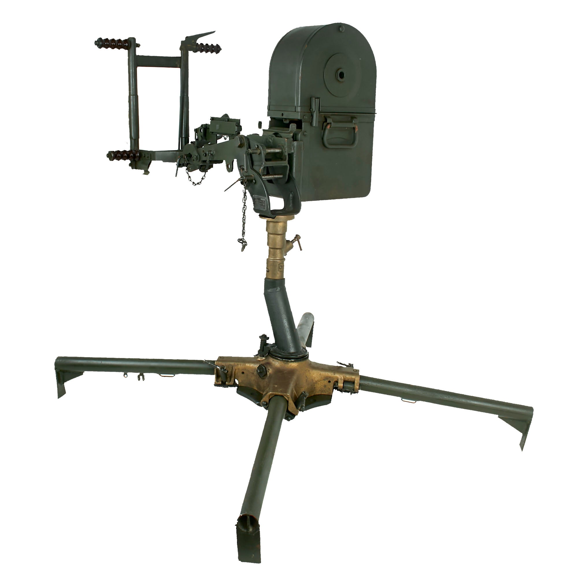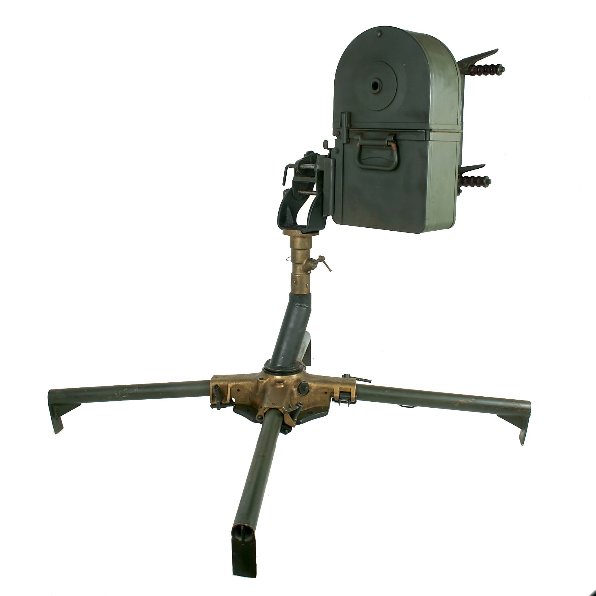 Original Item: Only One Available. This is a fantastic absolutely original U.S. manufactured, M-63 Anti-Aircraft Ground Mount for the standard U.S. M2 Browning .50 caliber heavy machine gun. These were used to mount the M2 on the ground for use in an anti-aircraft role, as the M3 tripod was unsuitable for this. Likewise, the M-63 is not the most stable at lower angle fire. It comes complete with an excellent "Tombstone" M2 Belt Drum "Magazine Chest", which attaches to the feed tray on the mount.