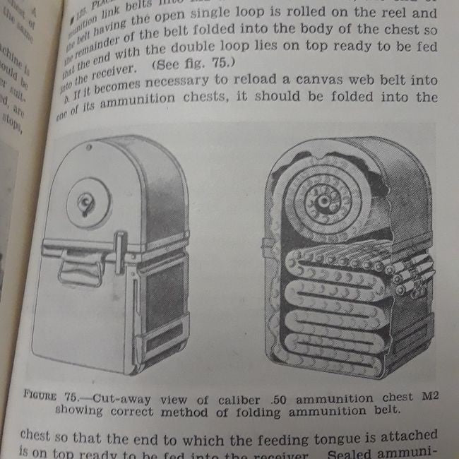 The included 225 round M2 "Ammunition Chest", more commonly called the "Tombstone" magazine or belt drum, is in great shape, with a lovely OD green finish, and it still opens correctly. It is easily mounted onto the M63 crosshead, and really adds to the piece. We unfortunately do not have the loading winder used on the top portion.