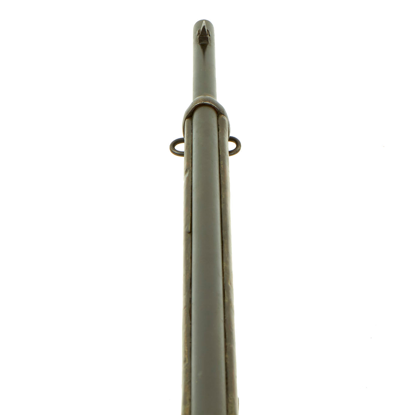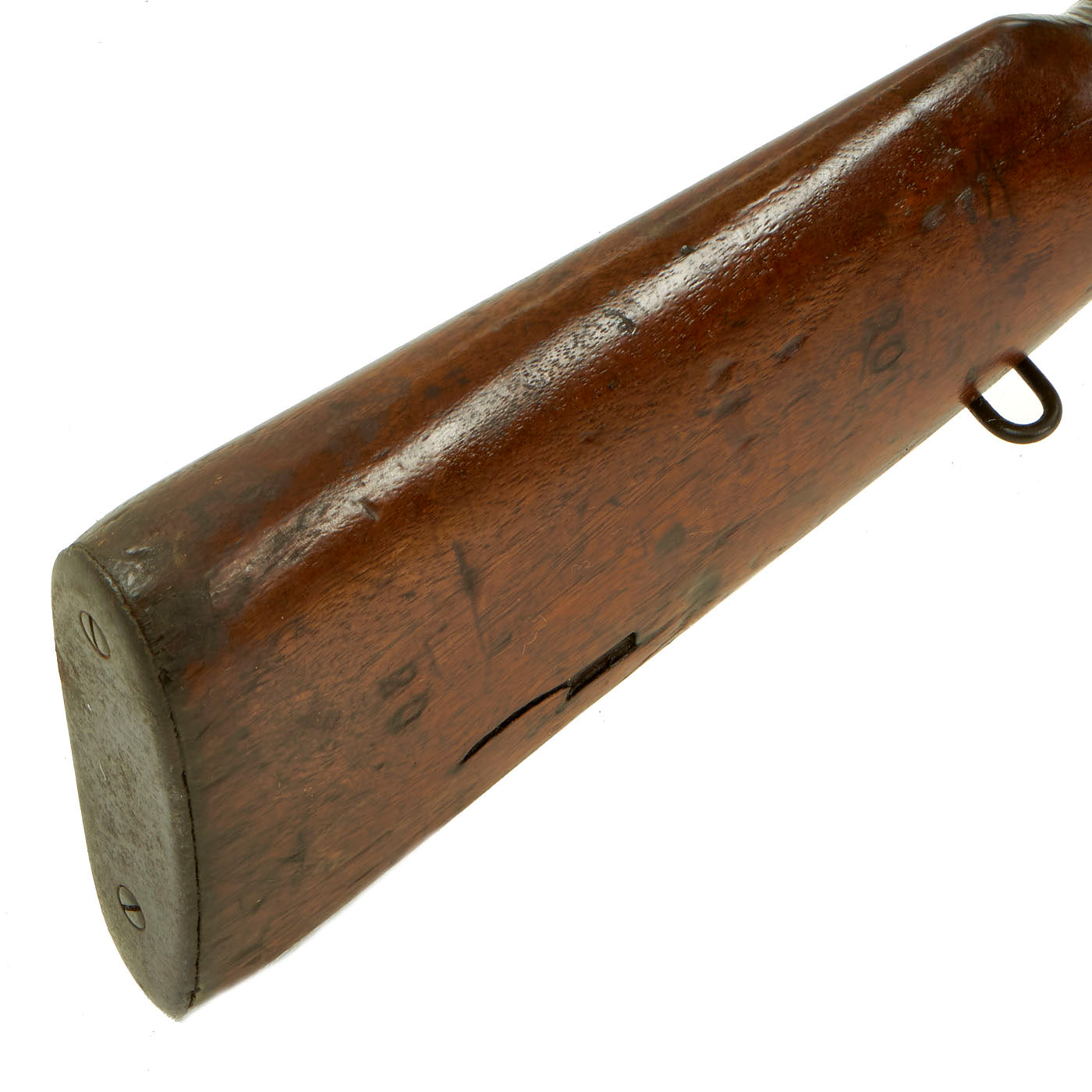 The stock is in similar condition, showing a lot of wear from use, though it does not look to have seen any factory reconditioning. There are some chunks missing and pressure dents. There also looks to be a bit of woodworm damage on the left side of the butt stock. Both the fore stock and butt stock look to have been varnished, which has turned whitish in places due to moisture exposure. The original cleaning rod is still present, sored in a channel under the barrel.