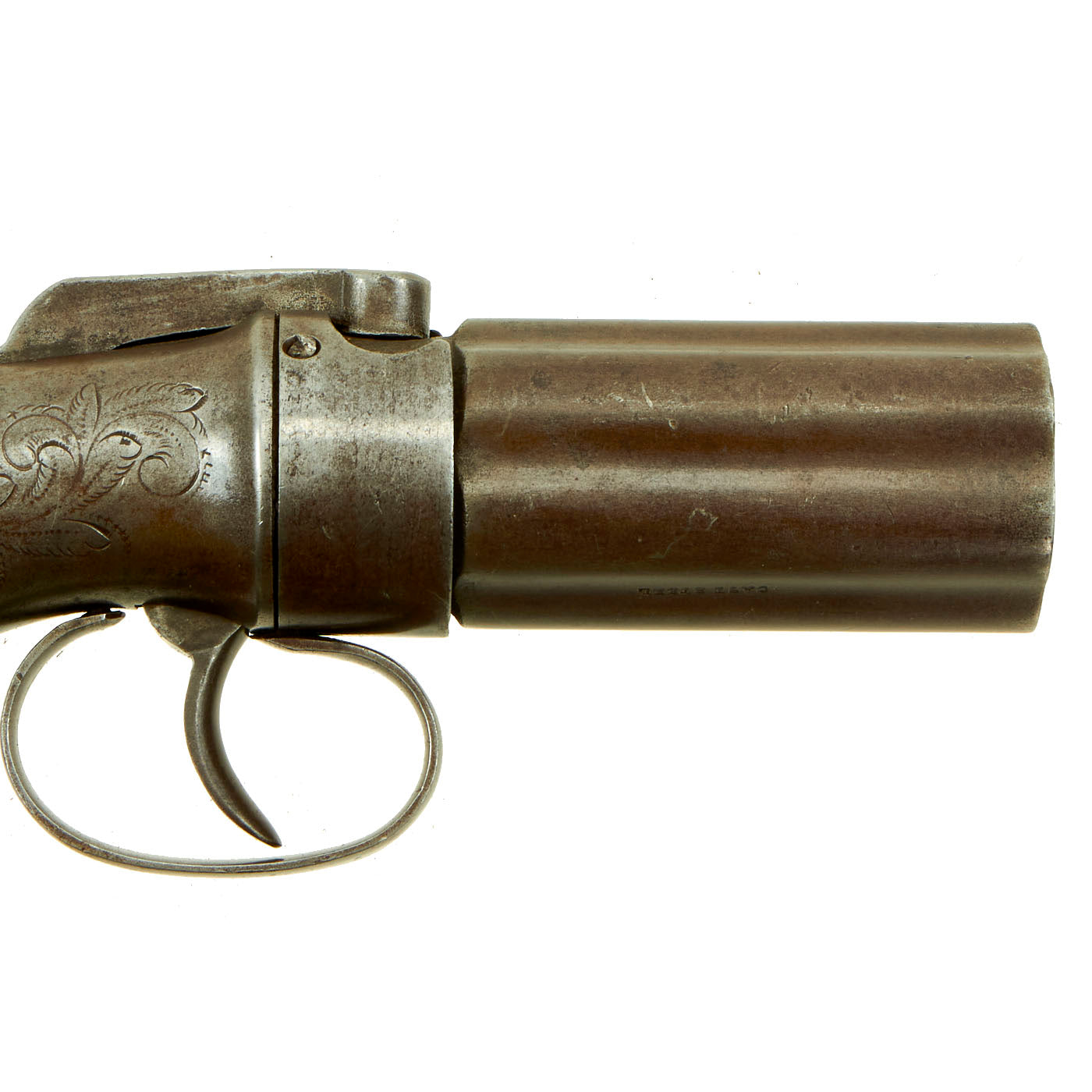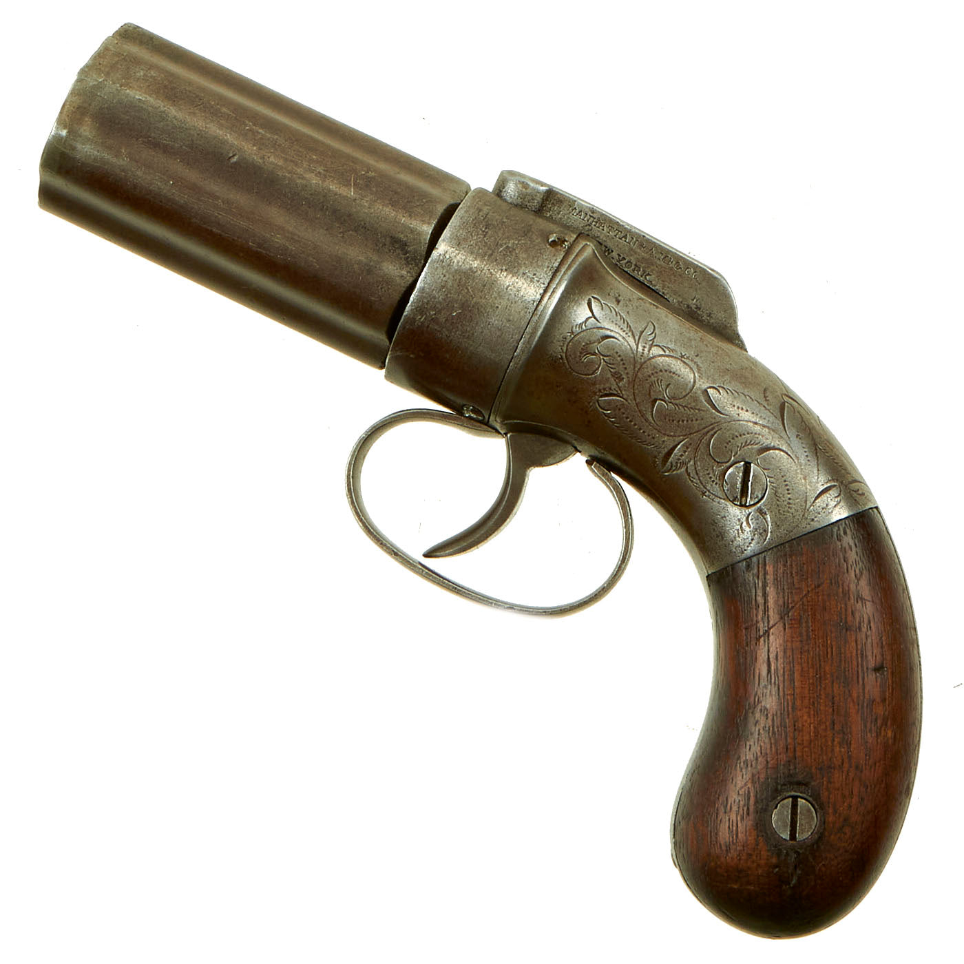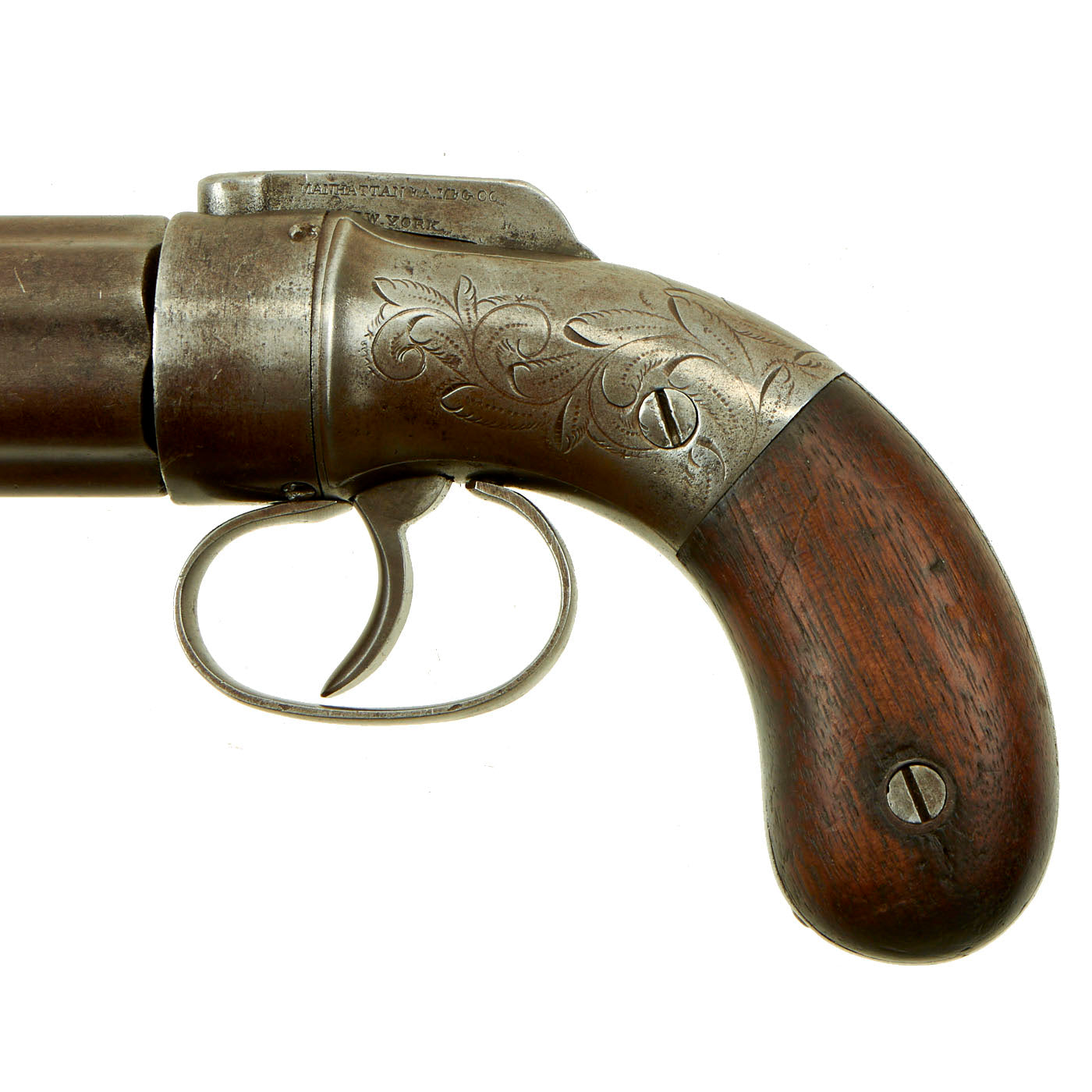 Original Item: Only One Available. Pepperbox revolvers were so named because of the similarity of the front view of the weapon was so reminiscent of a Pepper Pot of the time being a circle of round holes. This example was made by the Manhattan Firearms Manufacturing Company, which was founded by a group of businessmen in 1856, anticipating the expiration of many Colt revolver patents in 1857. Production began immediately at their factory in Norwich, Connecticut, and by 1859 they had moved to a new facility in Newark, New Jersey. While they were named Manhattan Firearms and used "NEW YORK" in their early address markings, the company was never actually based in New York, just as with Colt.