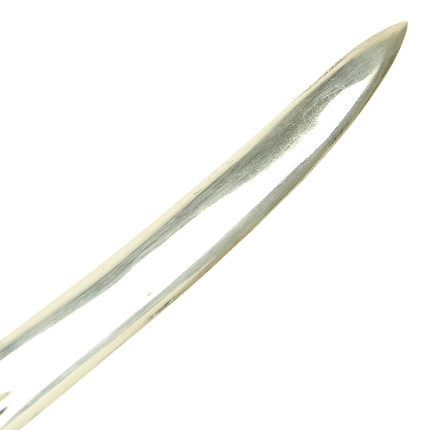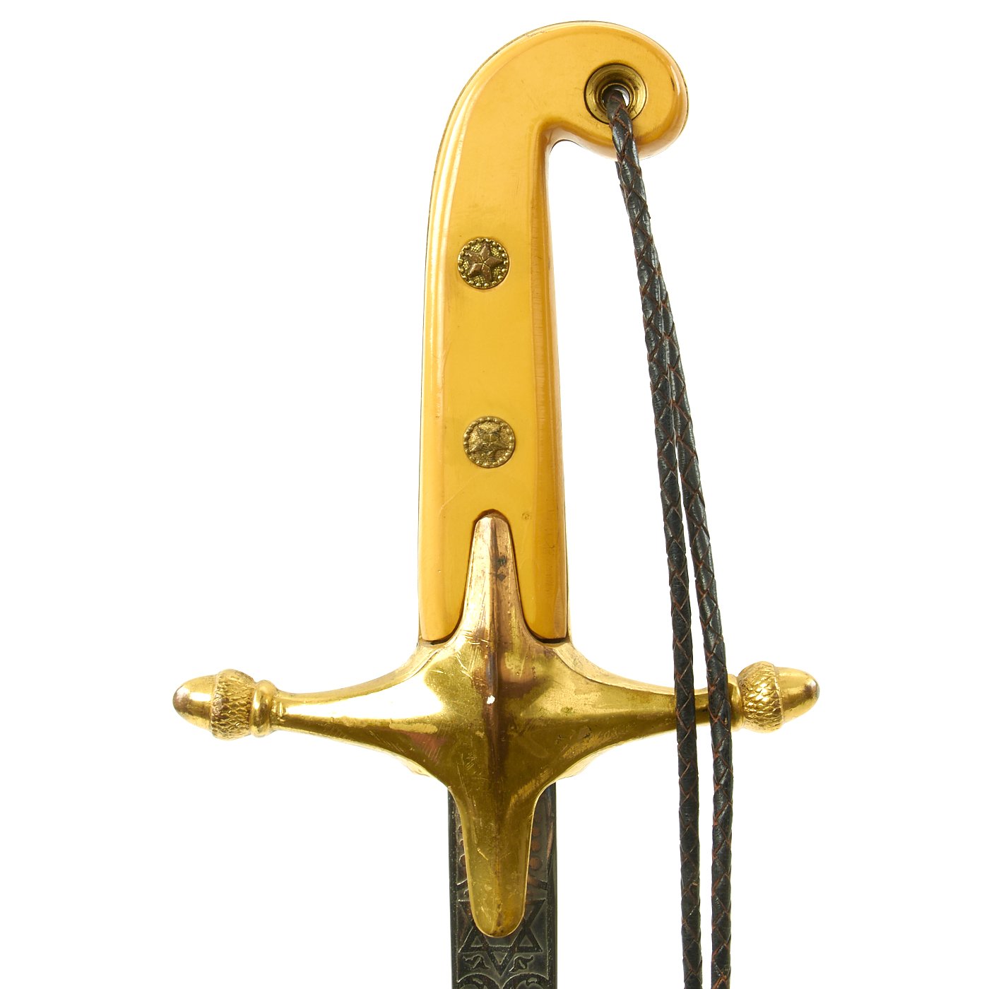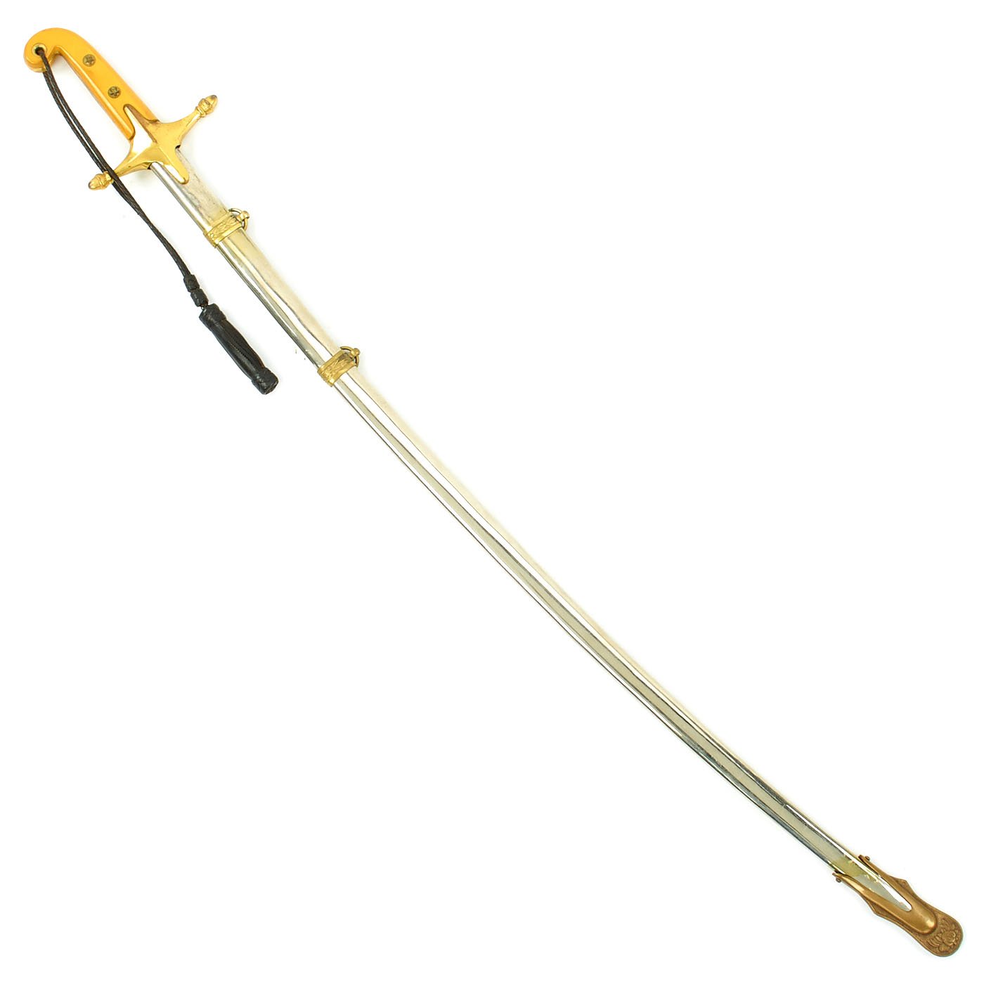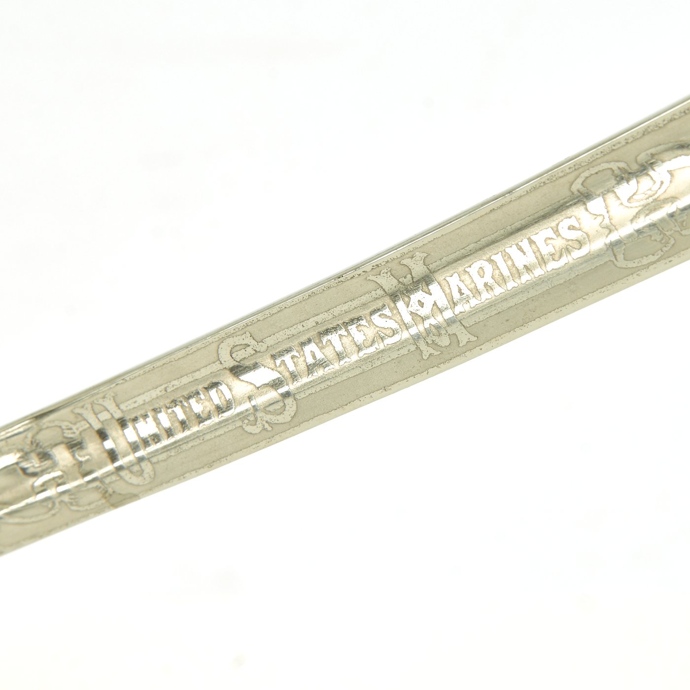 This WWII era USMC Officer's Mameluke sword with scabbard features handle grip scales that have yellowed with age but have no cracks or chips. Sword alone is approximately 37“ long overall and in scabbard is approximately 41“ overall. Blade is approximately 31" long, curved, and unsharpened. Blade is nickel-plated and has been etched on both sides with UNITED STATES MARINES and various other military motifs. The blade is also etched with the name K. E. Flake in Black Letter typeface on one side. Scabbard is is in great shape, with both of the original hanger rings, as well as the brass throat.
