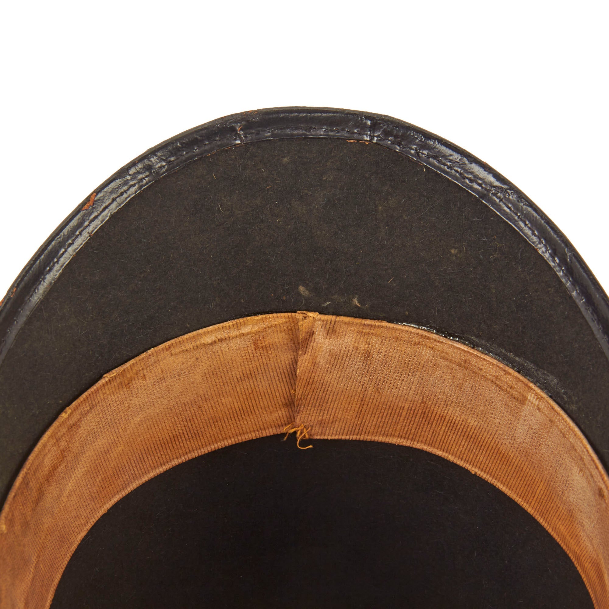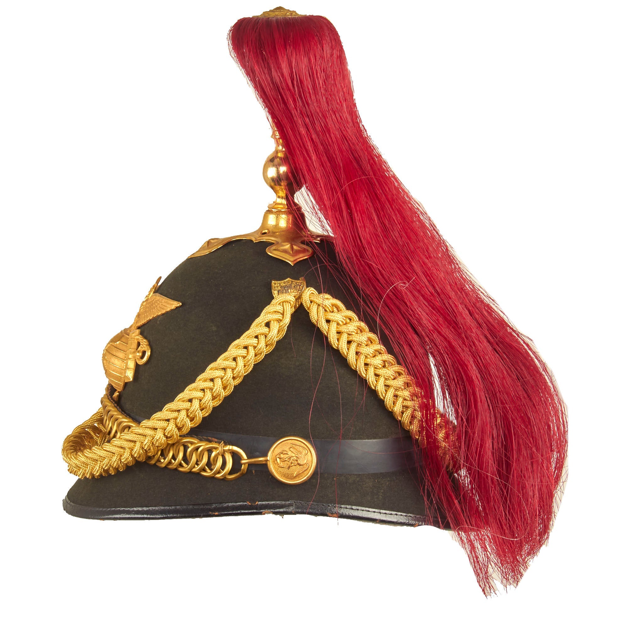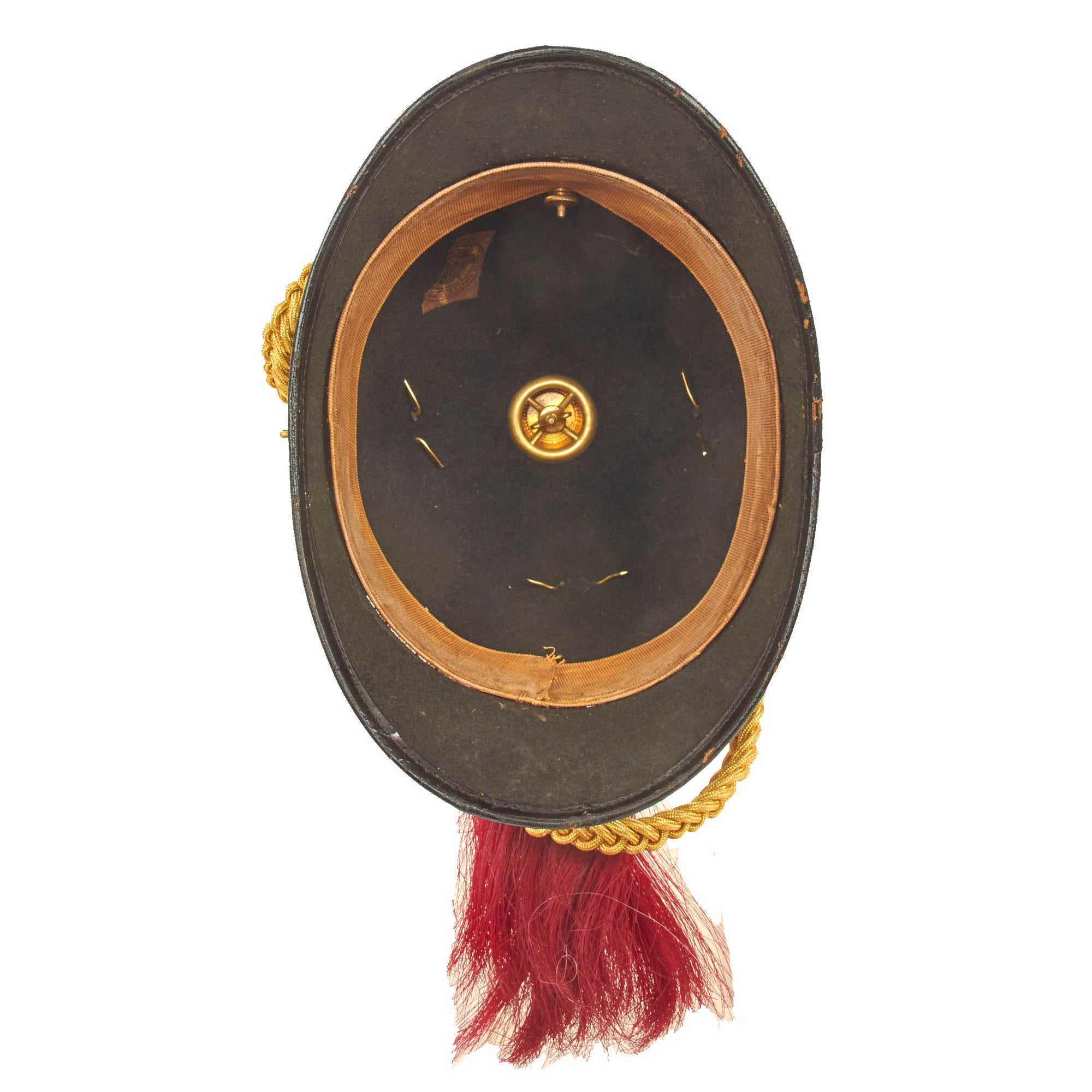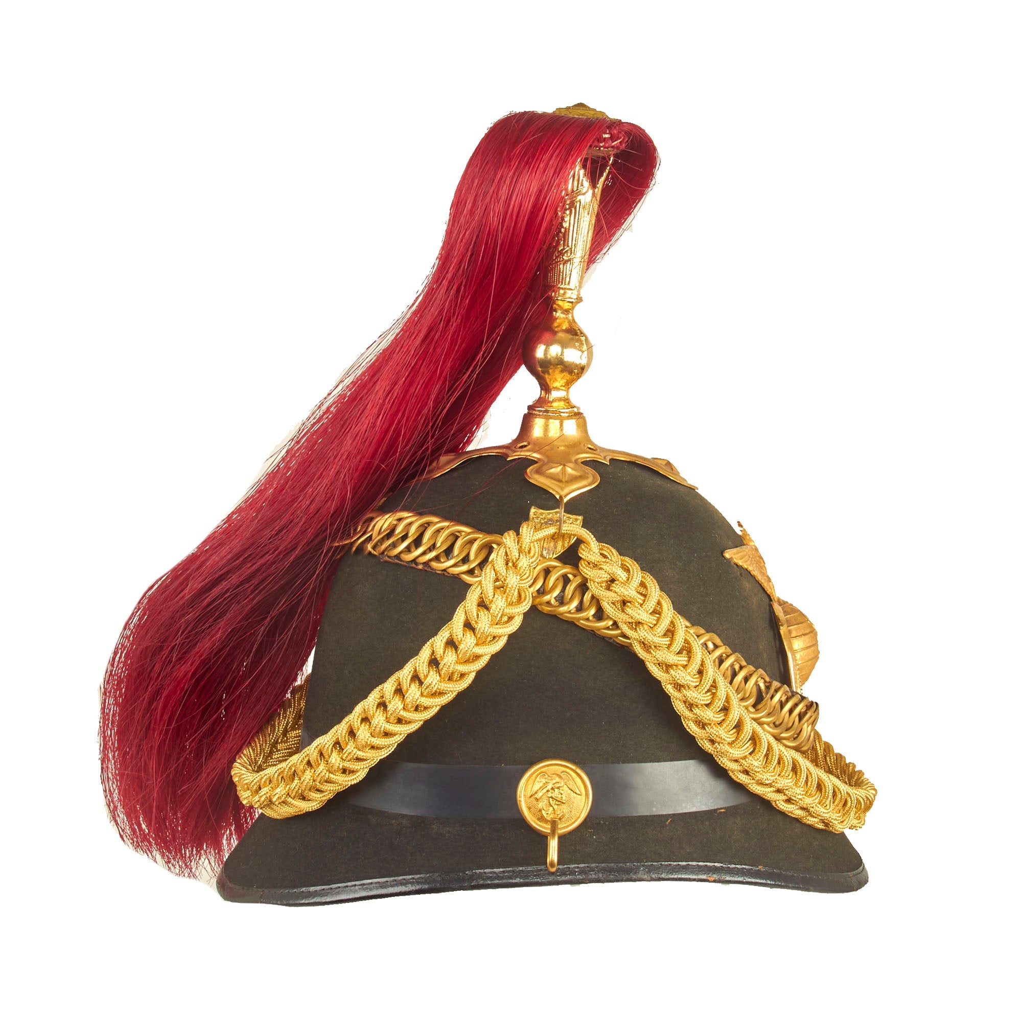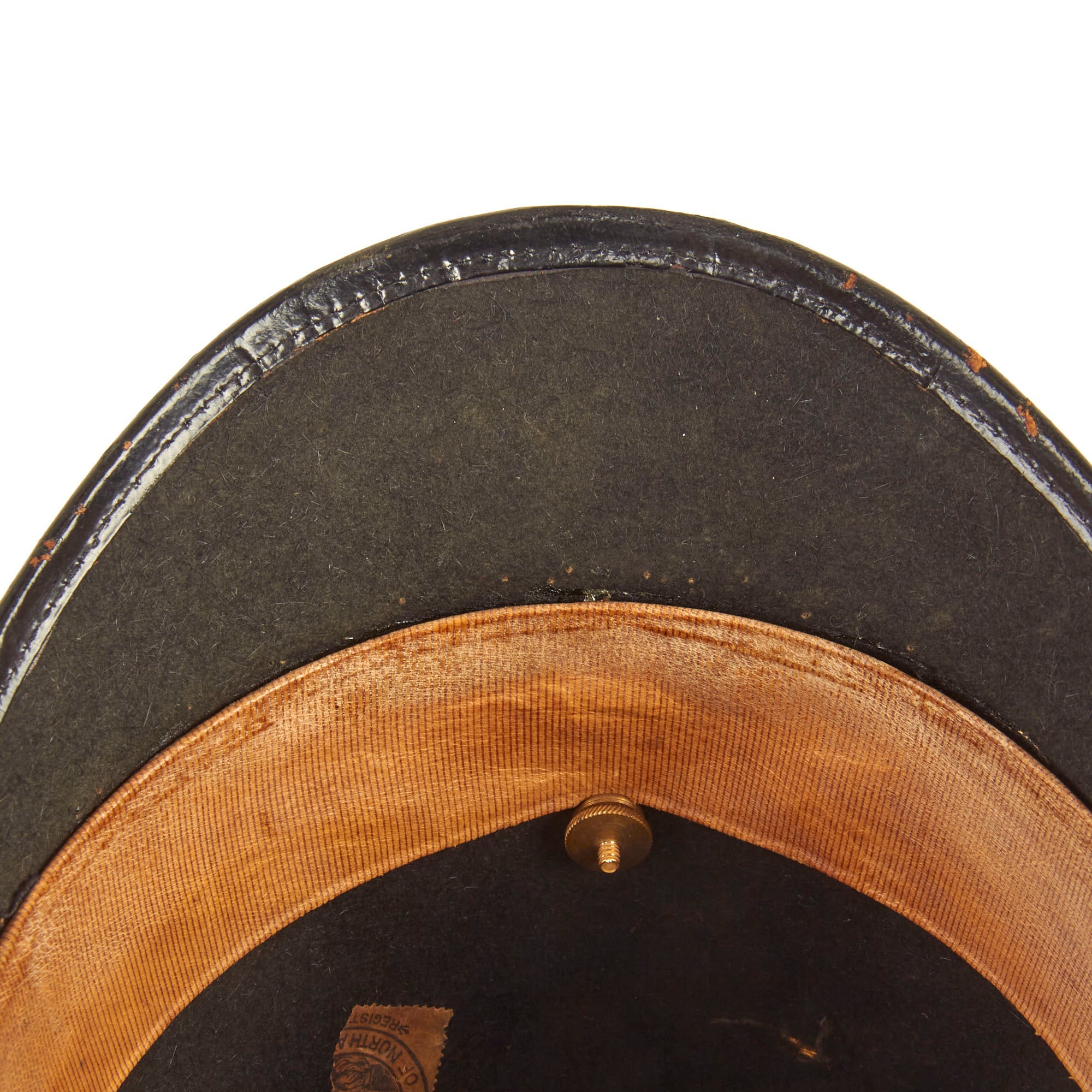 The original leather sweatband is still present, but was glued back into place by a previous inexperienced collector. The helmet overall does show quite a bit of use, and is somewhat delicate. The front and rear visor are not lined. The top spike is loose, as the threads on the cast metal top fitting have mostly stripped out. All components are original except for the plume holster stalk and gold bullion cordage.
