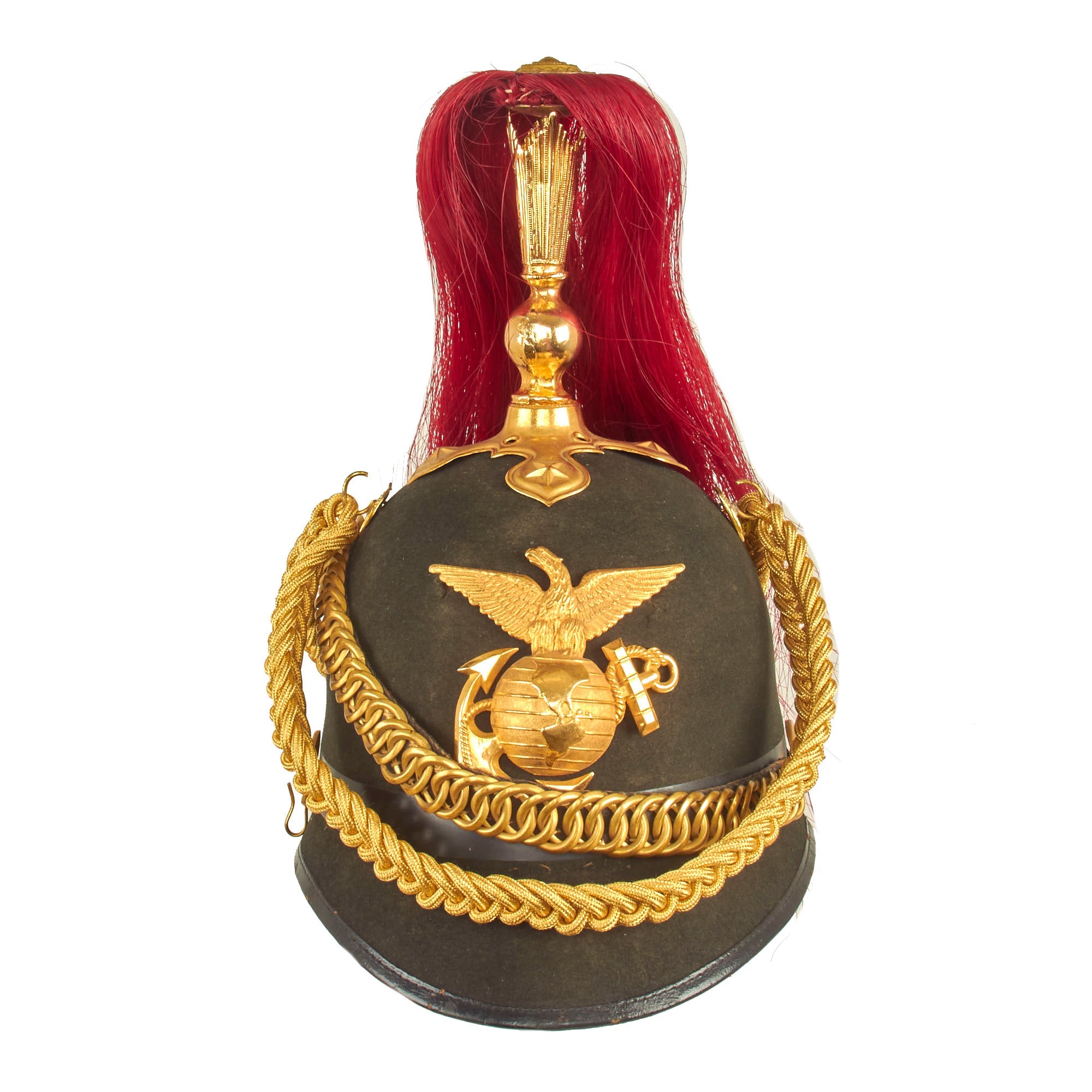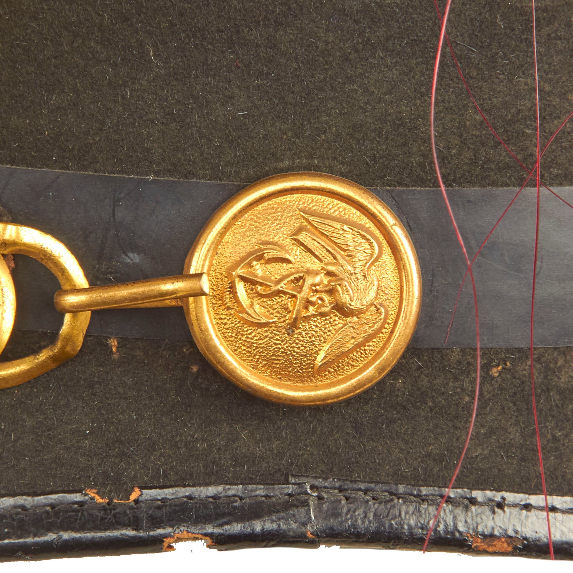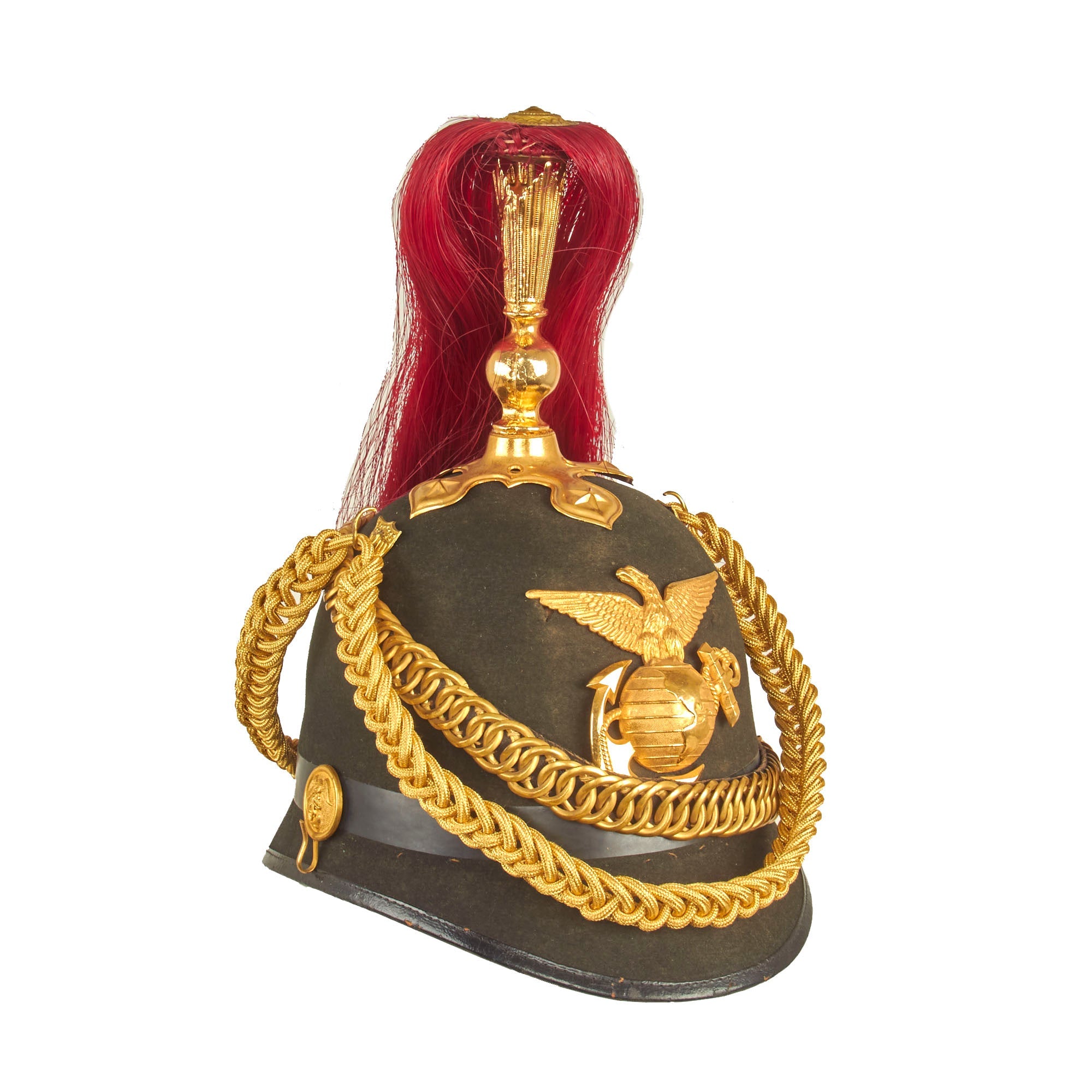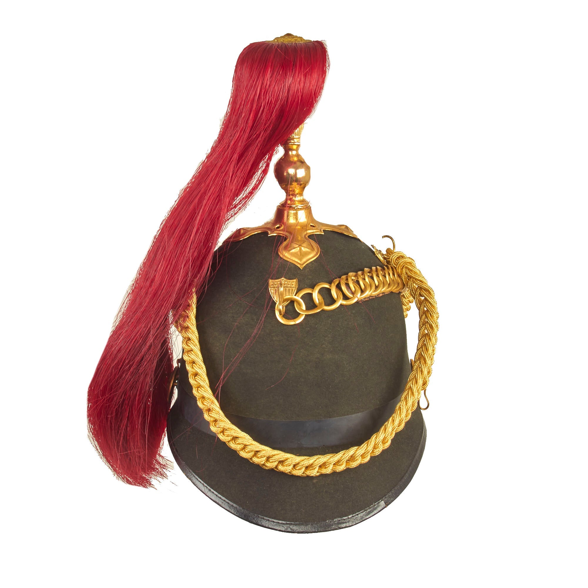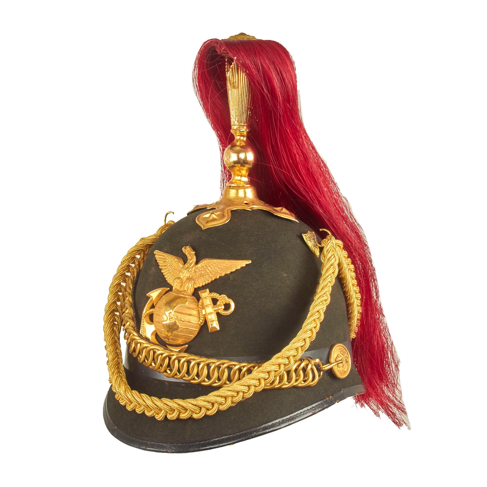 The original leather sweatband is still present, but was glued back into place by a previous inexperienced collector. The helmet overall does show quite a bit of use, and is somewhat delicate. The front and rear visor are not lined. The top spike is loose, as the threads on the cast metal top fitting have mostly stripped out. All components are original except for the plume holster stalk and gold bullion cordage.