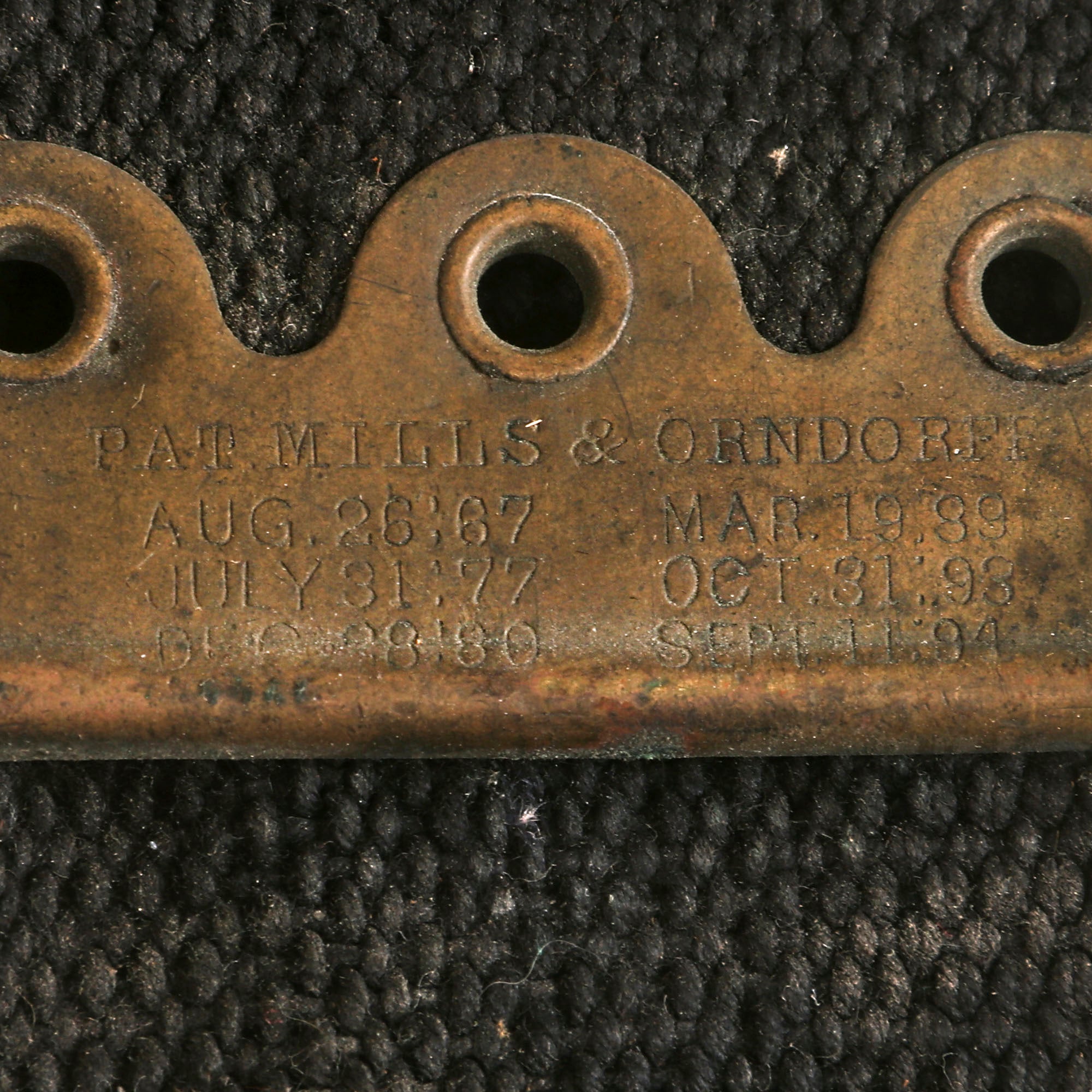 - Great Pattern 1894 .38 Caliber Mills Cartridge Belt. Number 24 is painted on the interior side. Endpiece has patent information for Mills & Orndorff up to 1894. Belt does not have a buckle which from what we can find, was the way they were meant to be worn, attaching via a C-shaped bar like this one. A very interesting and scarce belt. The belt is “mounted to a board with thin wire which reads MARINE CORPS PISTOL BELT but this will not work well to display it long-term.