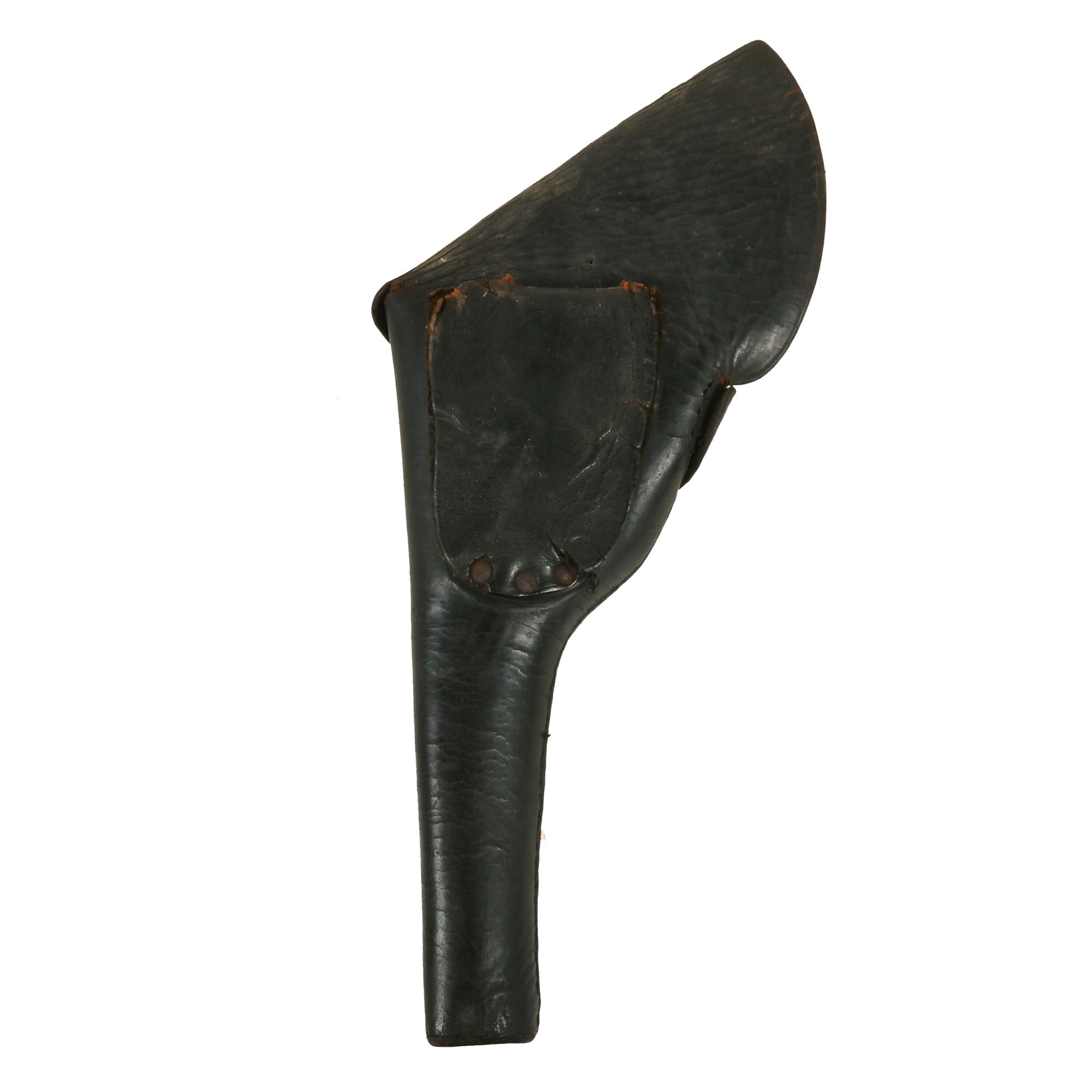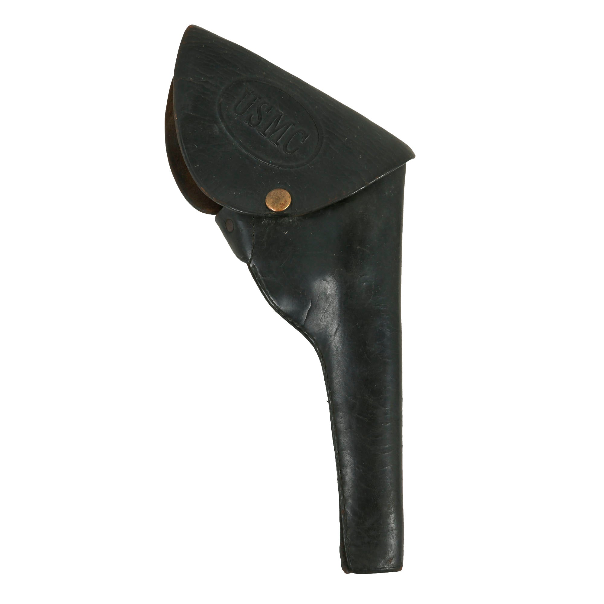 - First Pattern Colt Model 1905 Marine Corps Revolver Holster. Now THESE are EXTREMELY rare! This is a very nice leather flap holster for the Colt Model 1905 Marine Corps .38cal revolver. This was a variation of the Colt M1892 with a rounded grip frame, only issued by the United States Marine Corps during the period from 1905 to 1909. Only a very small number (less than 850) are known to have been issued under military contract. Less than 1000 of these holsters were EVER made! The survival rate of the holsters is very low, and we have only ever seen a few! That’s on top of it being attributed to a Marine. This example is of the First pattern made, with the male snap on the top flap. It has the correct brass snaps with the proper iron rivets in the back retaining the belt loop. Condition is good, though it was finished black at some point, probably post manufacture. It still has a clear USMC inside an oval on the top flap. Some of the stitching is loose but otherwise a great example.