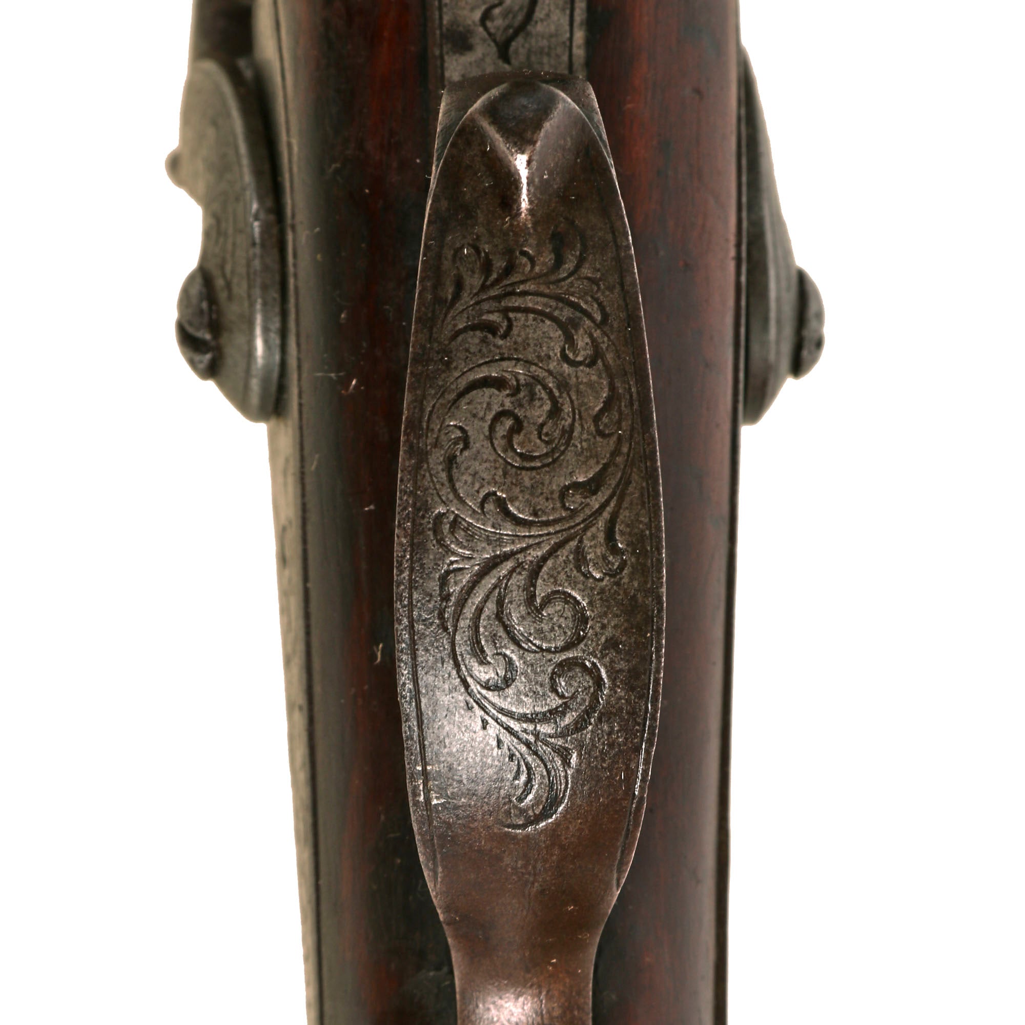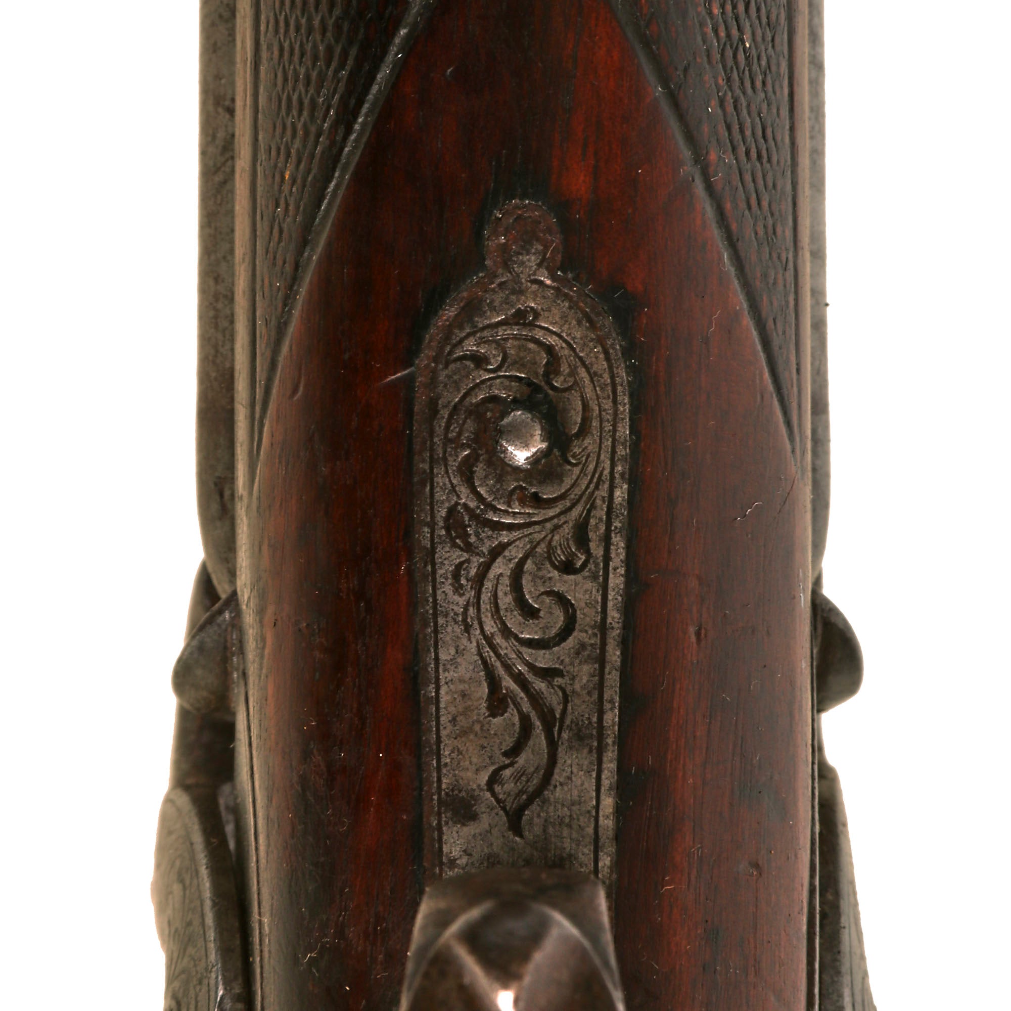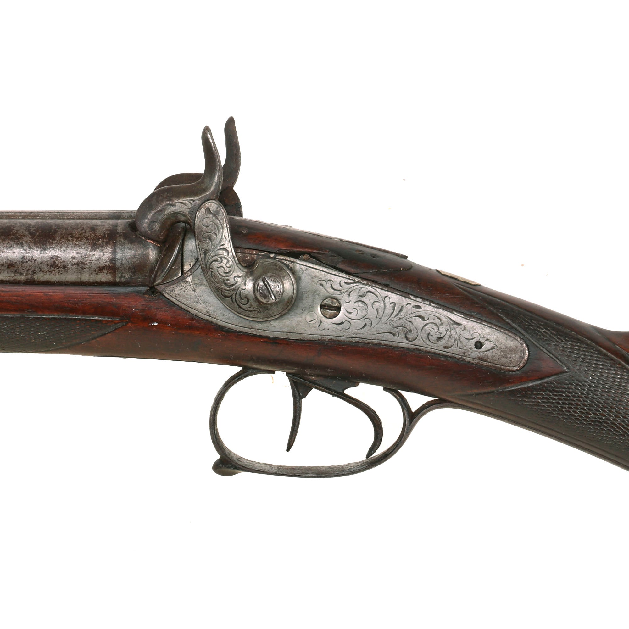 Overall condition is good, with strong checkering around the wrist and forearm areas, and and a great used look. The stock has a lovely color, and the carving on the bottom of the butt stock is still very crisp. There is a bit of wood missing to the rear of the left lock plate, and there has been a repair there in the past. The metalwork is in very good shape, still showing lots of the original engraving, and the finish has matured to a lovely polished patina from years of cleaning. Both locks function, however only the right side holds at half cock, probably due to wear on the tumblers. The cap nipple cones look to be original, and show oxidation and wear from use, with the left cone being partly broken off.