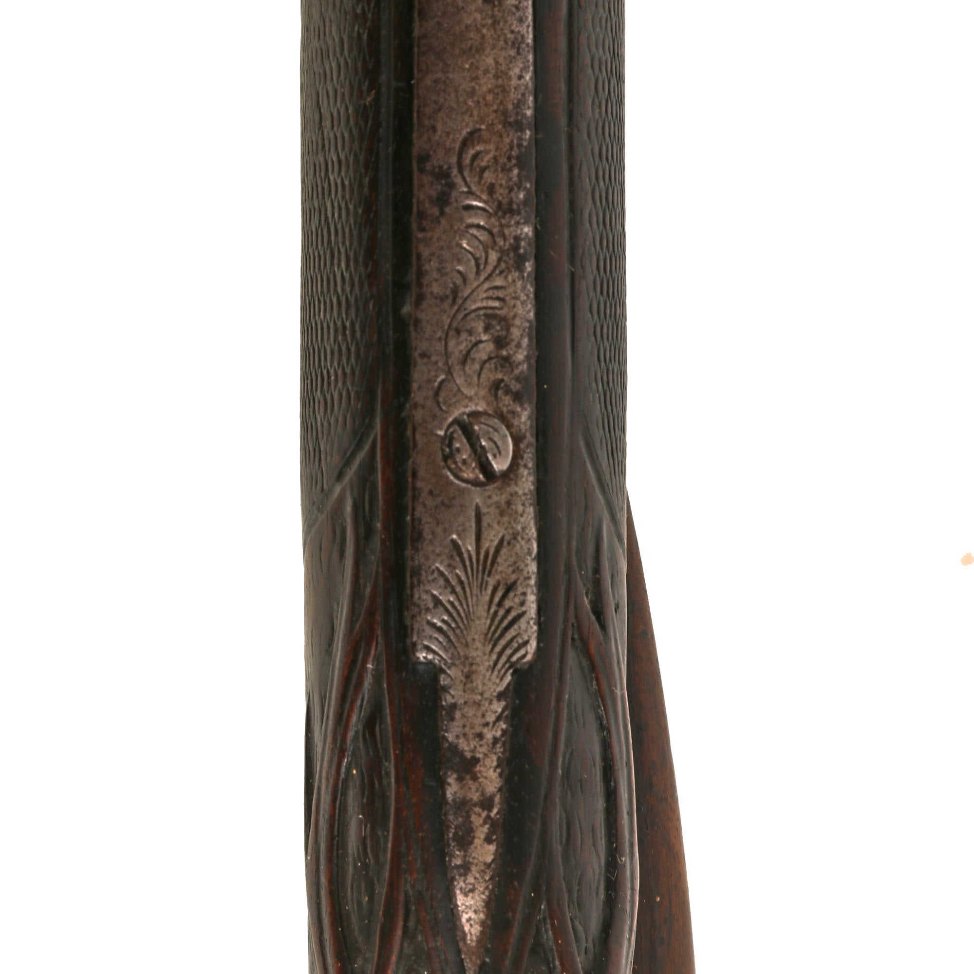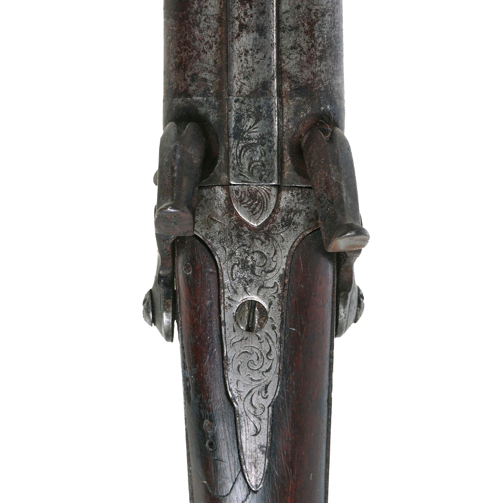 The gun has an overall length of 49 inches, with double 32 ¾ inch barrels, and as mentioned previously, there are no external markings. We can see however a spiral pattern on the barrel, which indicates that it was "spiral" or "twist" forged. This method of barrel production resulted in stronger steel. The barrel wedge comes out somewhat easily, though it can be difficult to put back into place, as there is a good amount of oxidation on the bottom of the barrel under the stock.