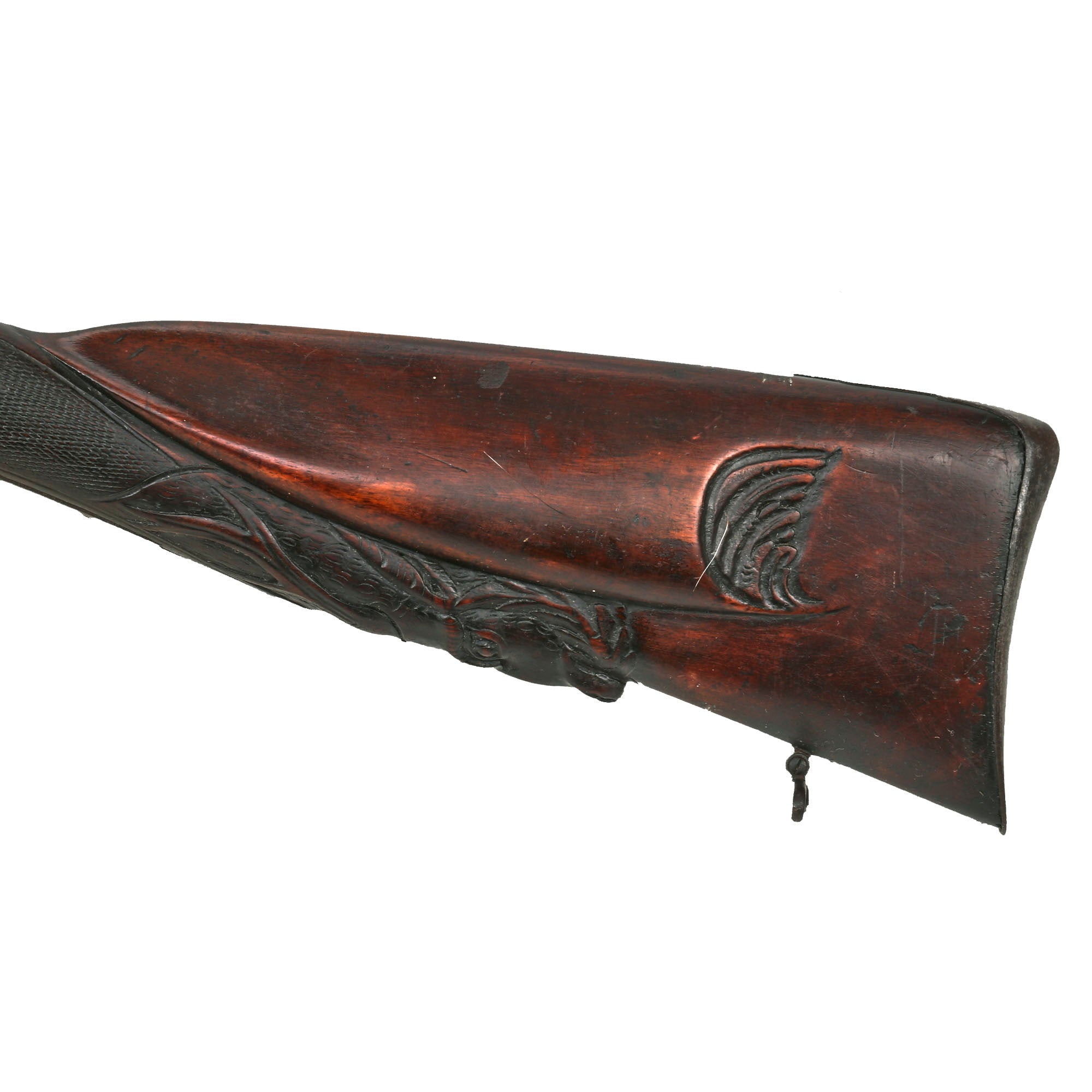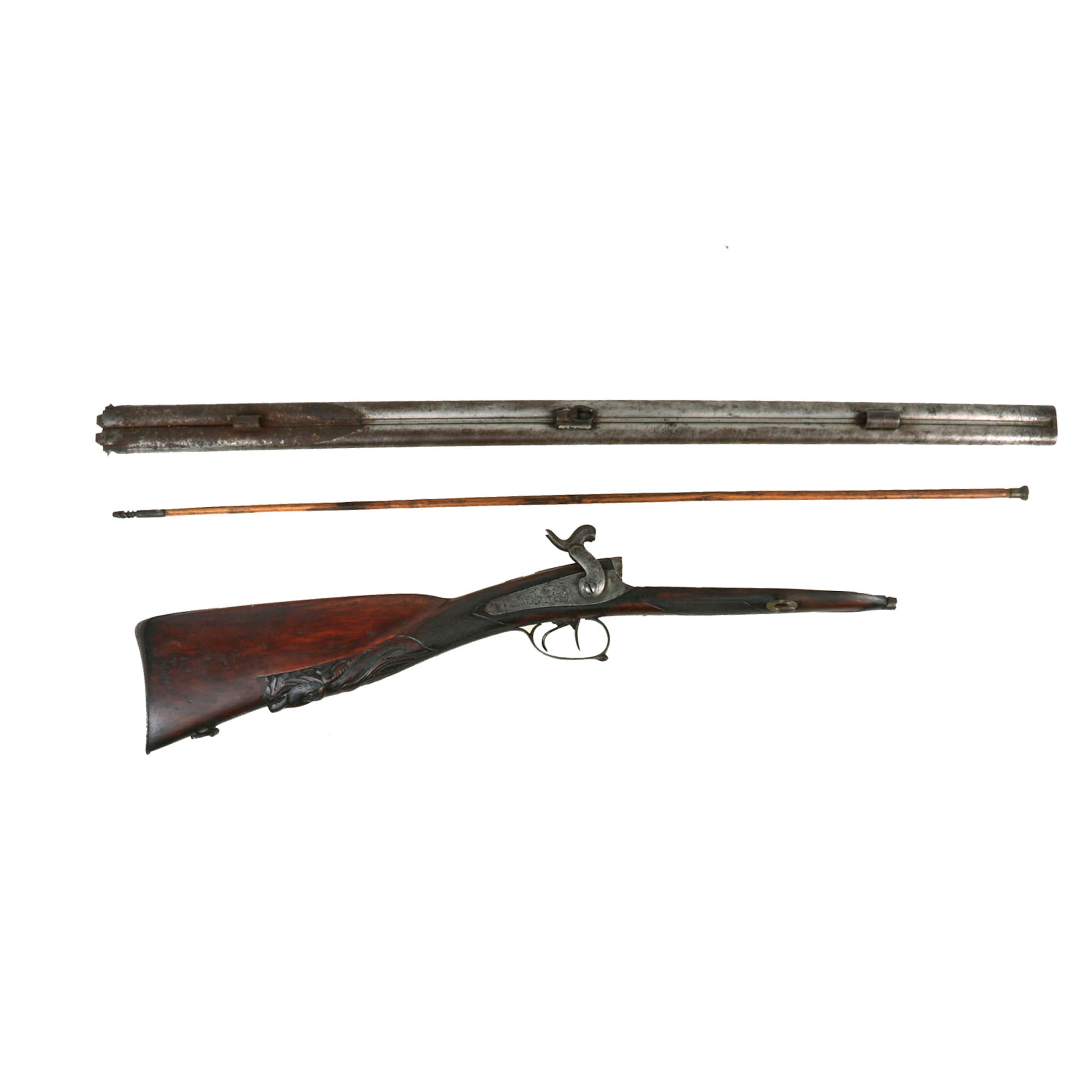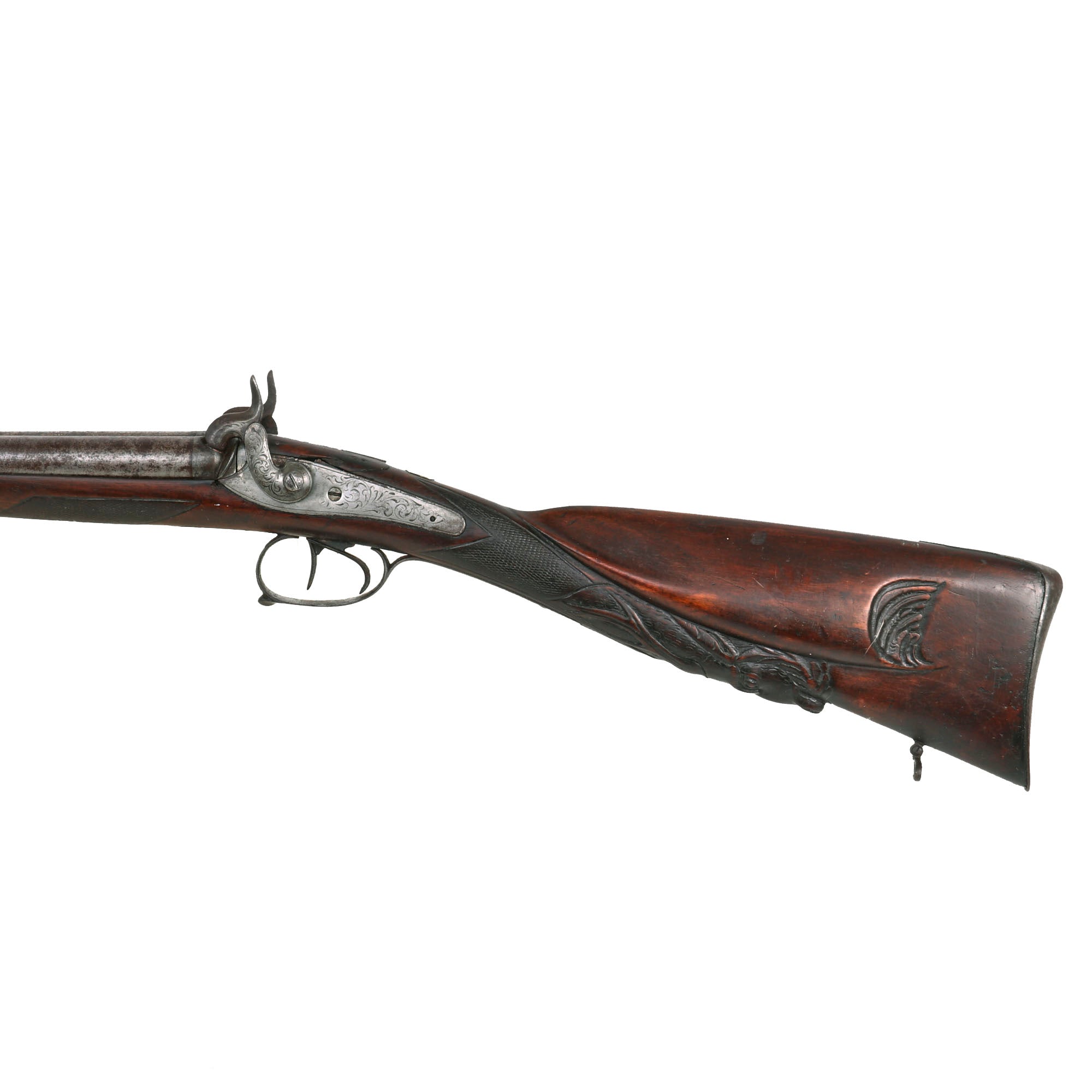 Original Item: Only One Available. This lovely Belgian-made 16 bore fowling piece / shotgun is unsigned on the exterior, but is most likely intended for the U.S. Frontier market, which was booming during the 1850s. Domestic production could not keep up with the demand, so fowlers were imported in some quantities from Europe. The fowling piece features all iron mounts with some lovely foliate engraving, and there has been a good amount of wear on the barrel and locks, which may have removed any markings that were present. It also has a fantastic carved butt stock, with a lovely cheek piece, and a carved stag's head on the bottom, which is highly stylized.