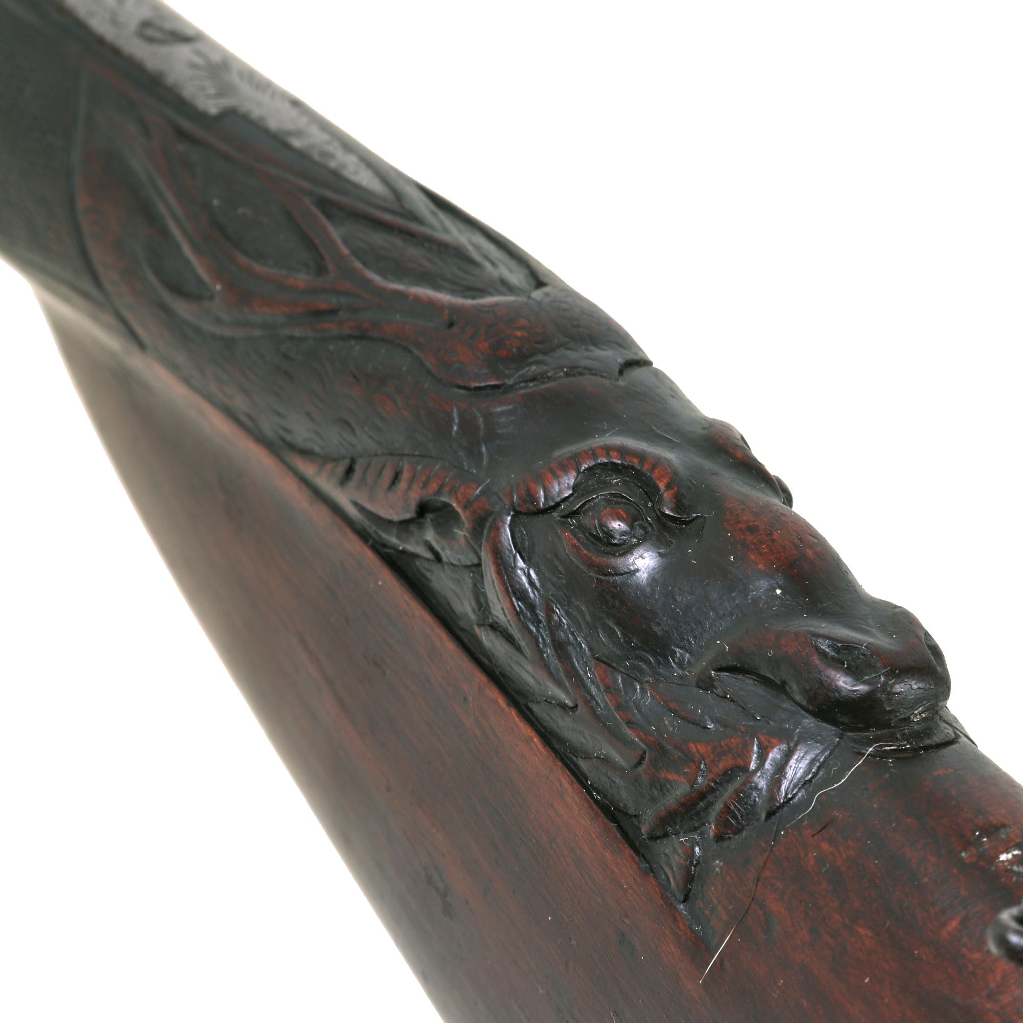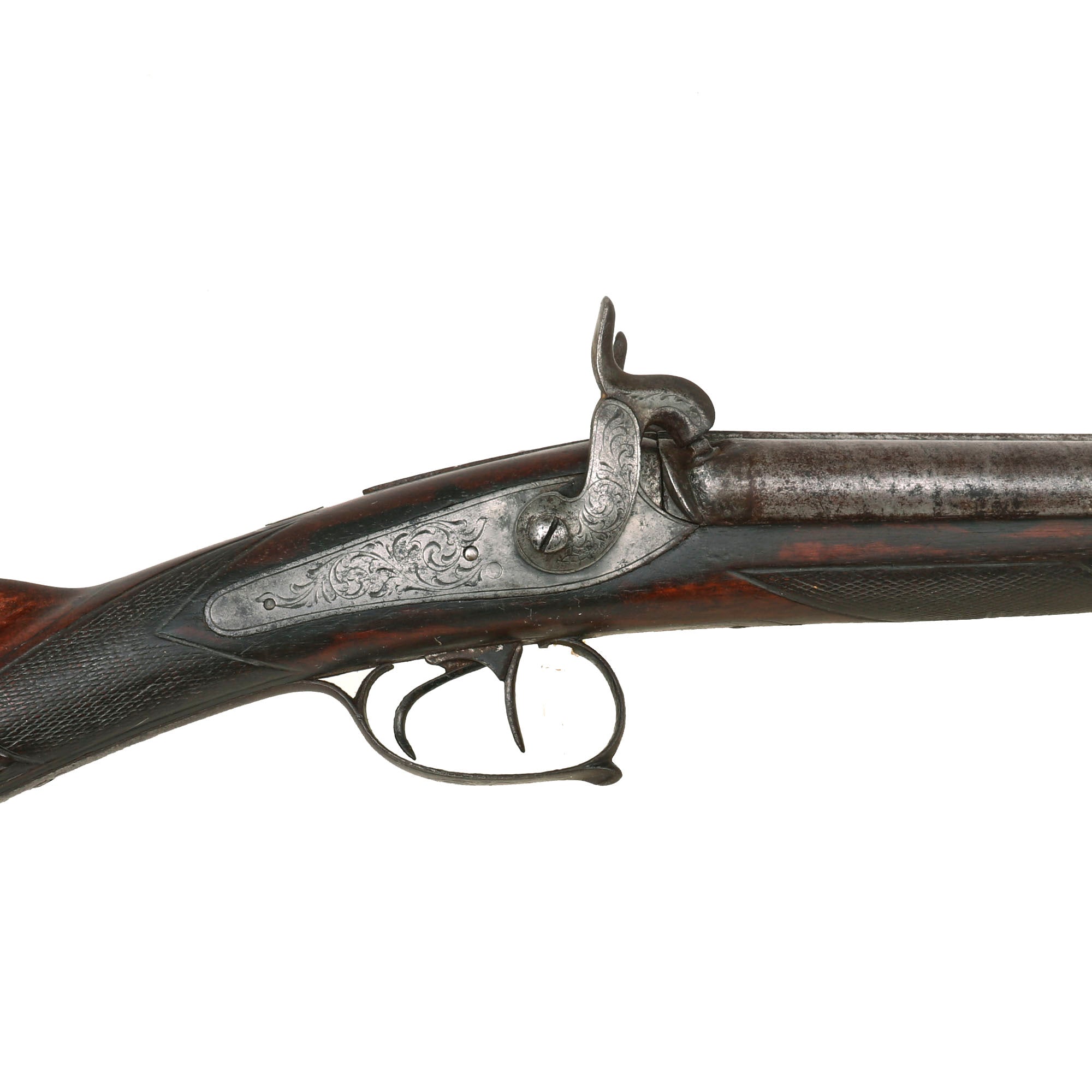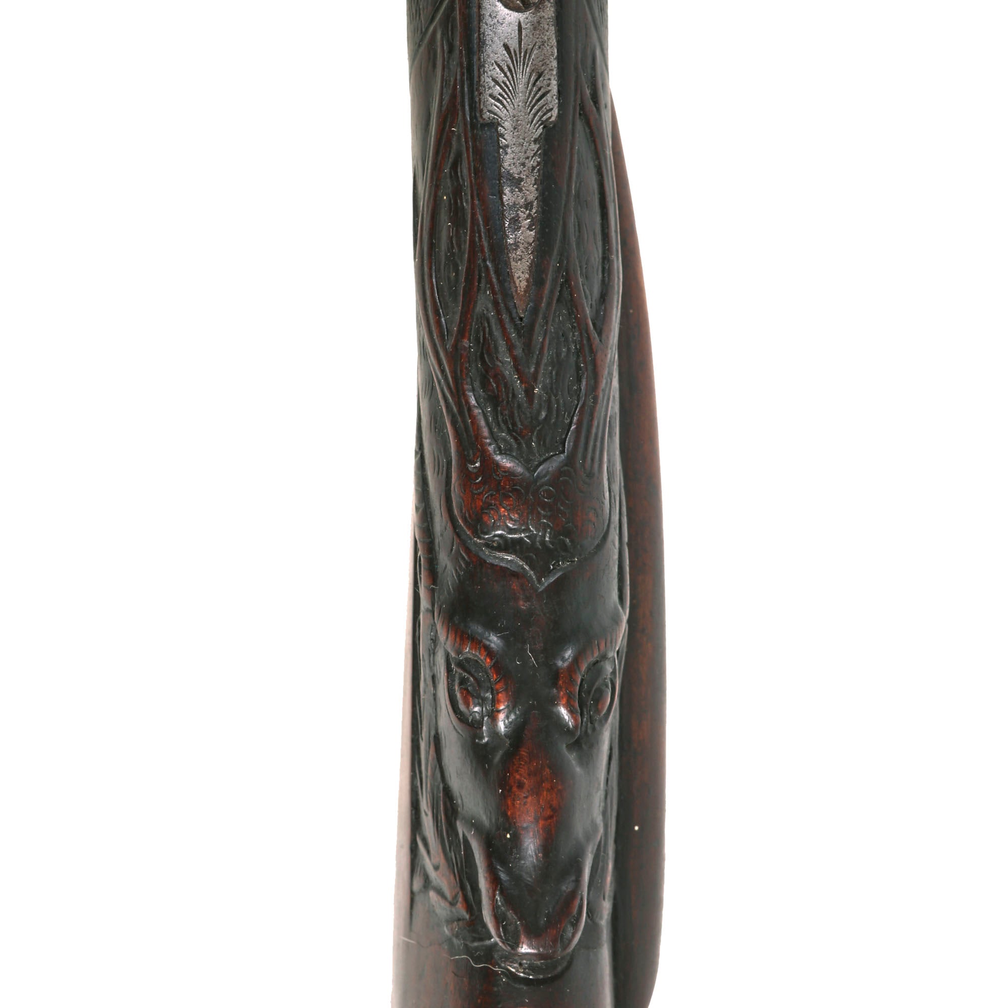 Original Item: Only One Available. This lovely Belgian-made 16 bore fowling piece / shotgun is unsigned on the exterior, but is most likely intended for the U.S. Frontier market, which was booming during the 1850s. Domestic production could not keep up with the demand, so fowlers were imported in some quantities from Europe. The fowling piece features all iron mounts with some lovely foliate engraving, and there has been a good amount of wear on the barrel and locks, which may have removed any markings that were present. It also has a fantastic carved butt stock, with a lovely cheek piece, and a carved stag's head on the bottom, which is highly stylized.