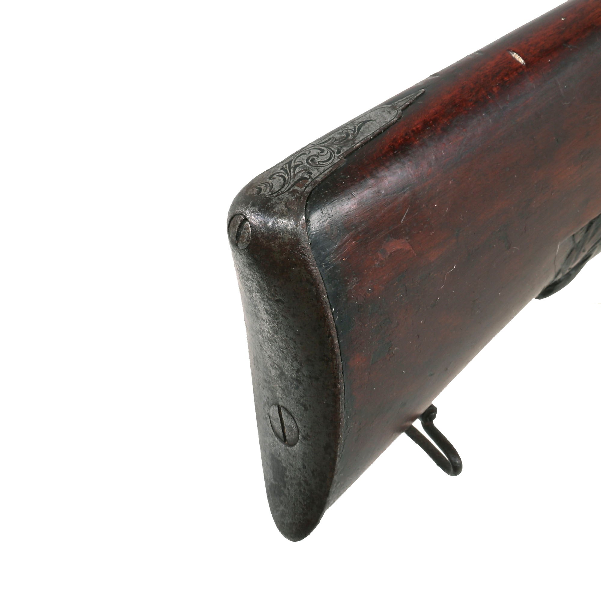 The gun comes with a lovely original brass and iron fit ramrod, which has a threaded "clearing worm" attachment on the inner end. We almost never see these with original rods, as they are often lost or acquired to use with other more modern arms.