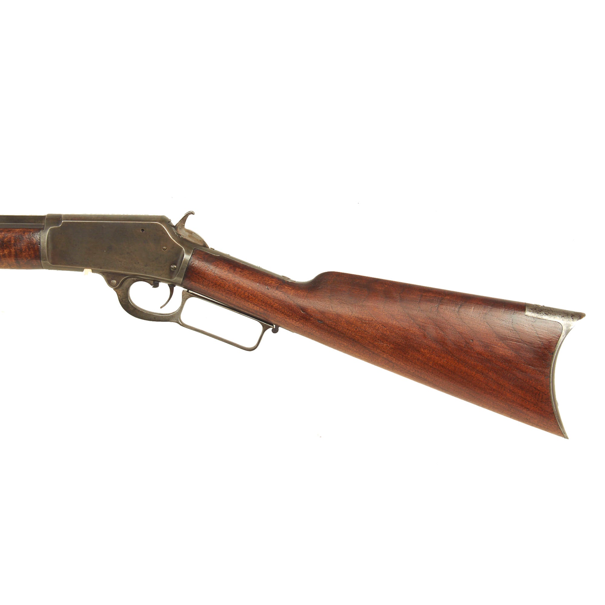 Rifles were fitted with "Rocky Mountain" sights made up of a German silver blade front sight and a semi-buckhorn-type rear sight, which could be elevated by a stepped elevator. The stock was straight-grained walnut with a steel-capped forearm and a crescent-style steel butt plate (carbines wore a carbine-style butt plate). Barrels and all hardware were blued, while the hammer, lever and butt plate wore the colorful Marlin case-hardening. The model also came as a short rifle, takedown model and musket.