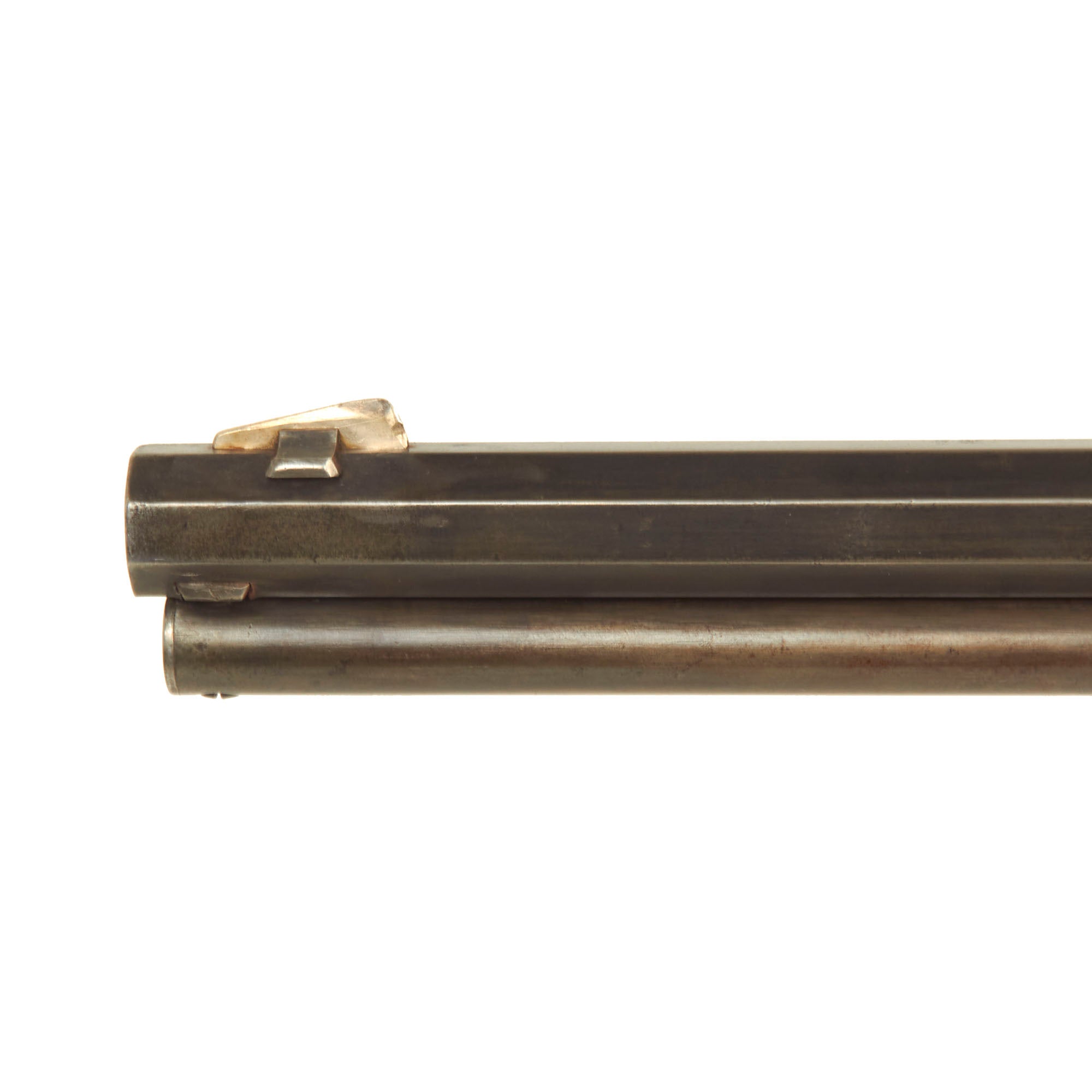 This classic '89 carbine example is in Winchester .32-20 caliber (marked 32-W over the Chamber), with a desirable 24" octagonal barrel with much original bluing still intact along with traces of case hardening in places. The rest is faded to a plum patina, with some areas of light peppering. The barrel is equipped with the classic "Buckhorn" rear adjustable front sight, and a large blade front sight, which may have a replacement blade installed. The top of the barrel engraving is still clear: