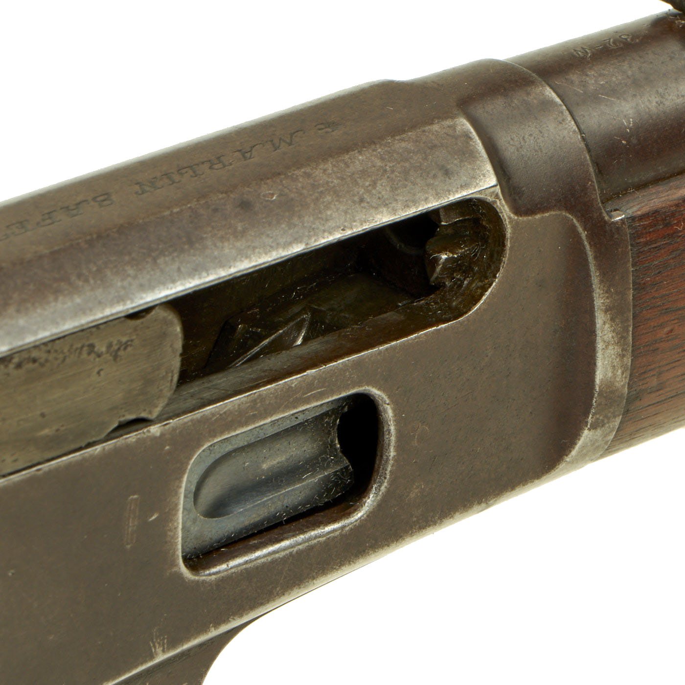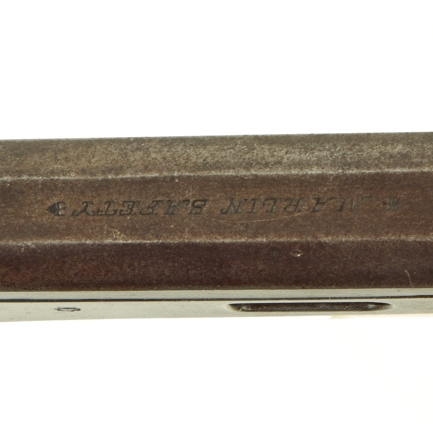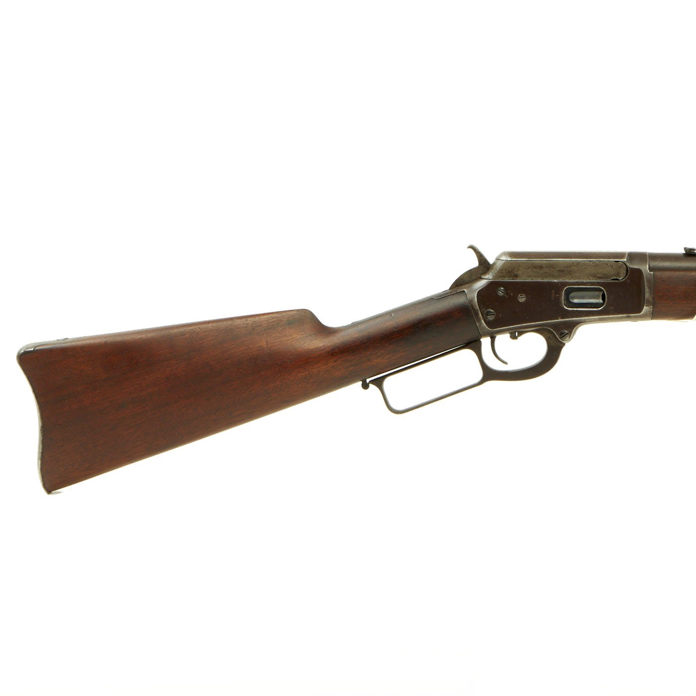 Rifles were fitted with "Rocky Mountain" sights made up of a German silver blade front sight and a semi-buckhorn-type rear sight, which could be elevated by a stepped elevator. The stock was straight-grained walnut with a steel-capped forearm and a crescent-style steel butt plate (carbines wore a carbine-style butt plate). Barrels and all hardware were blued, while the hammer, lever and butt plate wore the colorful Marlin case-hardening. The model also came as a short rifle, takedown model and musket.