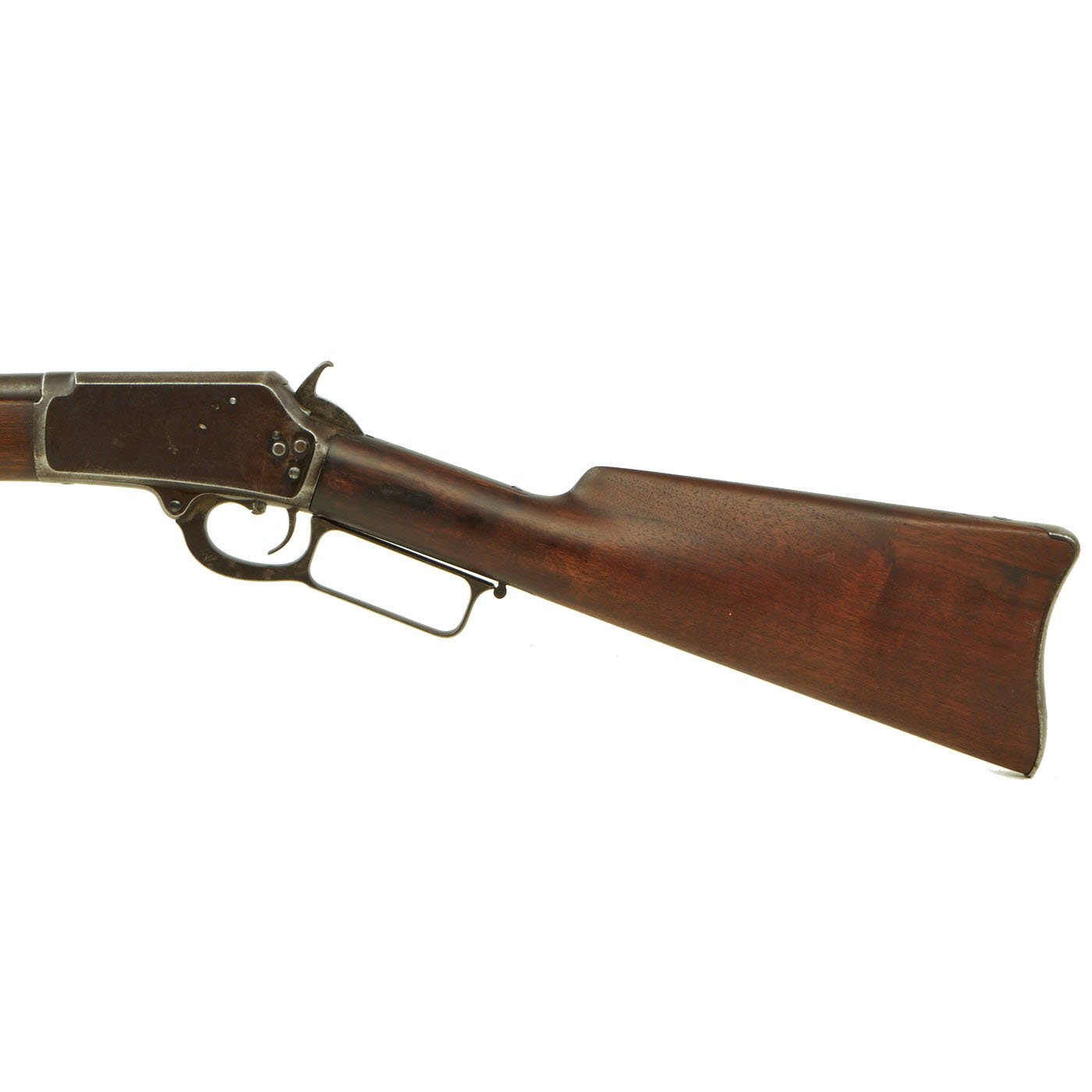 This classic '89 carbine example is in Winchester .32-20 caliber (marked 32-W over the Chamber), with a 20" round barrel with much original bluing still intact along with traces of case hardening in places. The rest is faded to a plum patina, with some areas of light peppering The top of the barrel engraving is clear: