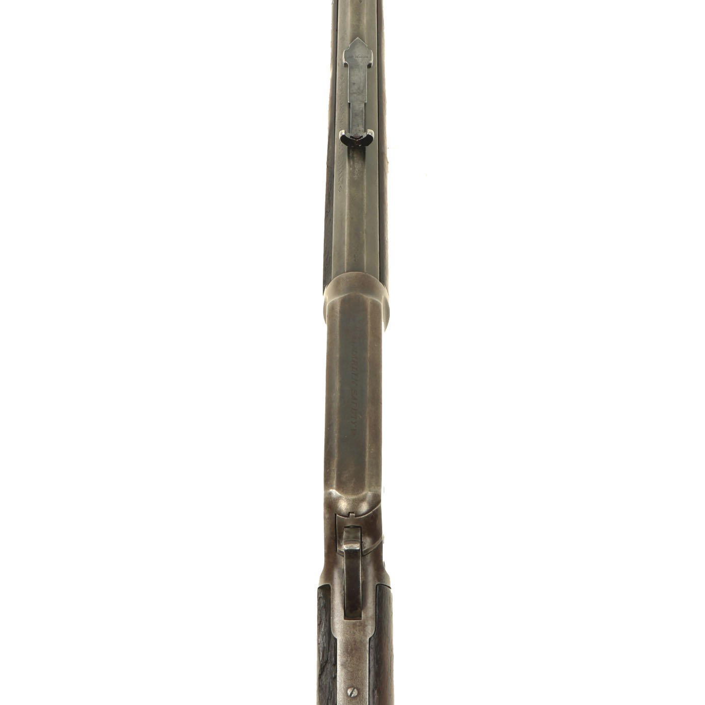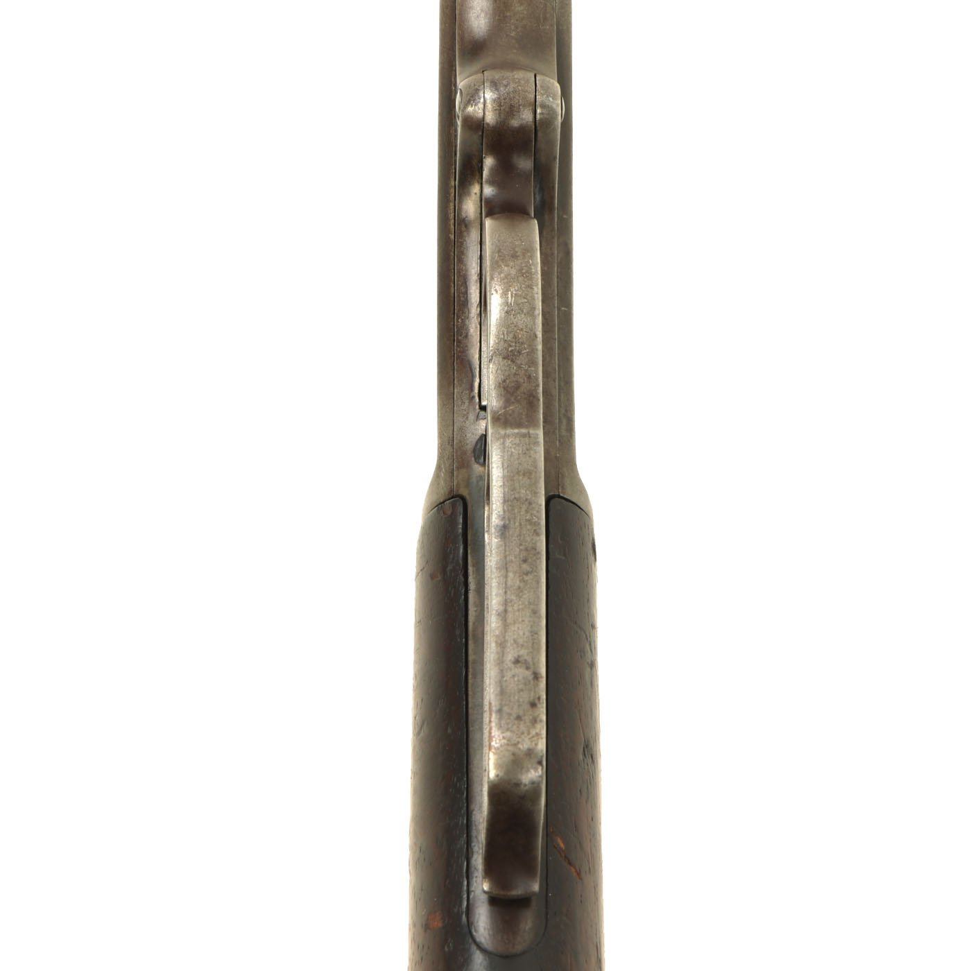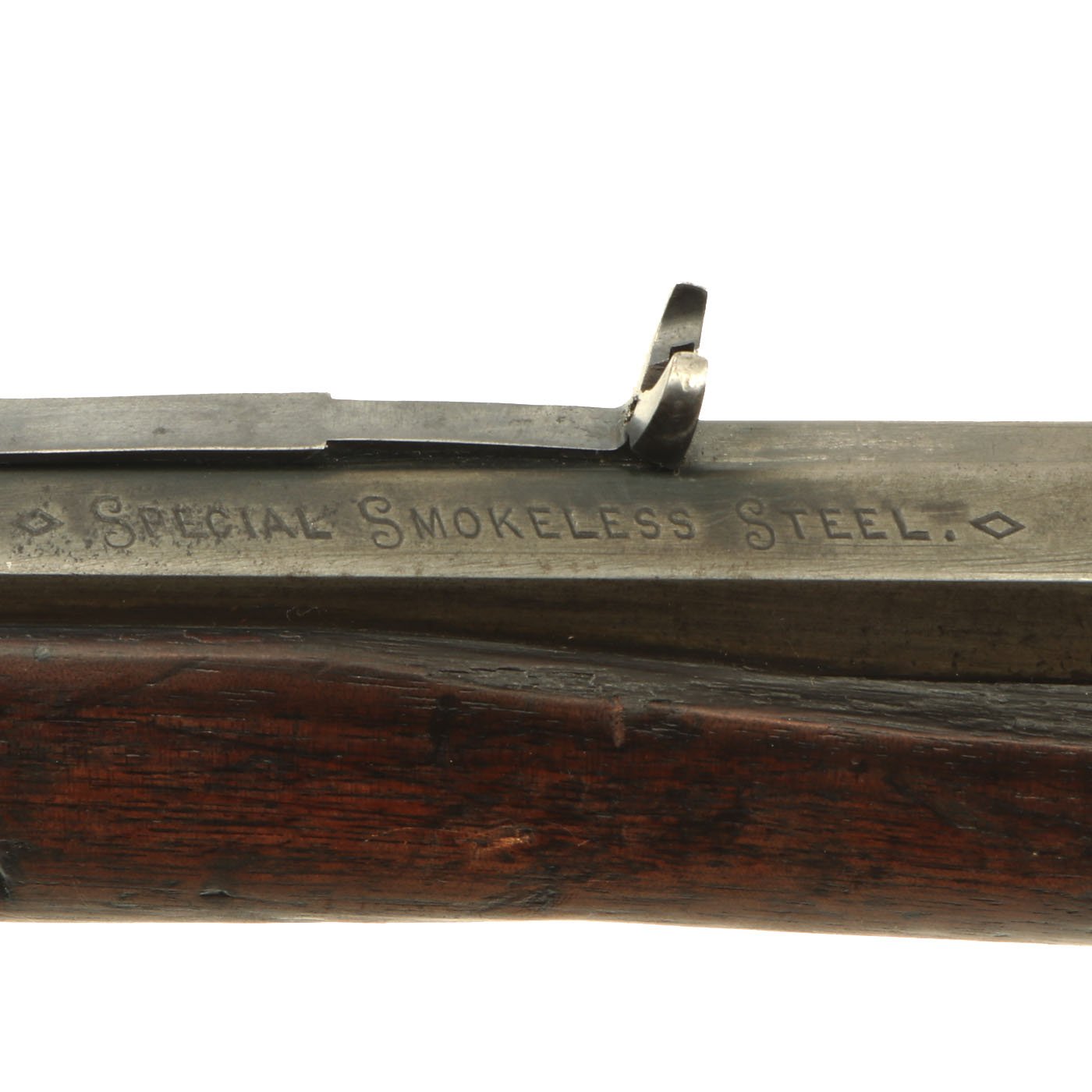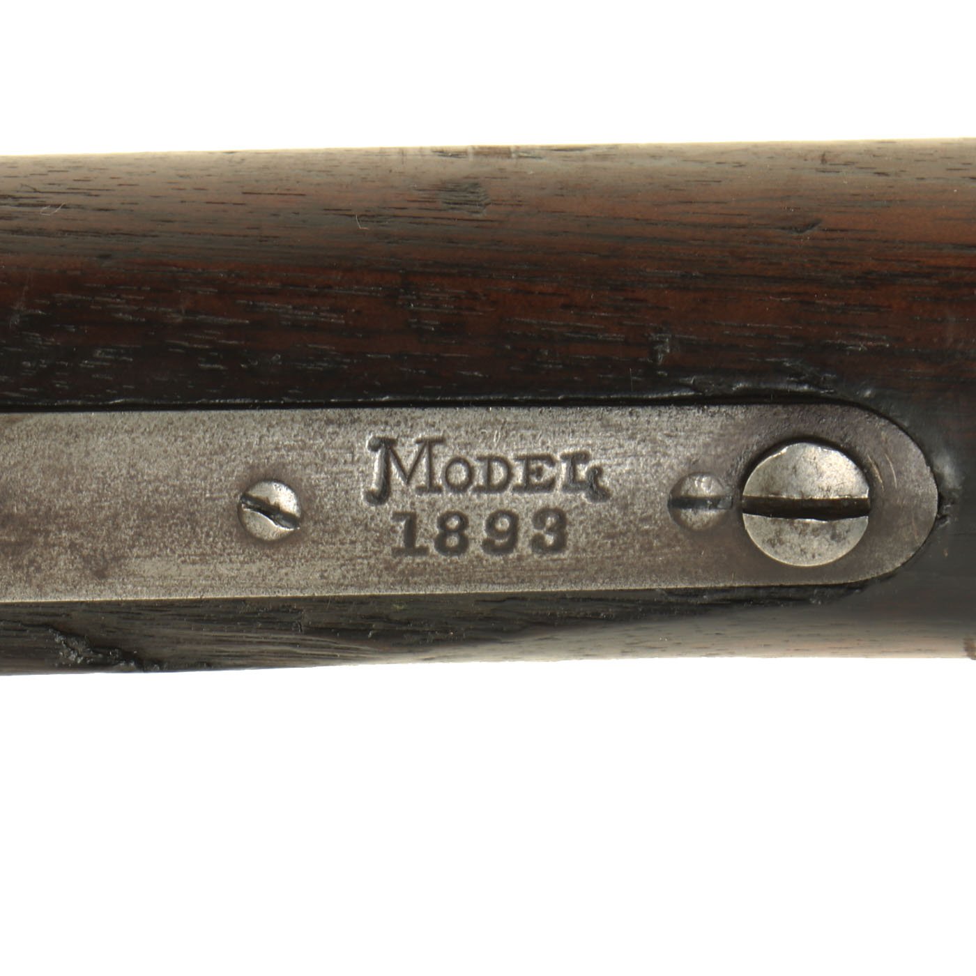 This classic '93 example is in .30-30 Winchester caliber (marked 30-30 over the Chamber), with a 26" octagonal barrel with some original bluing still intact along with traces of case hardening in places. The model 1893 was a refinement of the earlier "New Safety" Model 1889, which was he first solid-top receiver, lever action rifle with a side ejection that threw the fired cases, or live cartridges, to the right-hand side of the rifle as opposed to being thrown straight up and out of the gun.