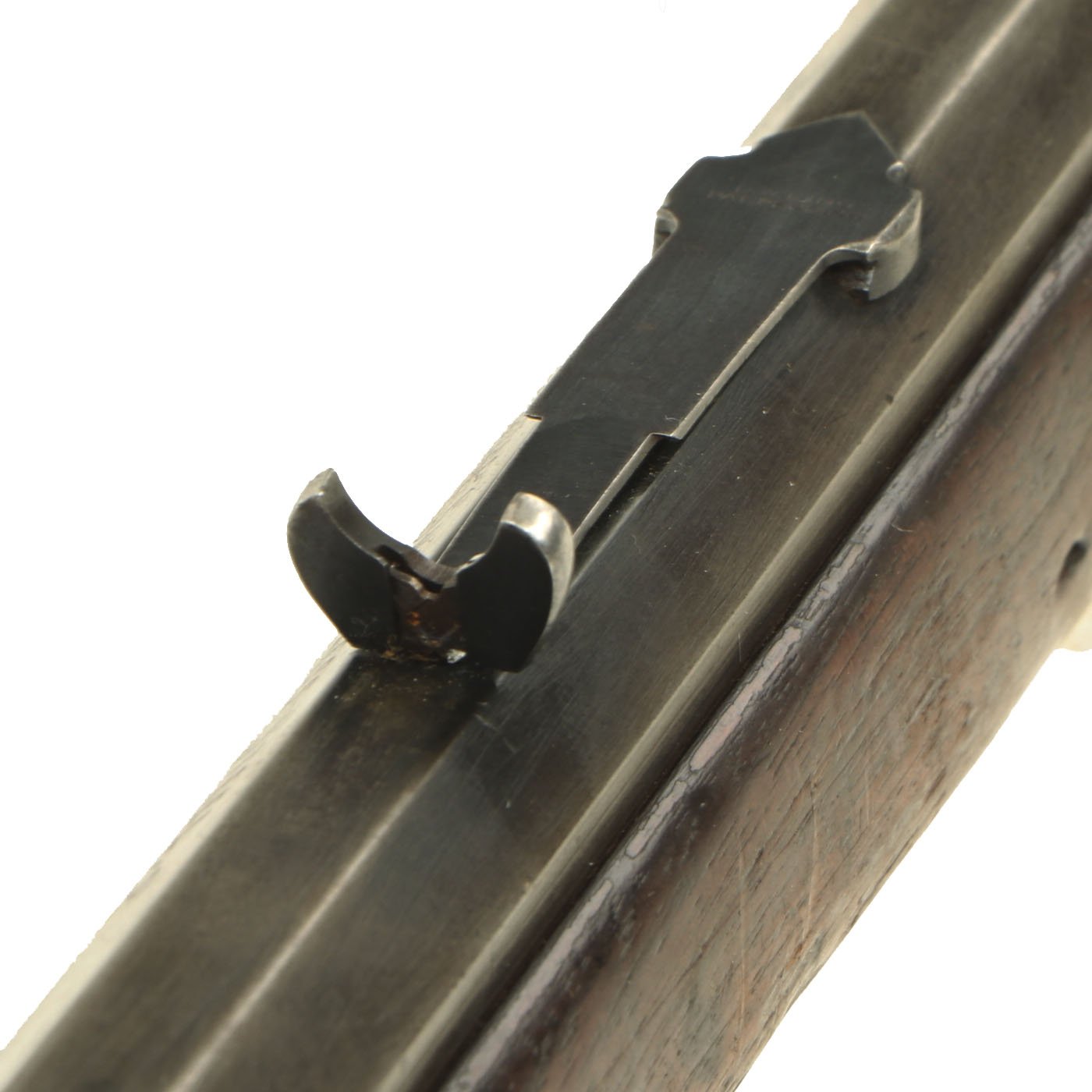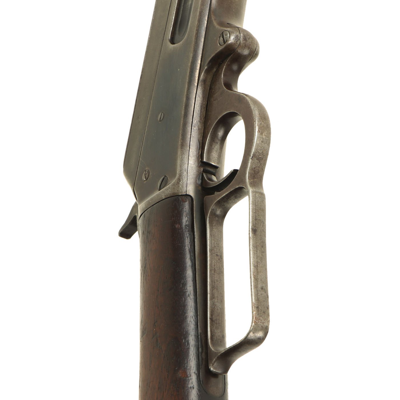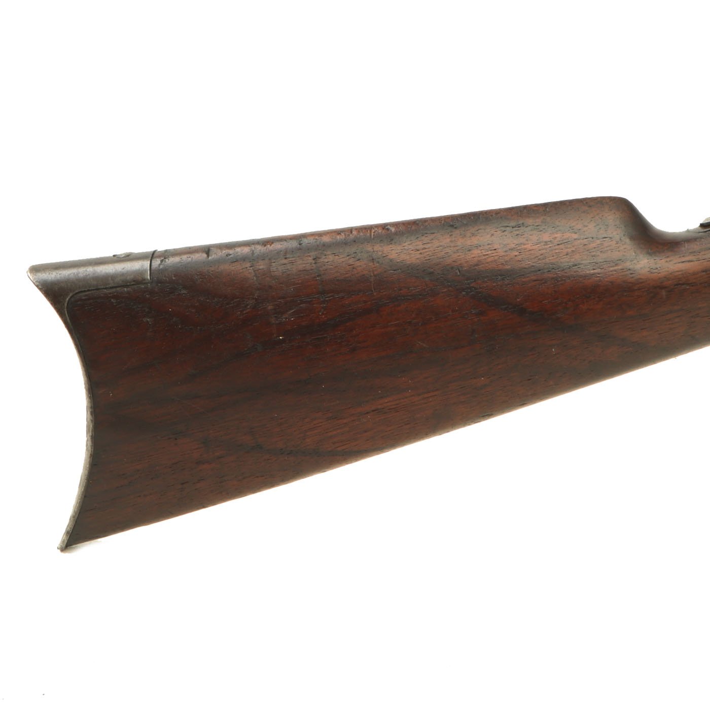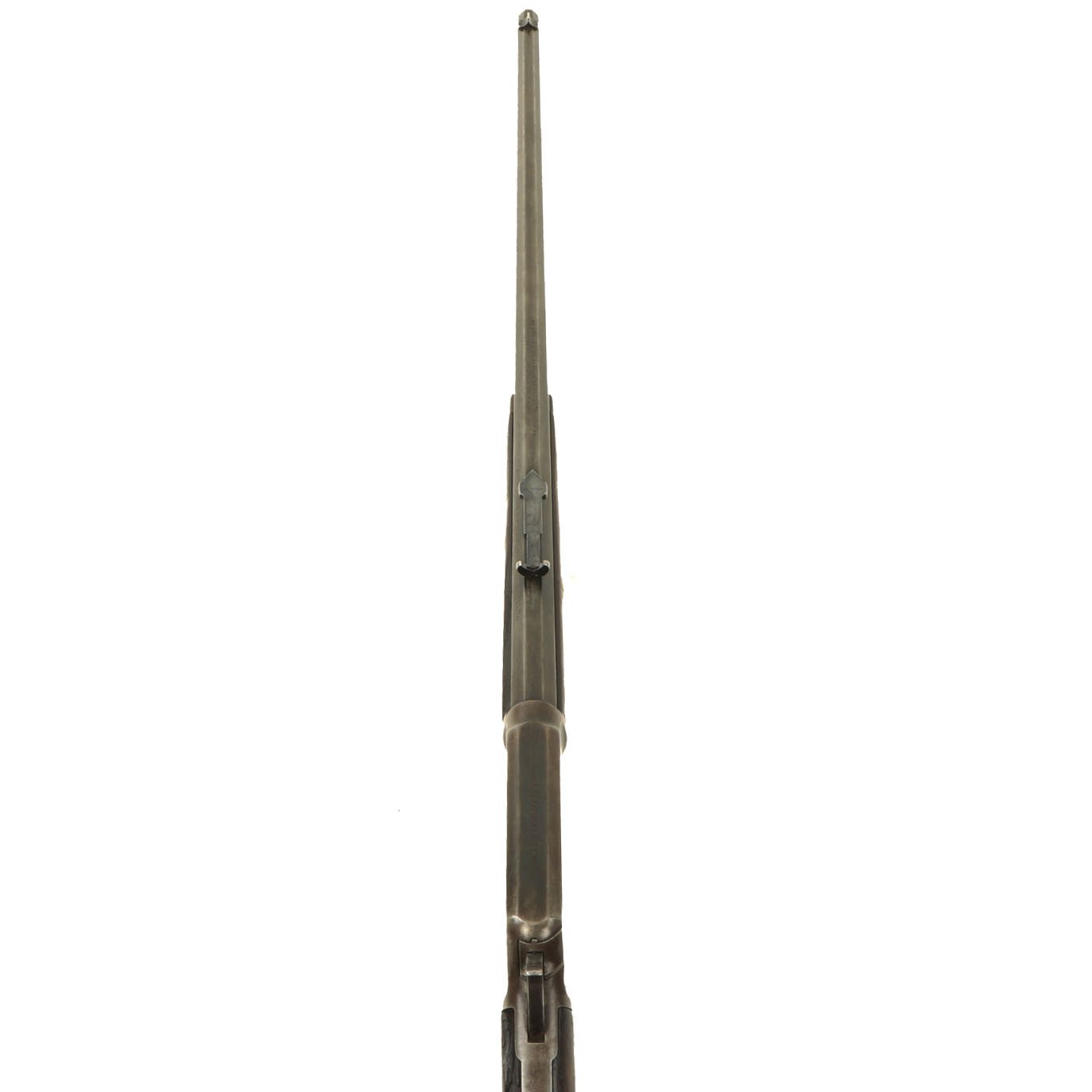 This classic '93 example is in .30-30 Winchester caliber (marked 30-30 over the Chamber), with a 26" octagonal barrel with some original bluing still intact along with traces of case hardening in places. The model 1893 was a refinement of the earlier "New Safety" Model 1889, which was he first solid-top receiver, lever action rifle with a side ejection that threw the fired cases, or live cartridges, to the right-hand side of the rifle as opposed to being thrown straight up and out of the gun.
