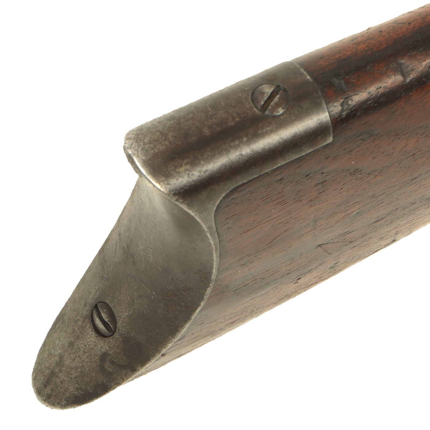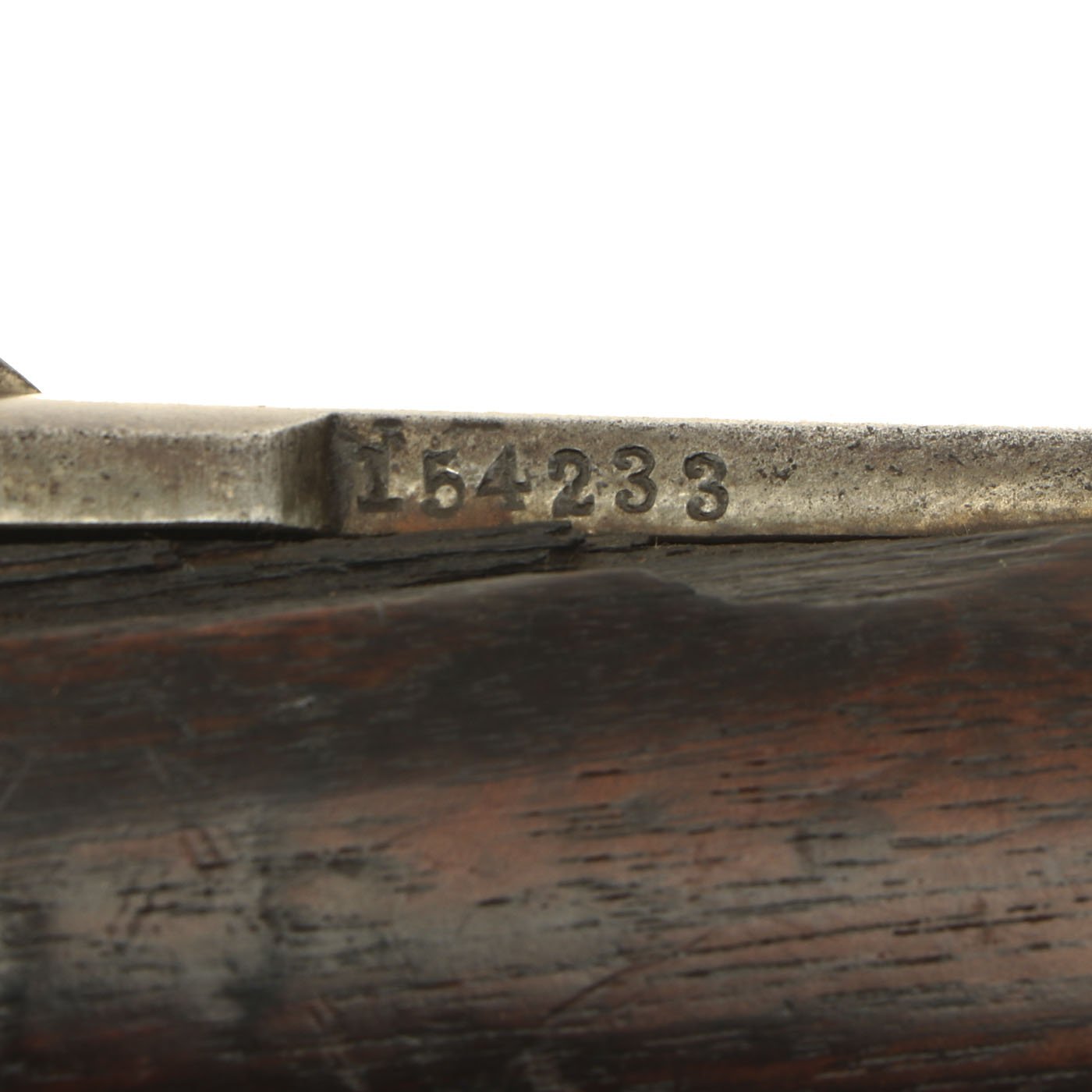 The bore shows clear lands and grooves, but they are definitely worn, so this is a gun that saw significant use, probably at the range or hunting. Probably rates a 7 out of 10. The wood stocks are in good condition, but show much wear. The fore stock has a crack and is worn down from years of hand contact and cleaning. The butt stock is in better shape, though it is missing a chunk next to the receiver tang, which allows the serial number to be seen.