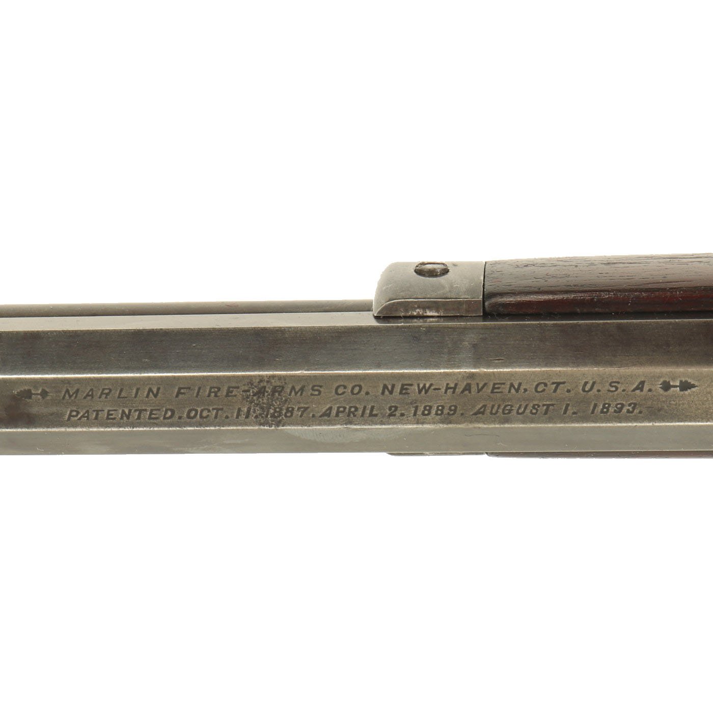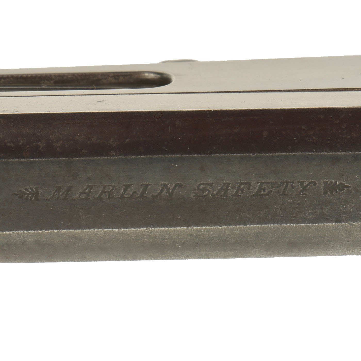 The top of the receiver is marked MARLIN SAFETY and the bottom of the receiver shows serial number 154233, indicating that this rifle was manufactured in 1894. It has the correct MODEL 1893 marking on the receiver tang. The bore shows clear lands and grooves, with a somewhat dark finish. The grooves are definitely darker, so this rifle looks to have some fouling that was not cleaned out after it was last used. Probably rates a 6-7 out of 10. The wood stocks are in very good condition, with light wear and a lovely color.