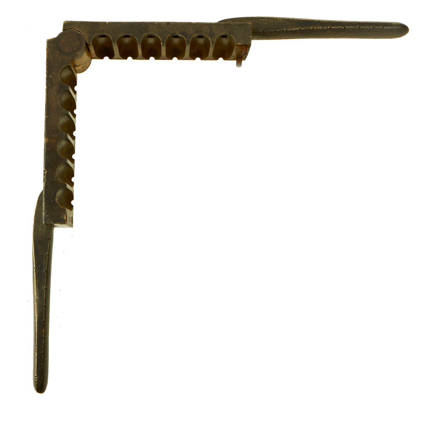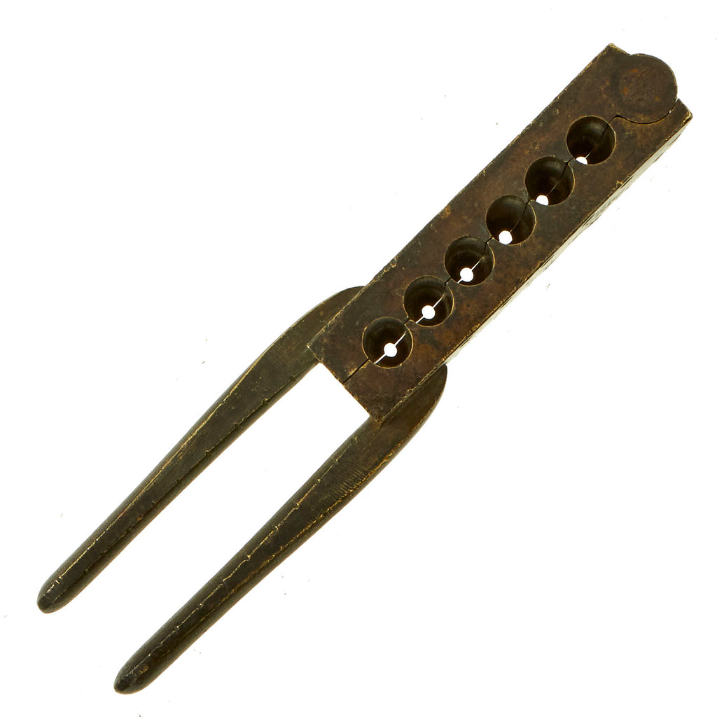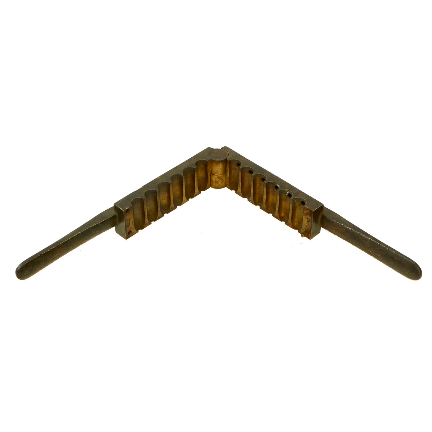 Original Item: Only One Available. This is a truly massive bullet mold, clearly stamped twice with COLT'S PATENT and was intended for use with a very substantial firearm. With a 6 round capacity, it was intended for .55-100 Maynard the plate that is missing should allow for the casting of hollow base bullets. The bullets produced are .55” caliber, and would measure about 1 inch long, based on the location of the overflow hole in the mold.