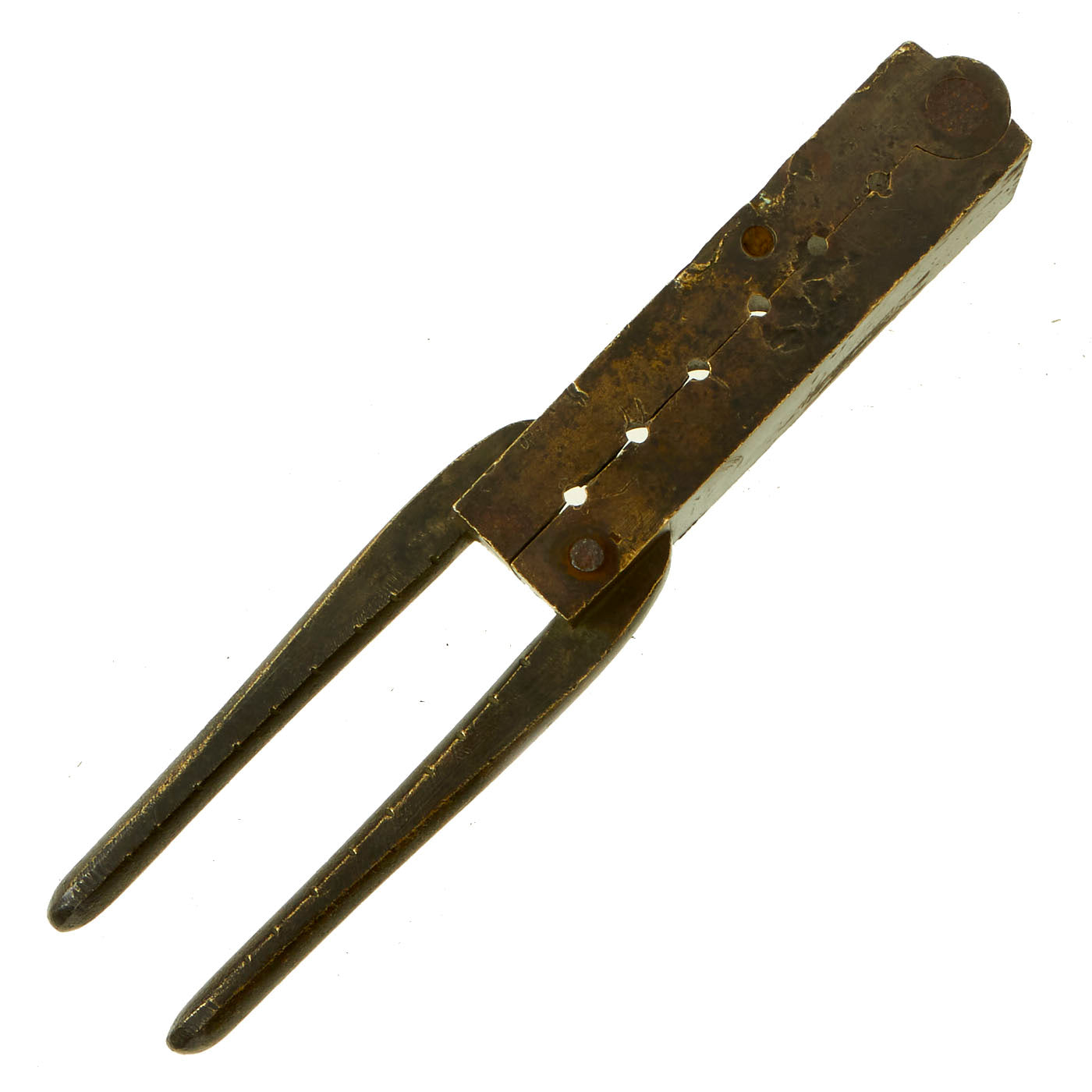 The mold does show use, and there was most likely originally a hinged plate on the bottom, which is now missing, though the iron pivot pin is still partially present.