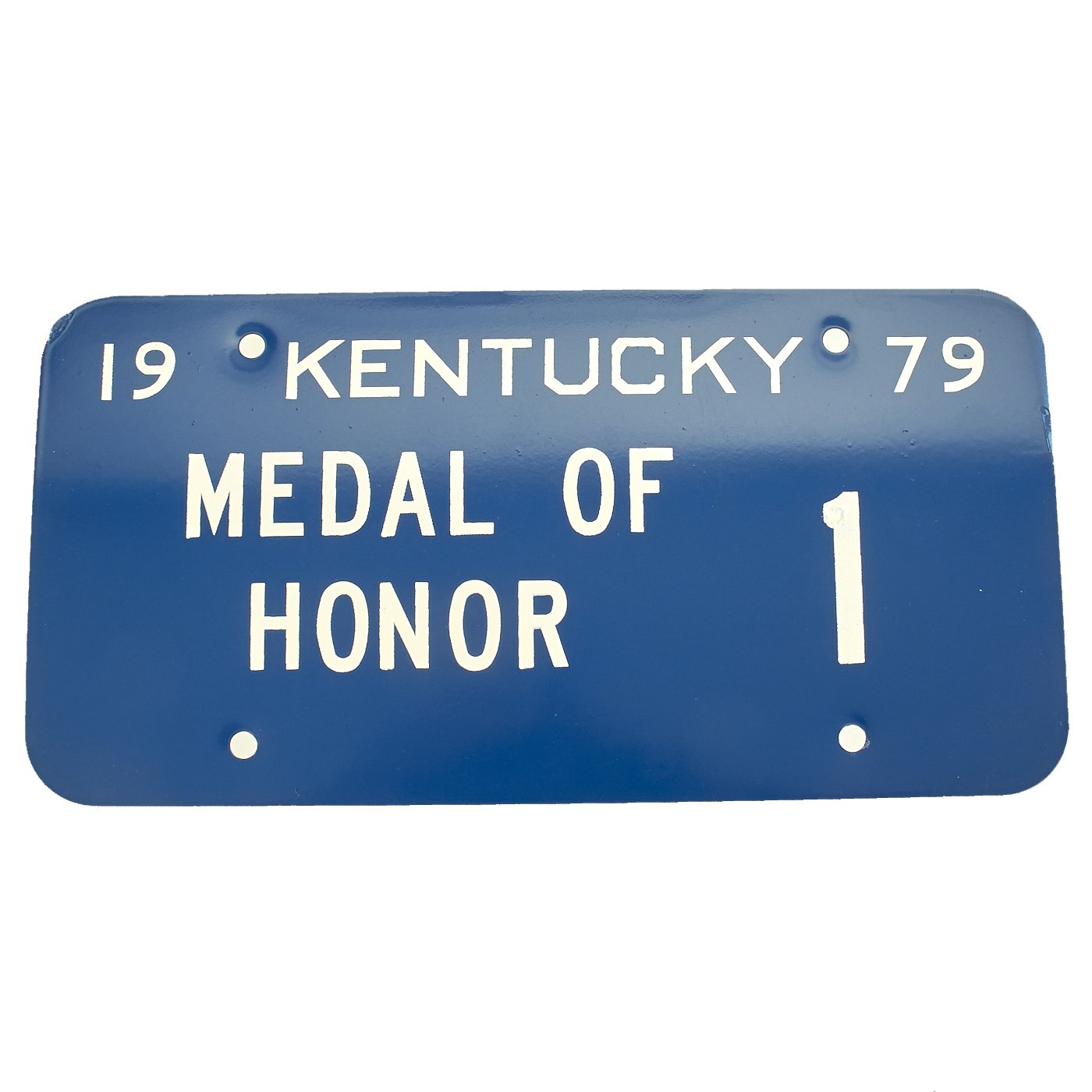 Original Item: One-of-a-kind. This is a genuine vintage steel license plate from the great state of Kentucky, for a recipient of the Medal of Honor. This example is even dated 1979! The blue & white painted plate reads: