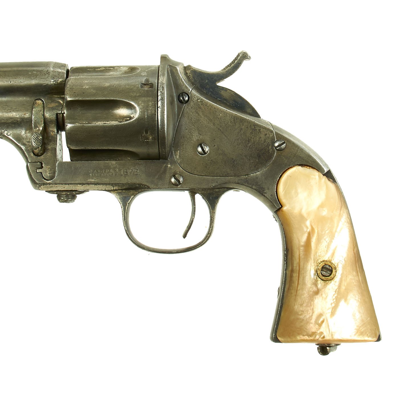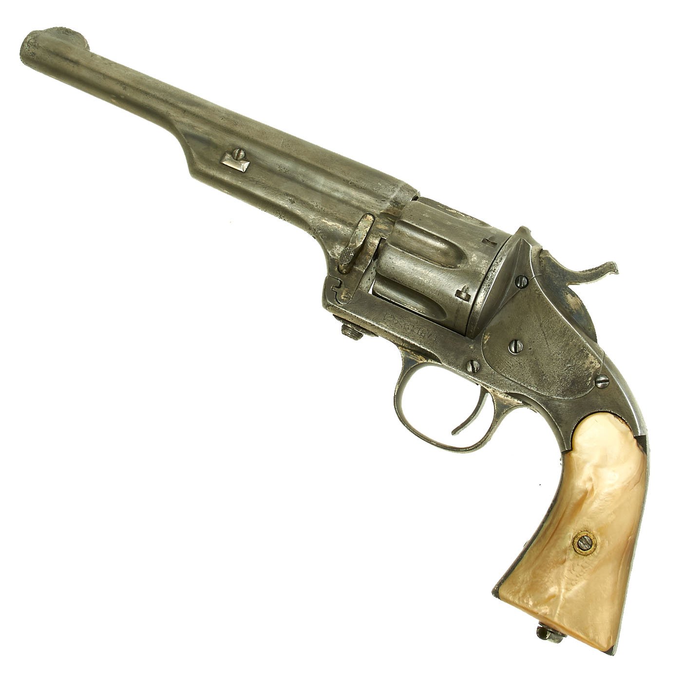 Original Item: Only One Available. To some this is one of the most beautiful Revolvers ever made. Wonderful design, great workmanship and so easy on the eye. Mervin & Hulbert started business in 1876 with this Open Frame cartridge revolver that took the .44 Merwin & Hulbert cartridge. This example was originally nickel plated, however that is now all but gone, replaced by a nice polished bright steel. It still retains it's original long 7 inch barrel and integral sight, which were often shortened for "gunfighter" use. It also has been fitted with beautiful Mother of Pearl grips, very possibly when New. Truly, this was a "pimped out" example for someone who wanted a revolver with BLING.