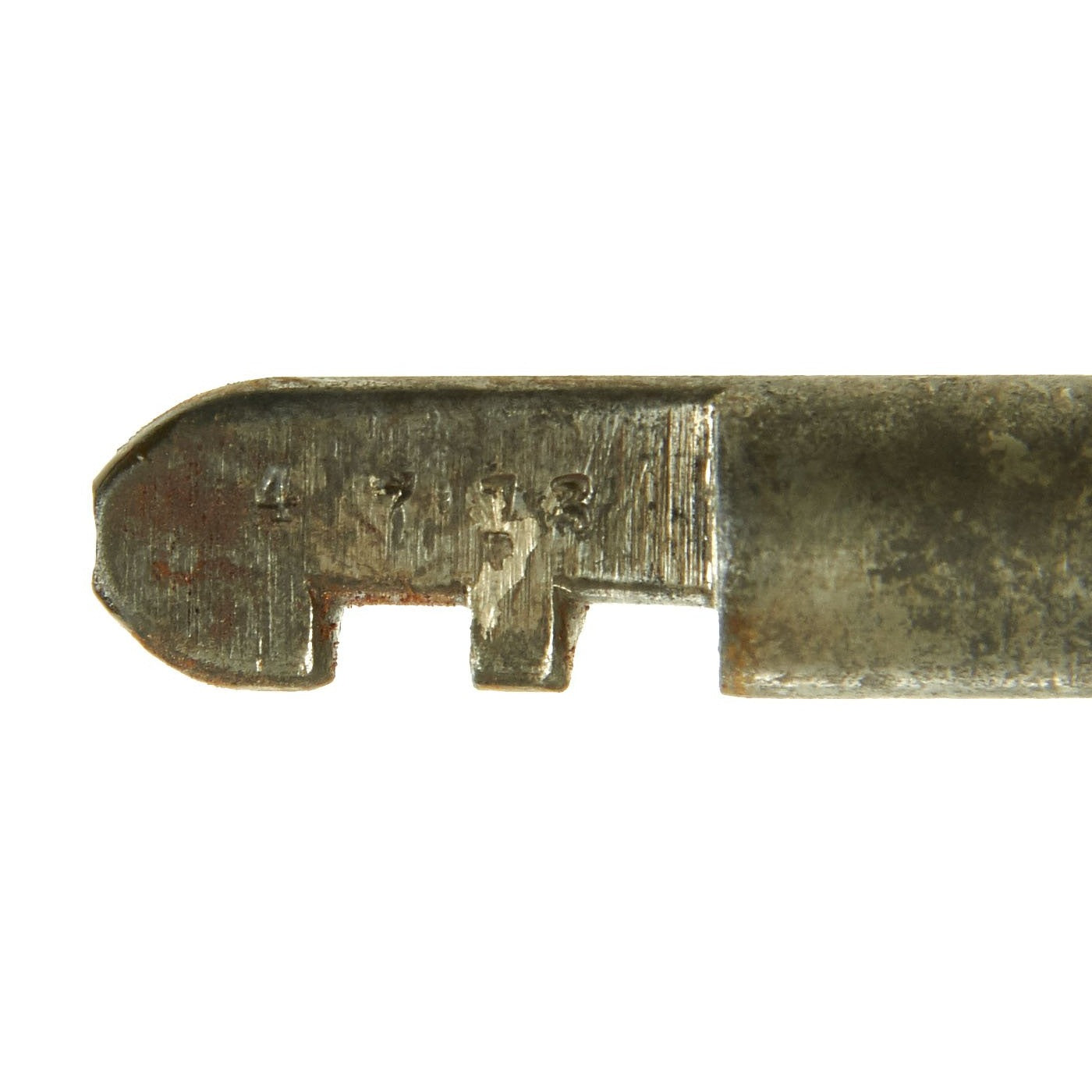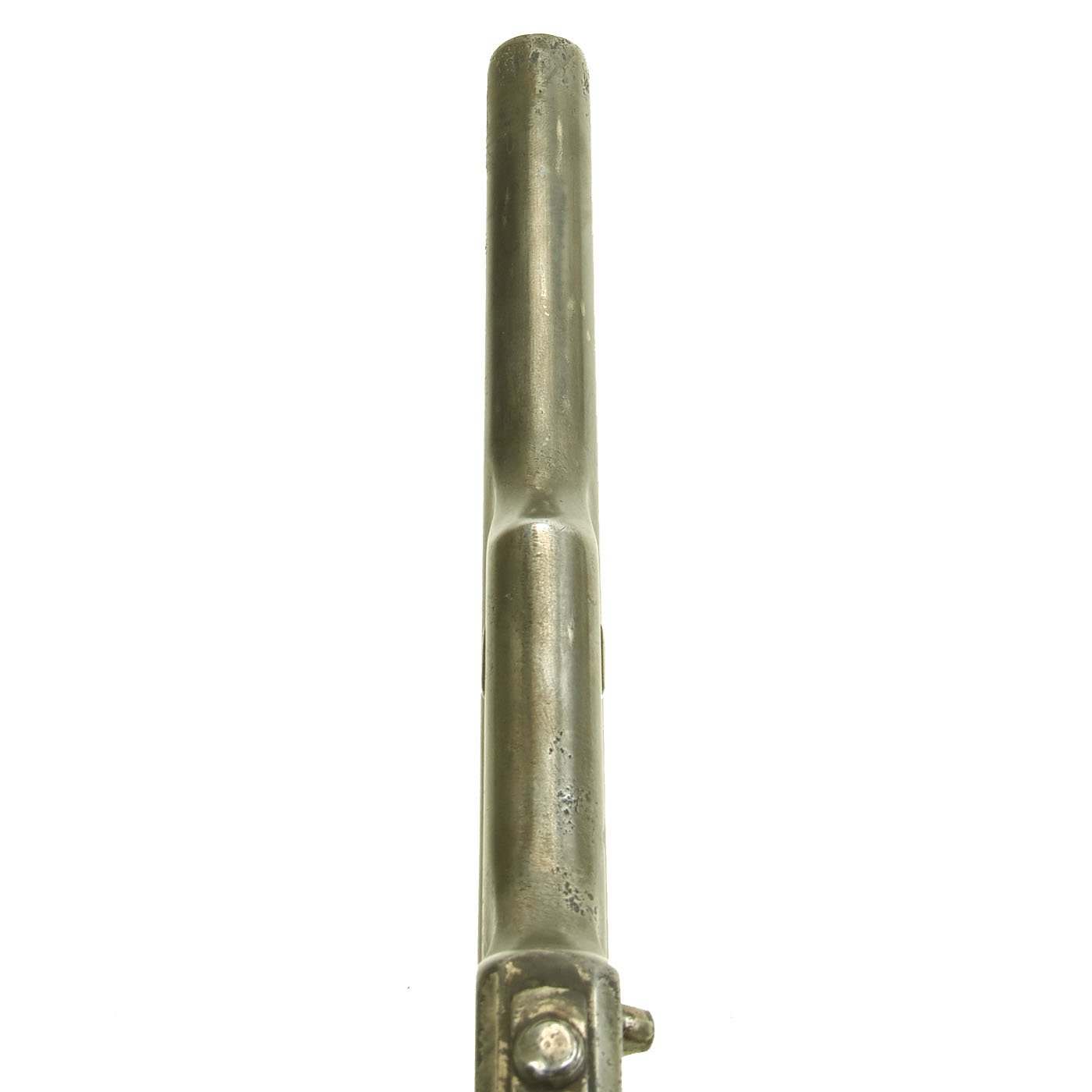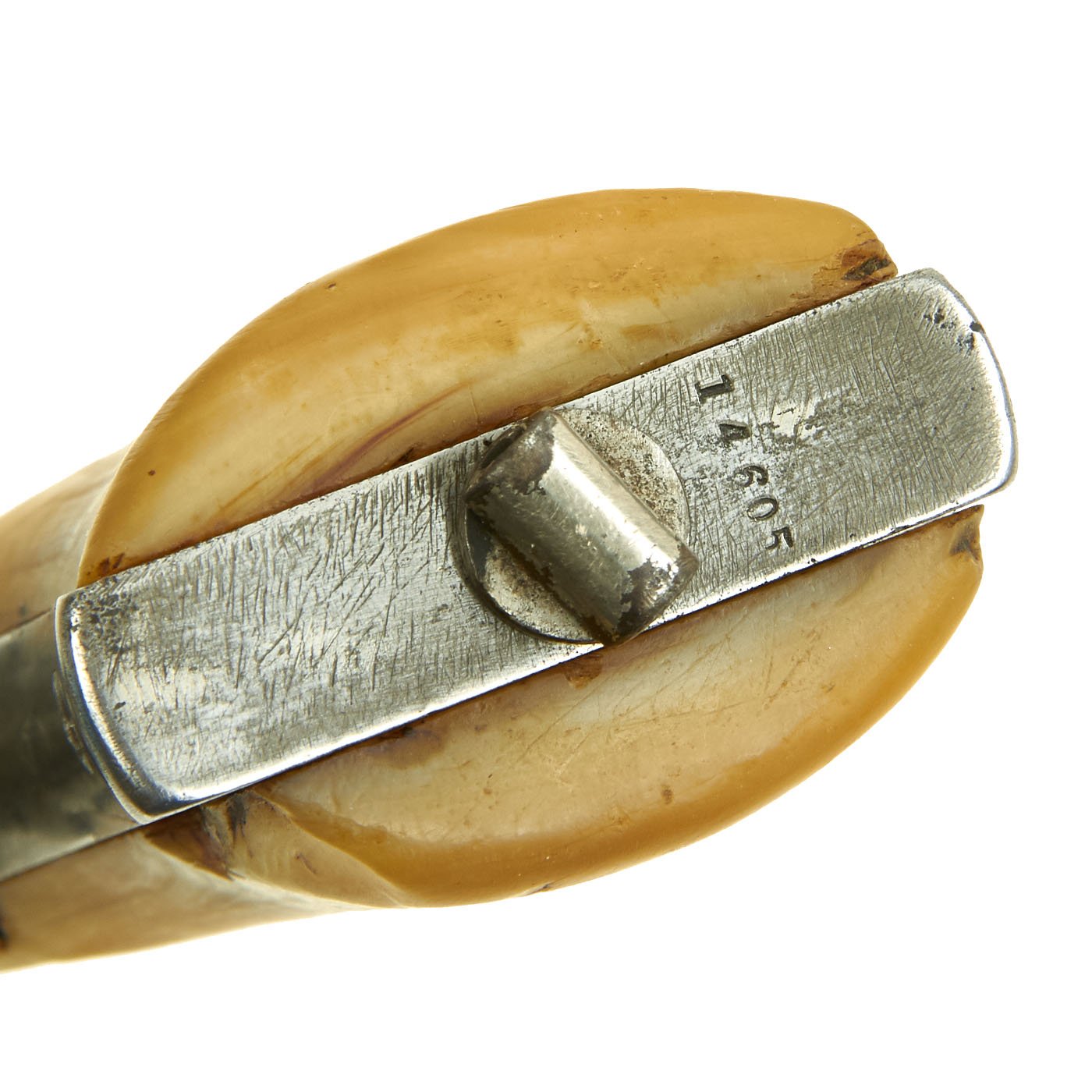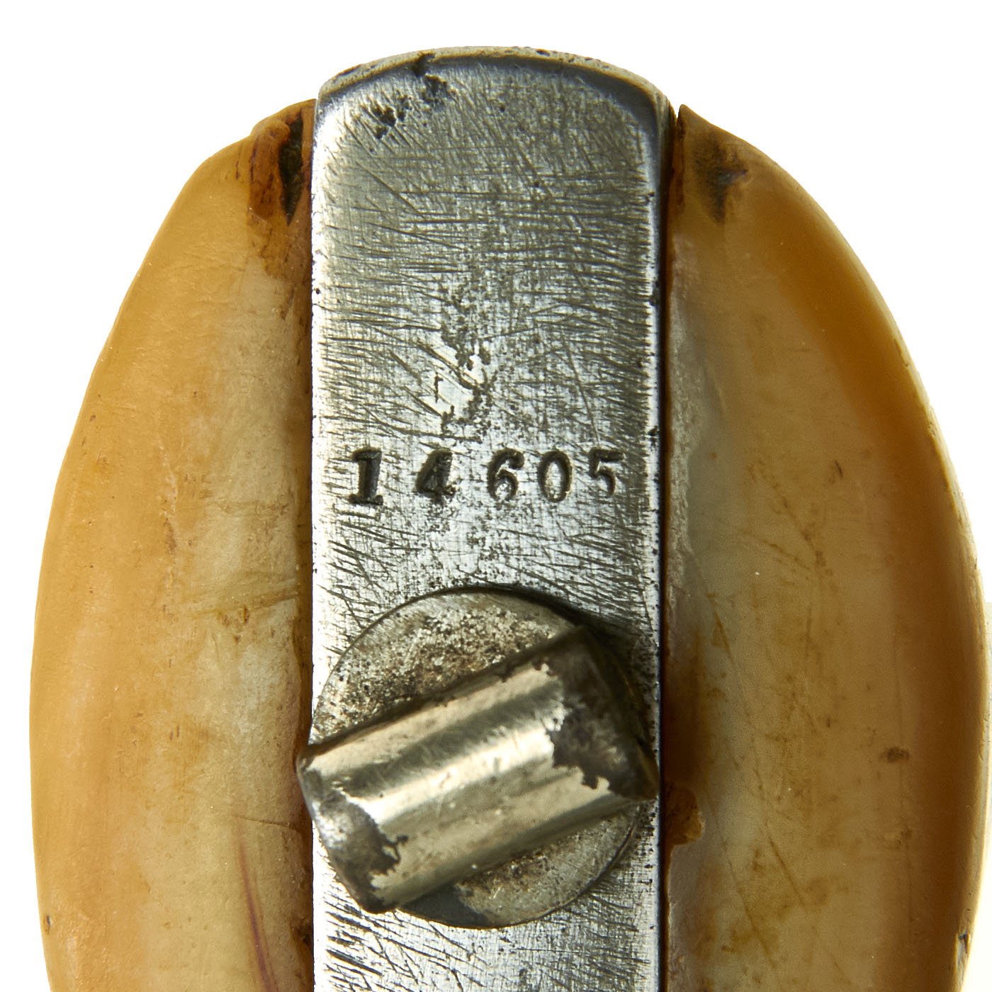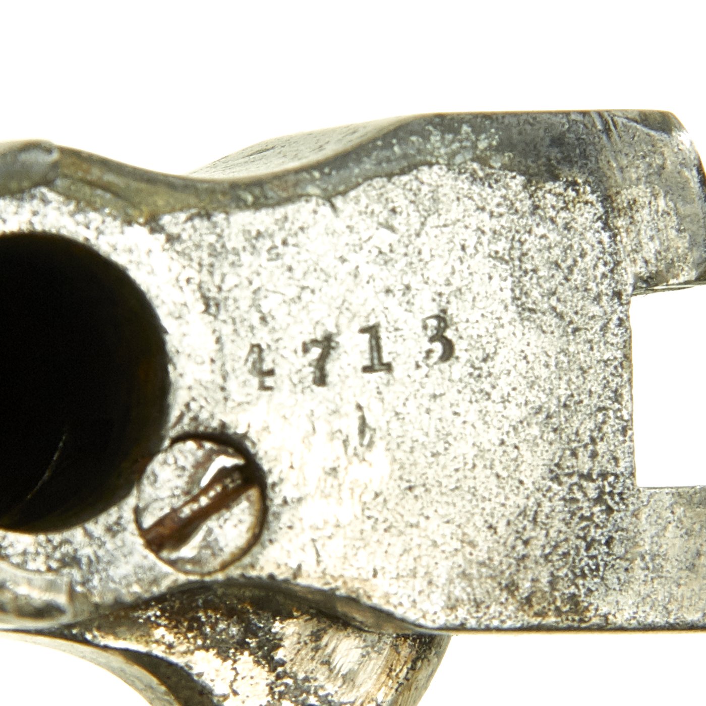 The grips on this example do show some wear and chipping, but have a lovely aged look. Removing them shows the assembly number 4713 marked on the side of the grip frame. This matches the number on the cylinder axis pin and on the back of the barrel assembly. The cylinder unfortunately is worn, and only the number "1" is still present. The serial number of M&H revolvers is marked on the bottom of the grip frame, and this example is marked 14605 next to the lanyard loop fitting, which is missing the lanyard and also broken internally.
