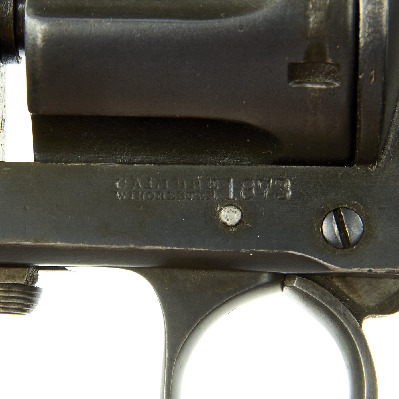 The left side of the frame is marked CALIBRE / WINCHESTER next to 1873 under the cylinder, indicating the pistol is chambered for the .44-40 Winchester Centerfire Cartridge. The revolvers chambered for .44 Russian were marked "Russian Model" and the ones chambered in .44 Merwin & Hulbert would have no caliber markings.