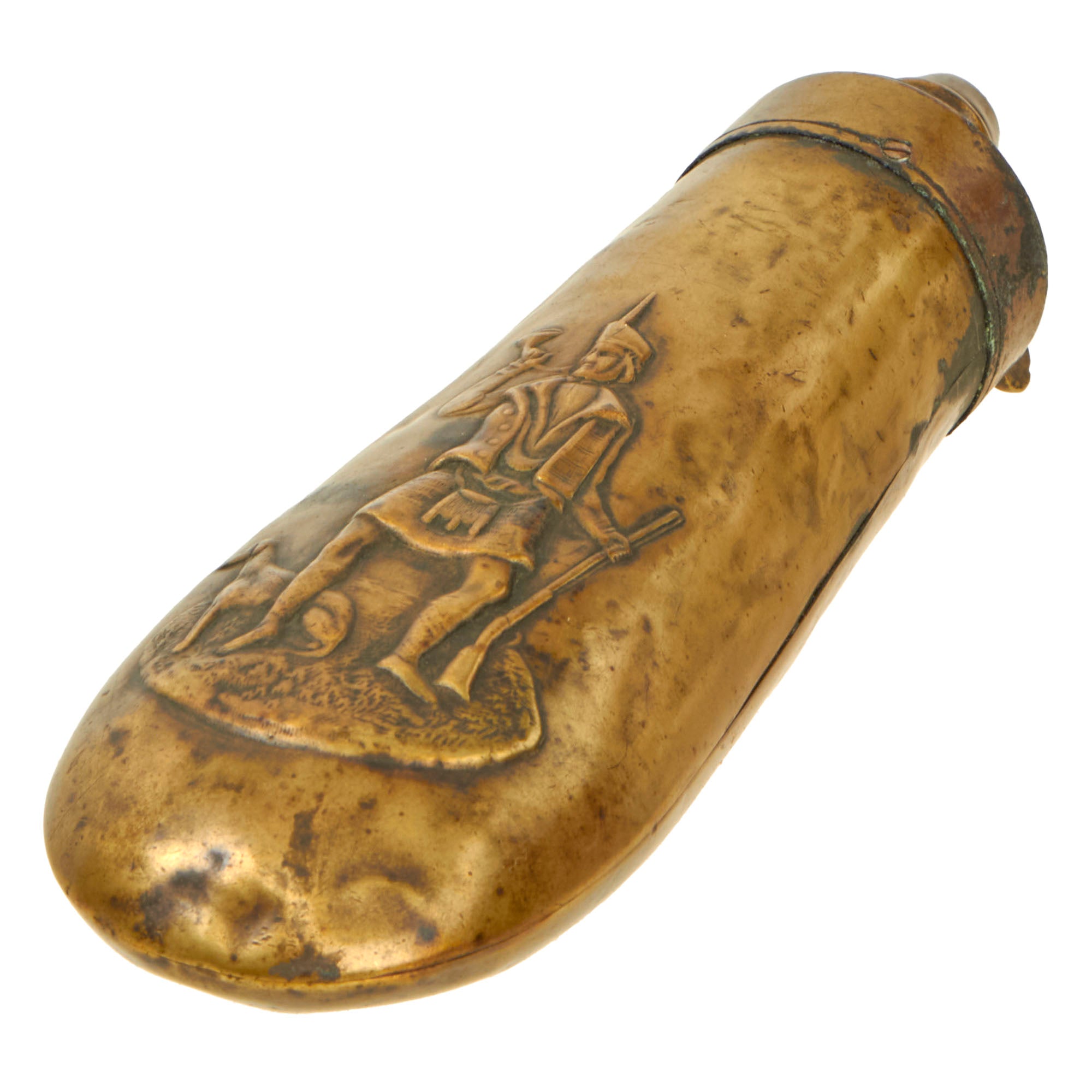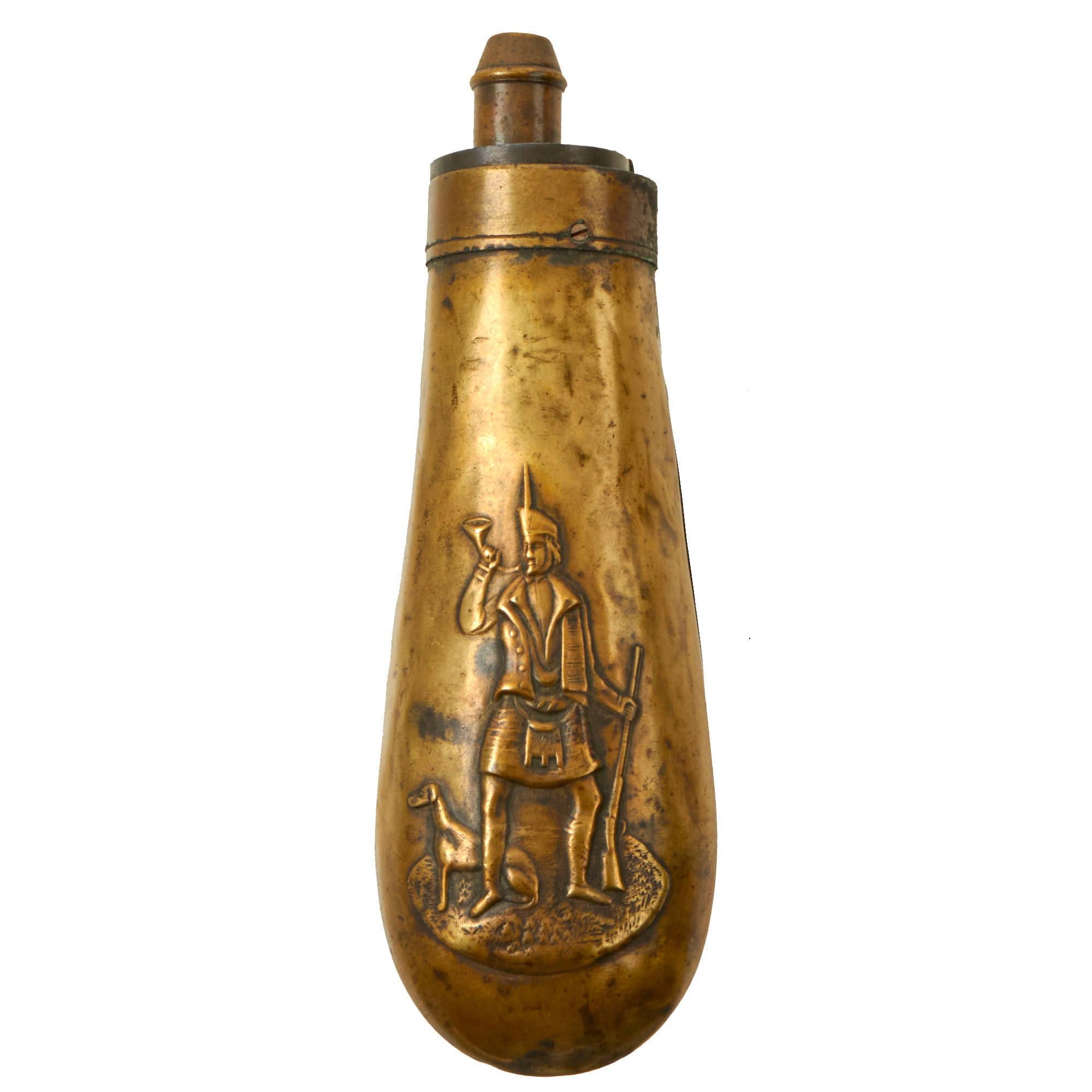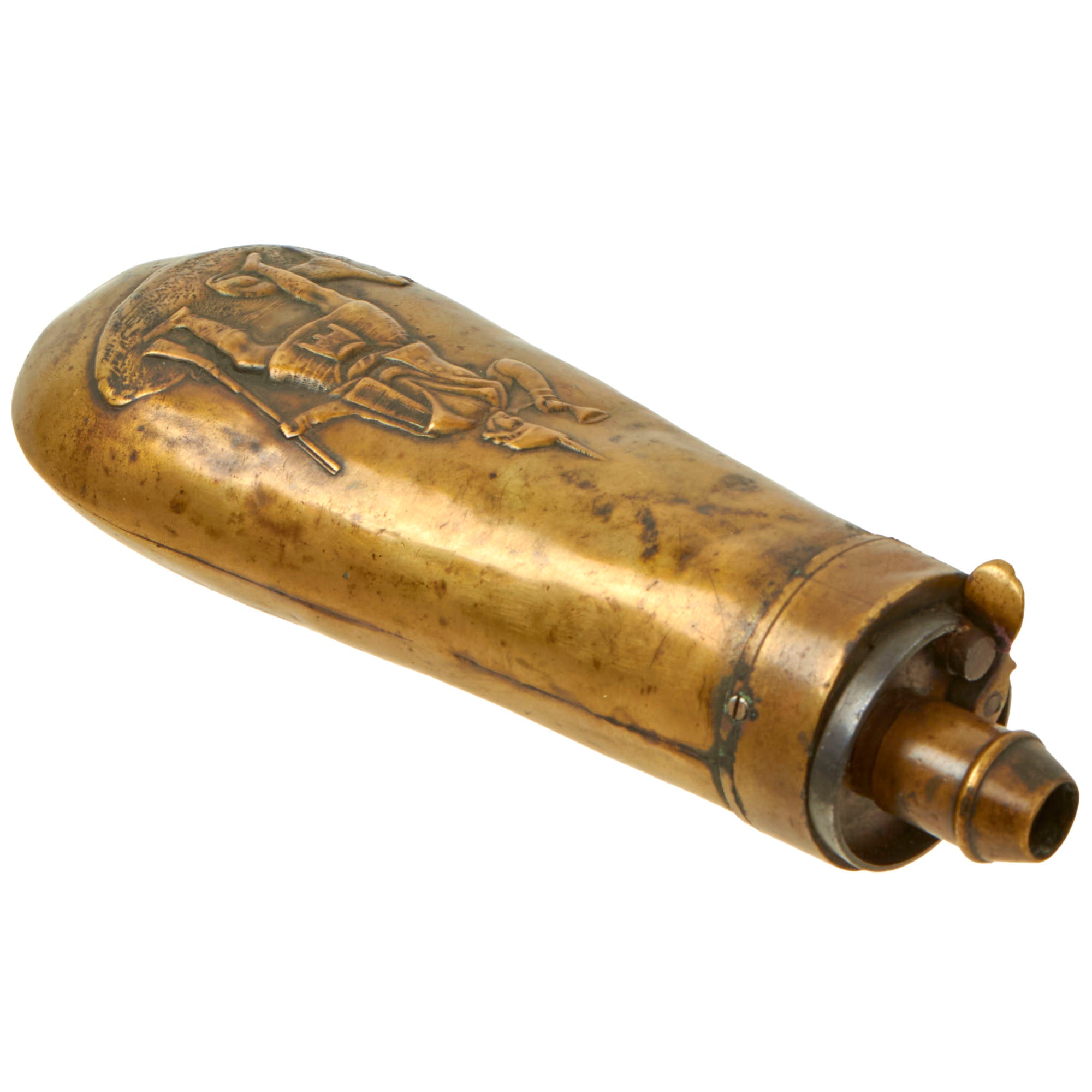 Original Item. Only One Available. This is a stellar embossed brass powder flask most likely manufactured by G. & J.W. Hawksley-Sheffield. George and John Williams, brothers are recorded as opening the company of G & JW Hawksley on the early 9th century, 1840. They did not make arms, but accouterments. Beyond this they specialized in gun powder flasks and silver flasks. This is a rather small example.