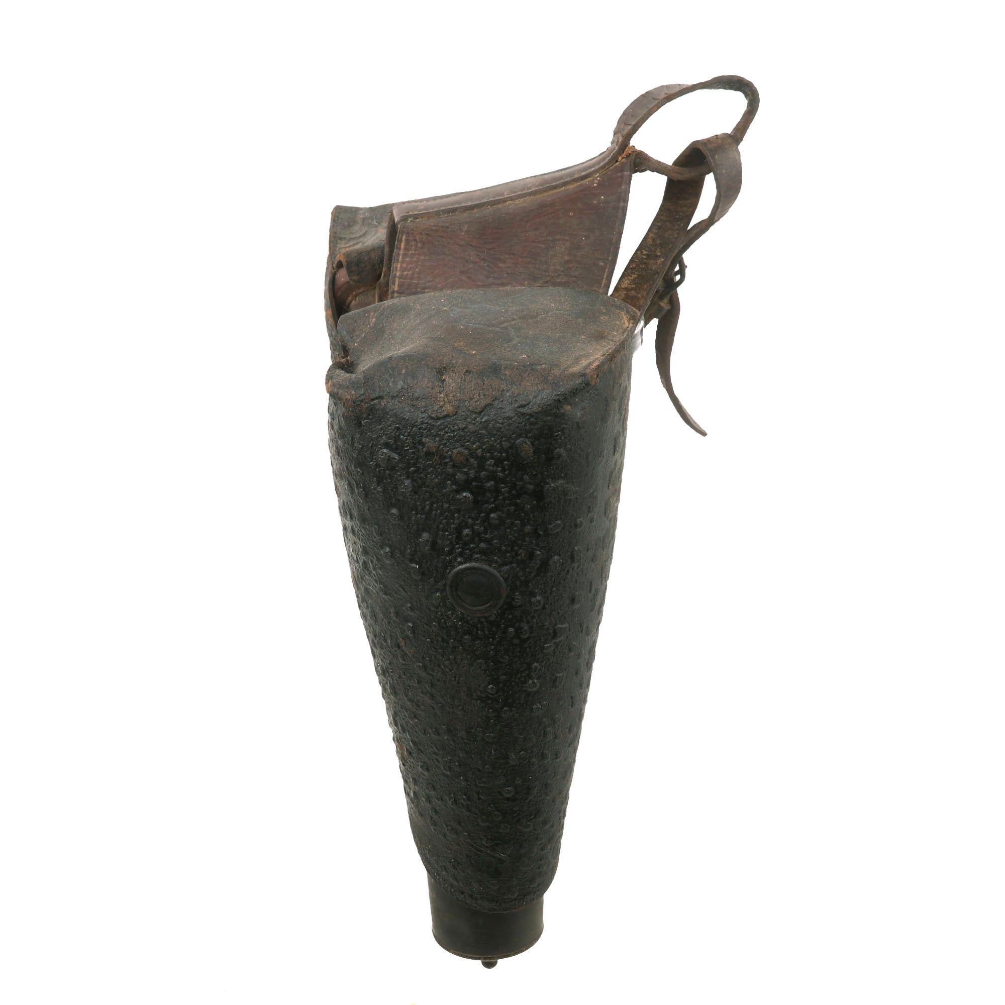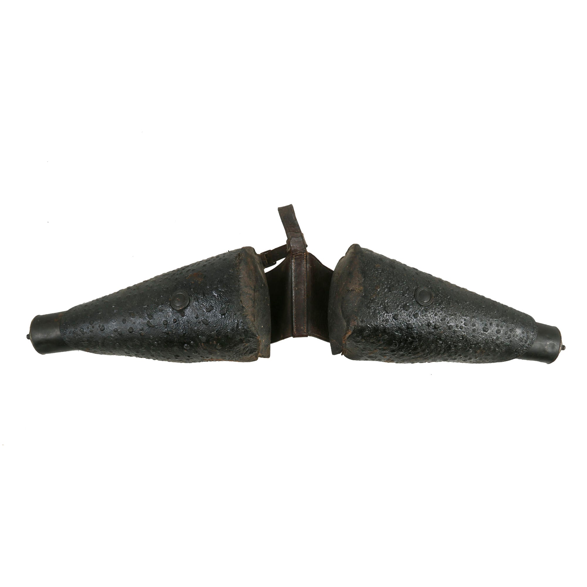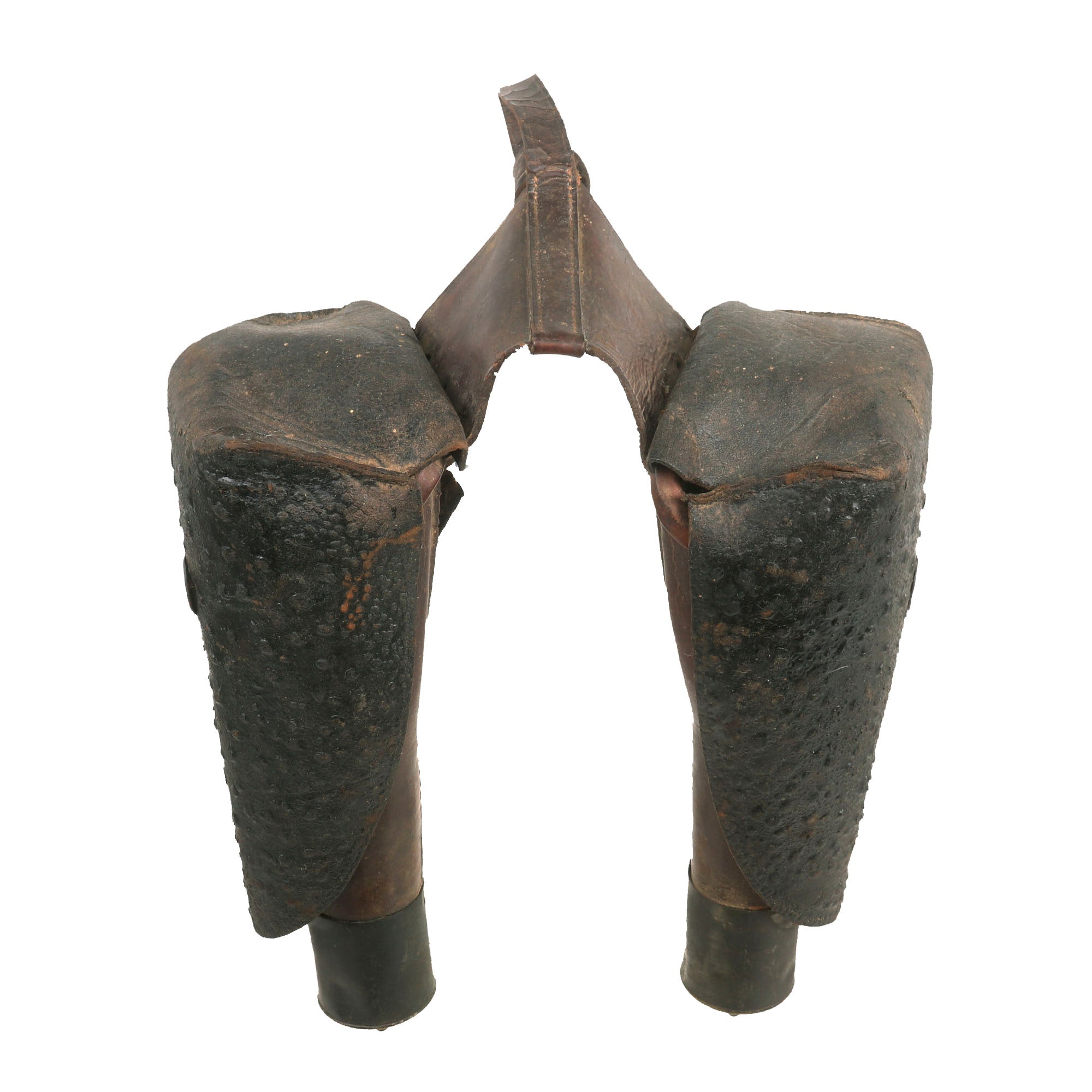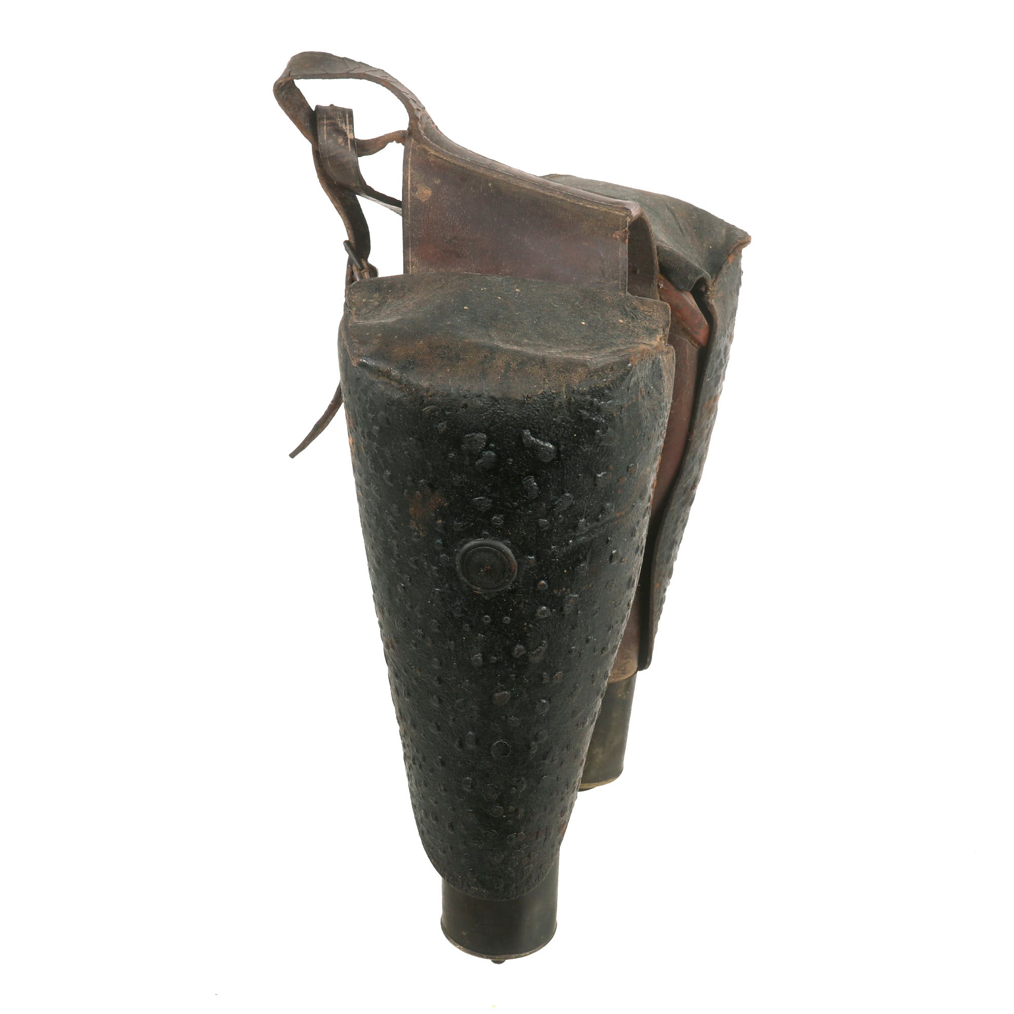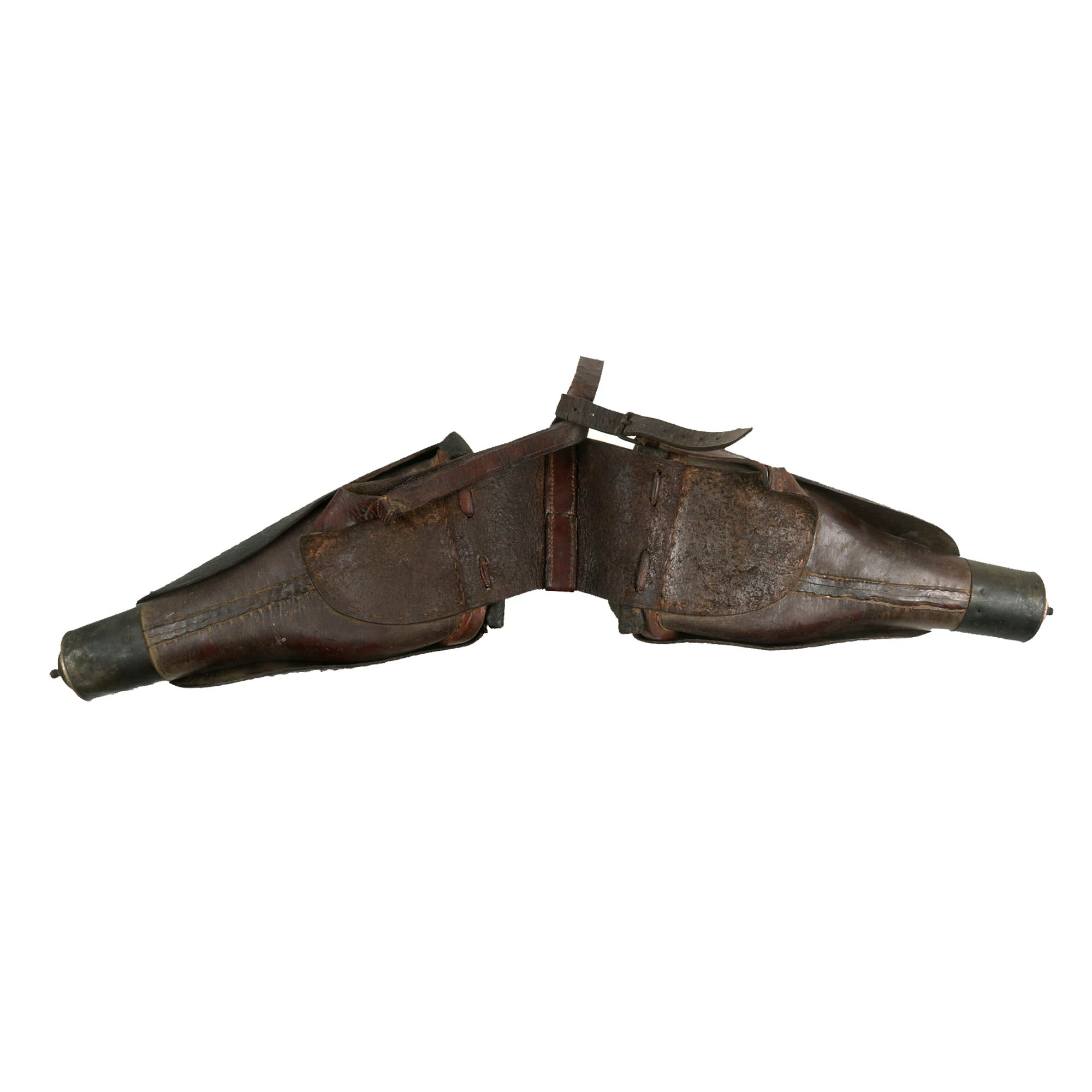 While the leather is in good condition overall, there is some noticeable surface finish loss on the yoke between the holsters, which may detract from the overall appearance. Fortunately, the two holsters are still firmly attached together, which is uncommon as these leather holsters often degraded over time and ultimately would end up tearing in two.