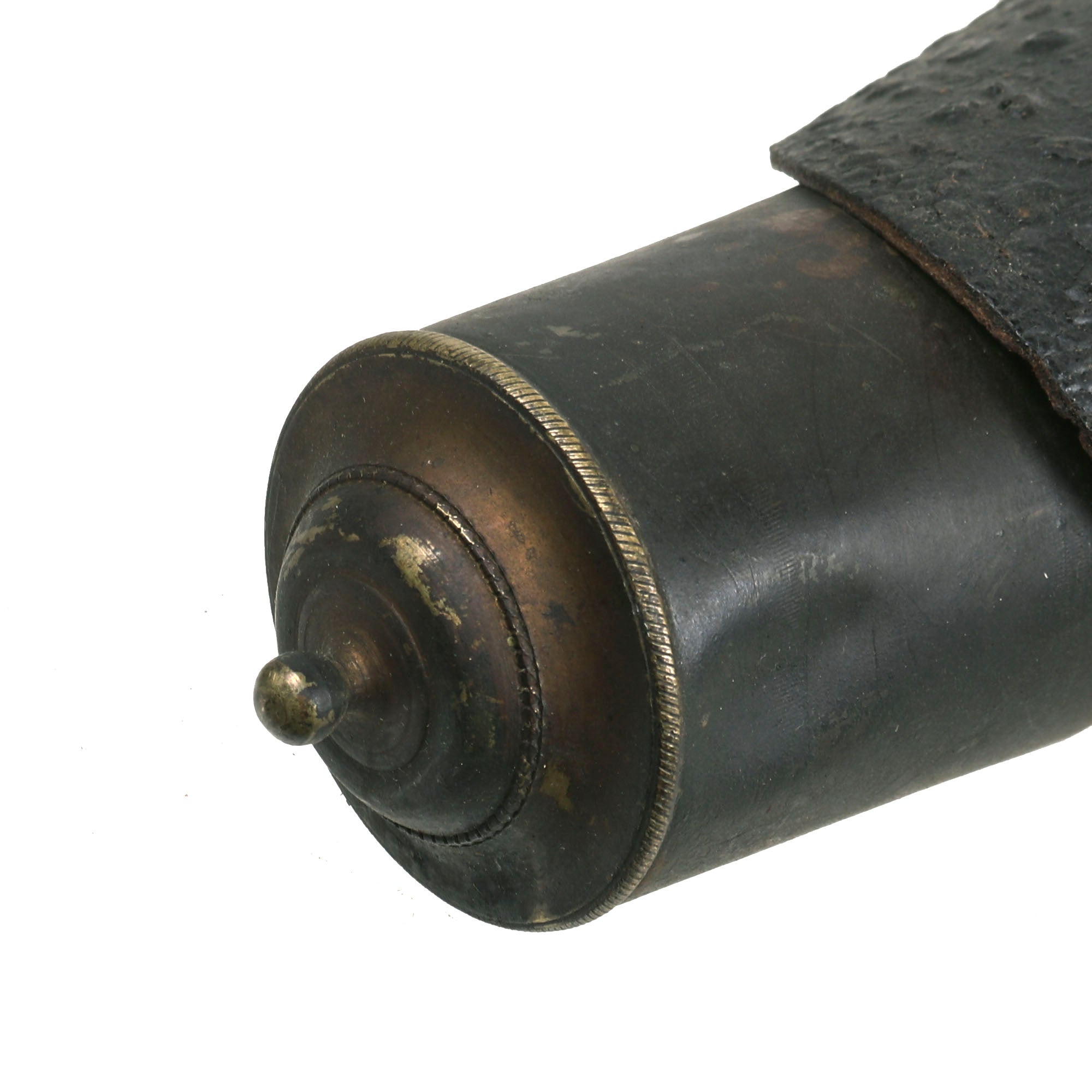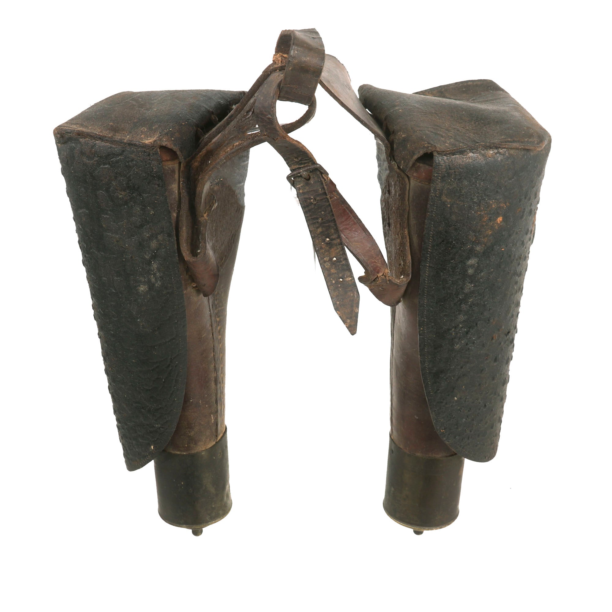 These holsters are in remarkably good condition for the age, with all sewn seams still holding tightly. The body of each holster measures approximately 12.5 inches in length, providing ample space for smaller pistols. The holsters are equipped with a brass drag on each body, adding to their aesthetic appeal. However, it is worth noting that neither holster features a closure tab.