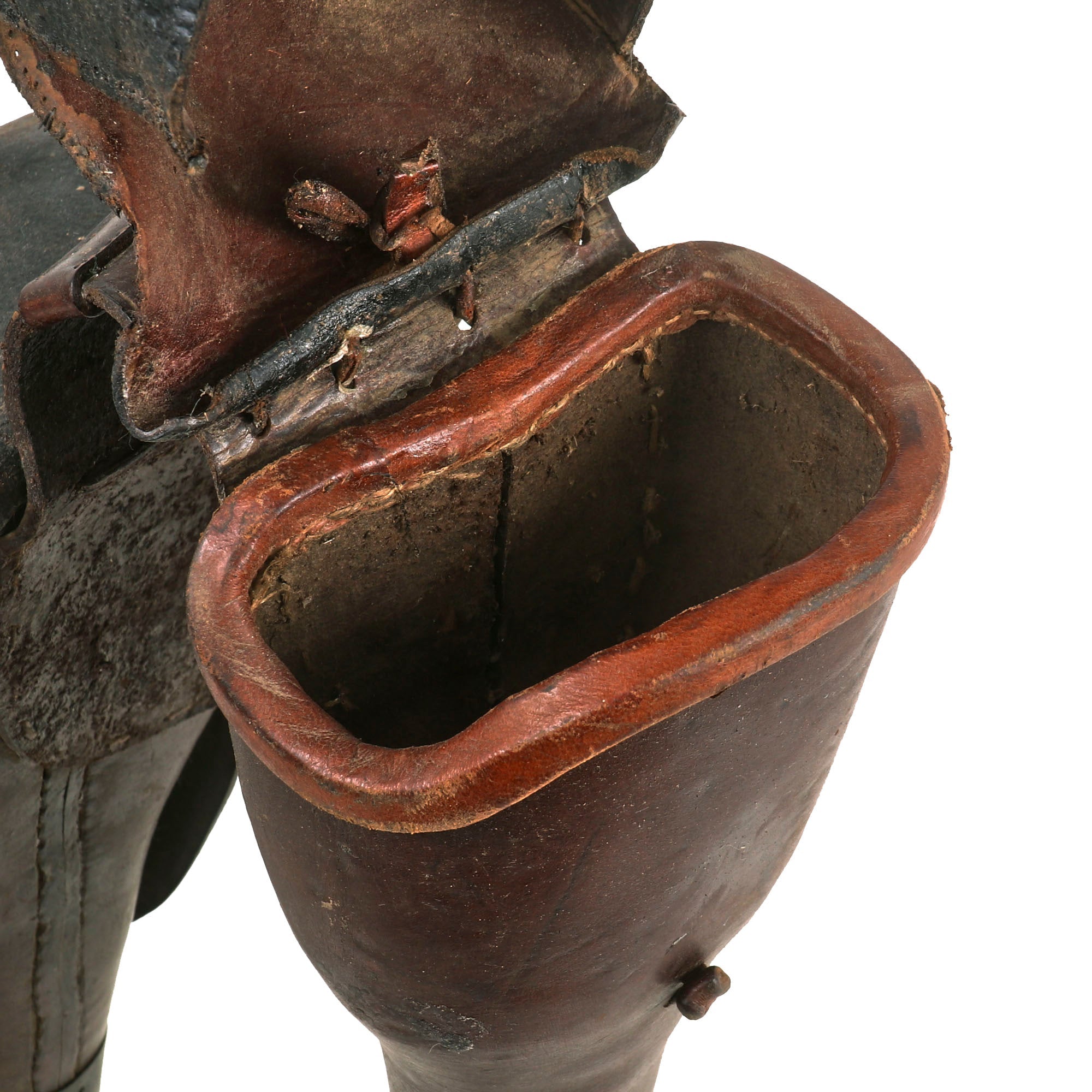 Original Items: Only One Set Available. Here we have an exceptional pair of black and brown leather saddle holsters that are specifically designed to hold flintlock / Percussion pistols up to 11 inches. We are uncertain as to which pistol this was designed due to many of the British produced pistols measured up to 11 inches in length, or it could very well have been made to fit a specific pistol produced by the United States. The leather is smooth and supple, with a glossy finish that exudes elegance and sophistication in the areas it was retained.
