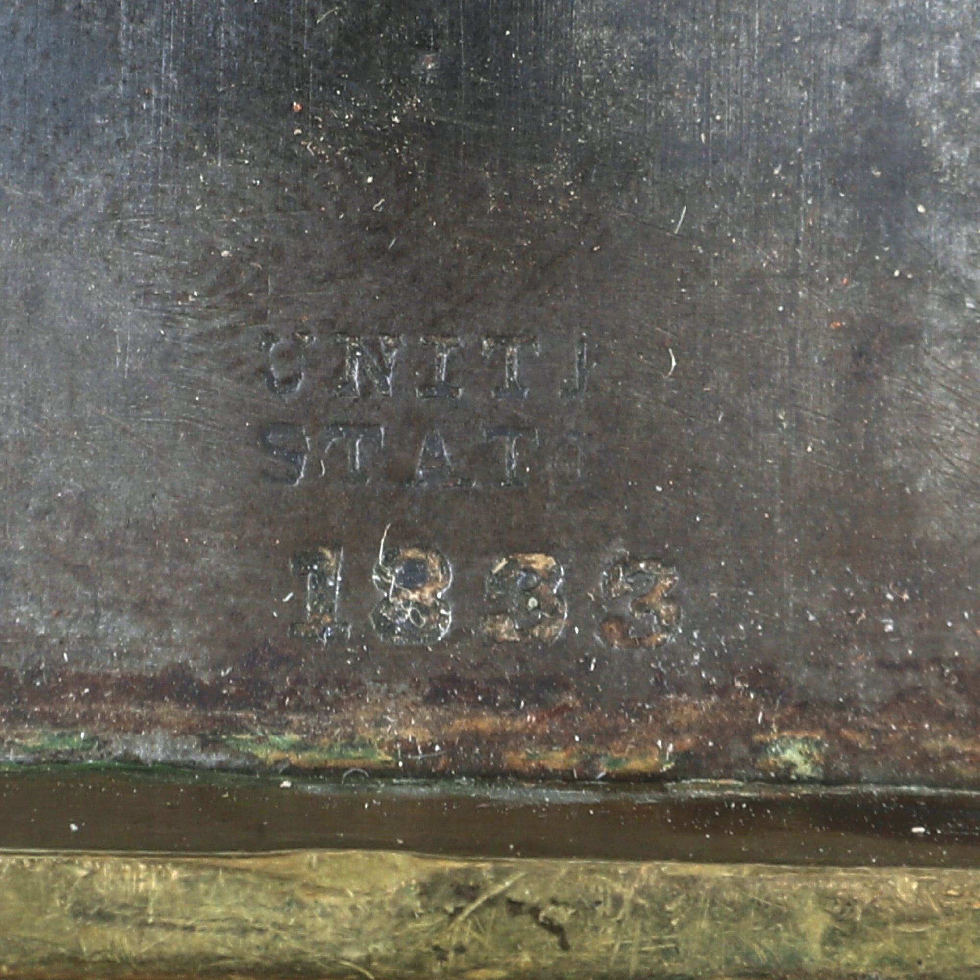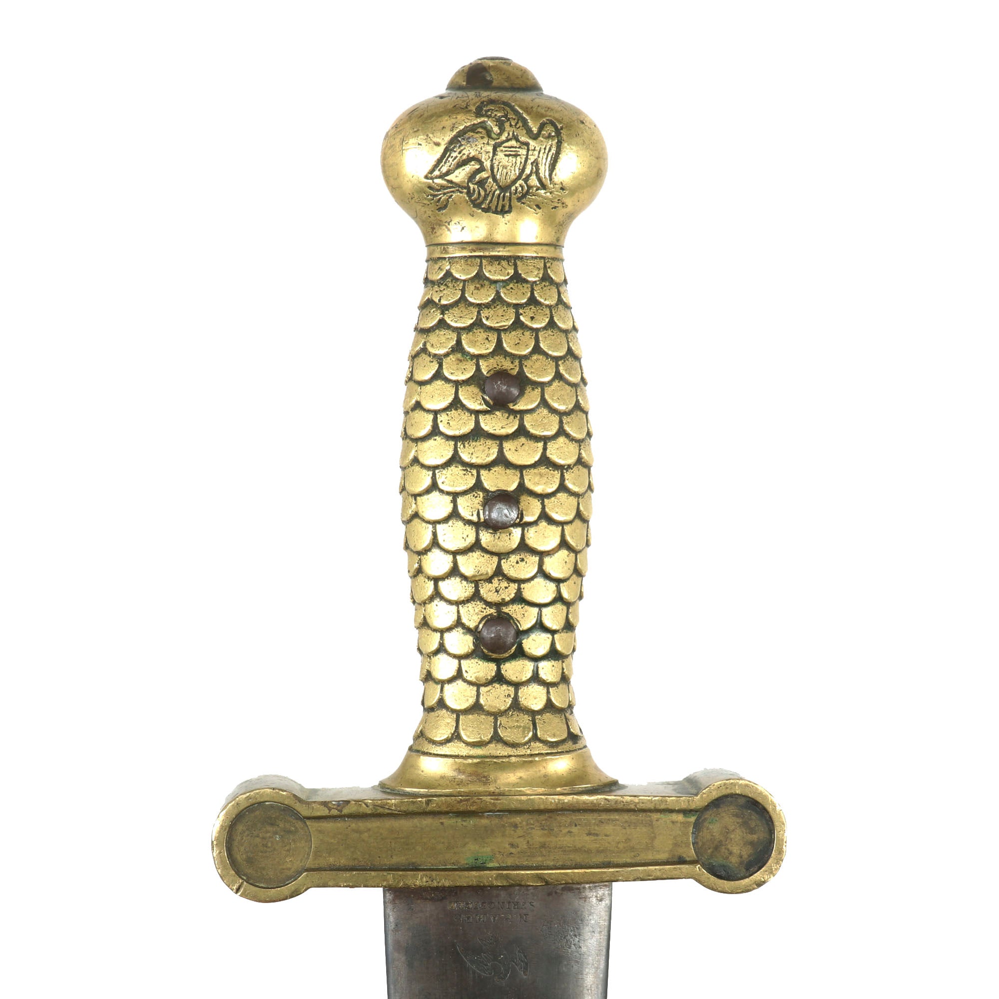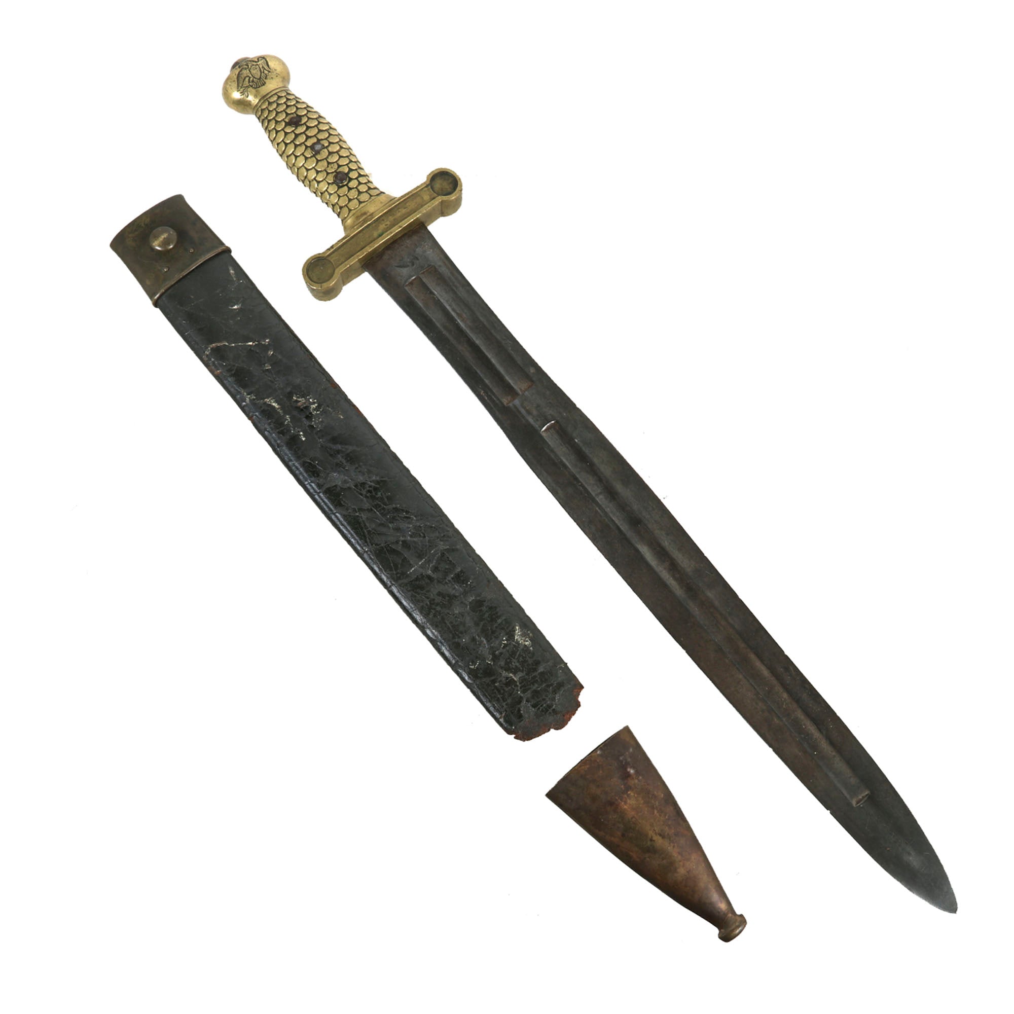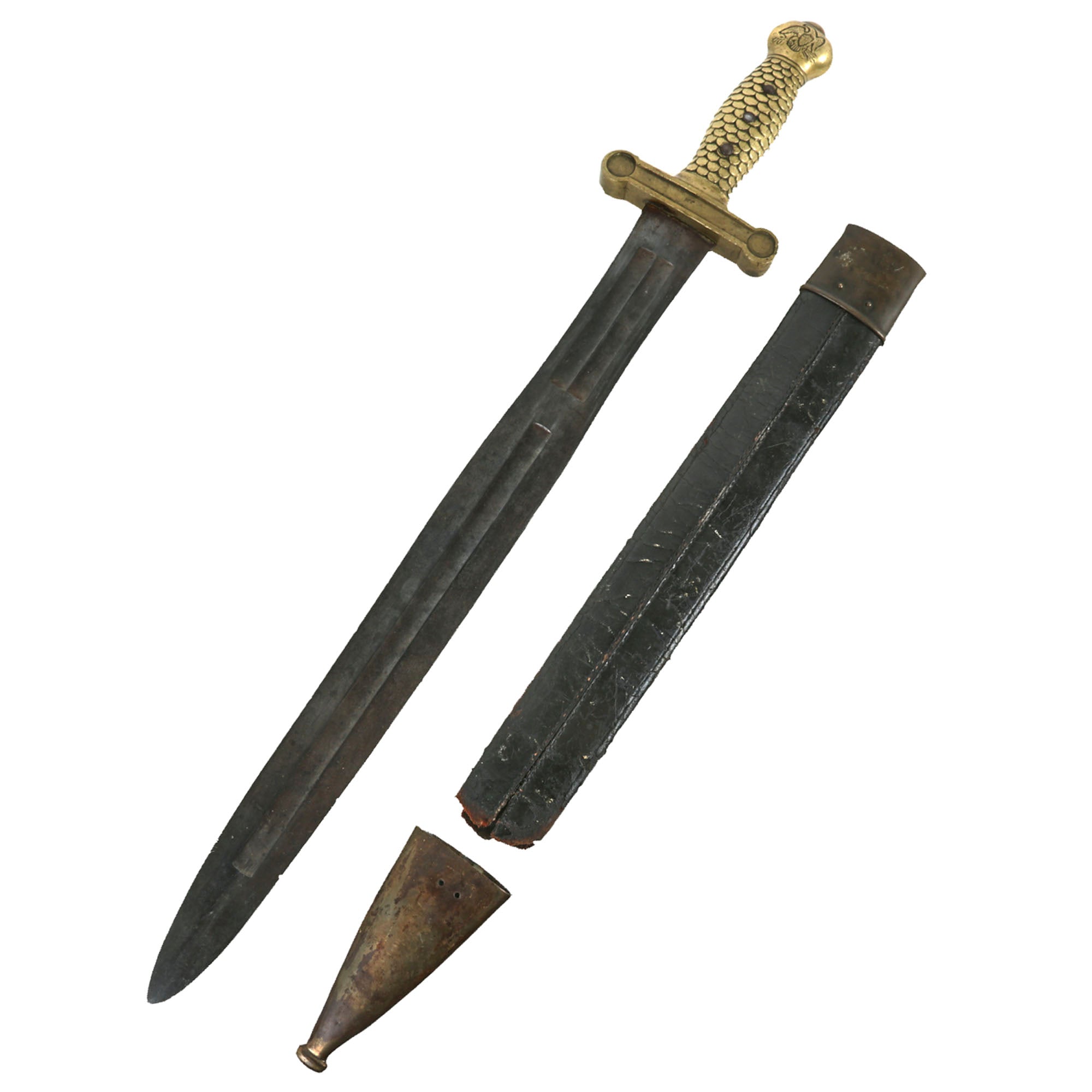 Original Item: Only One Available. This is a lovely patinated example of an Ames Model 1832 Artillery Short sword, dated 1833, a very scarce first year example. This design of foot artillery sword has a straight, heavy double-edged steel blade. There are two side-by-side fullers, starting just below the hilt. Then, after a space of 11/16", there is a single center fuller that extends toward the blade's spear shaped point. The overall blade length is approximately 19 1/4''. This example retains the scabbard, but the drag has broken off, and there is enough leather missing where there is a noticeable empty space between them.