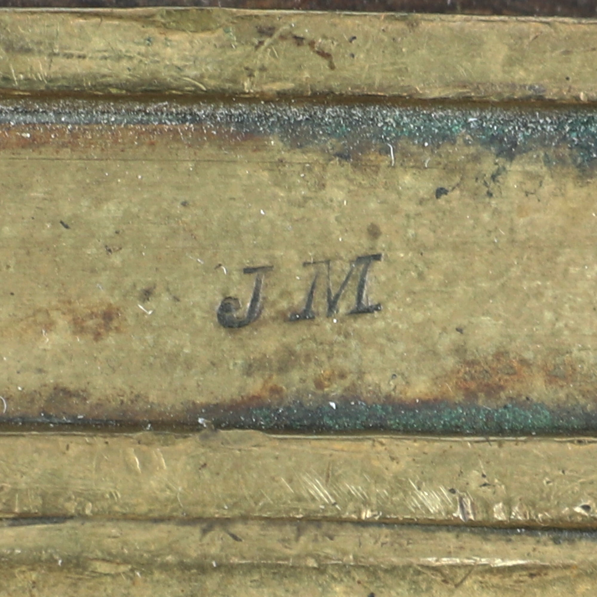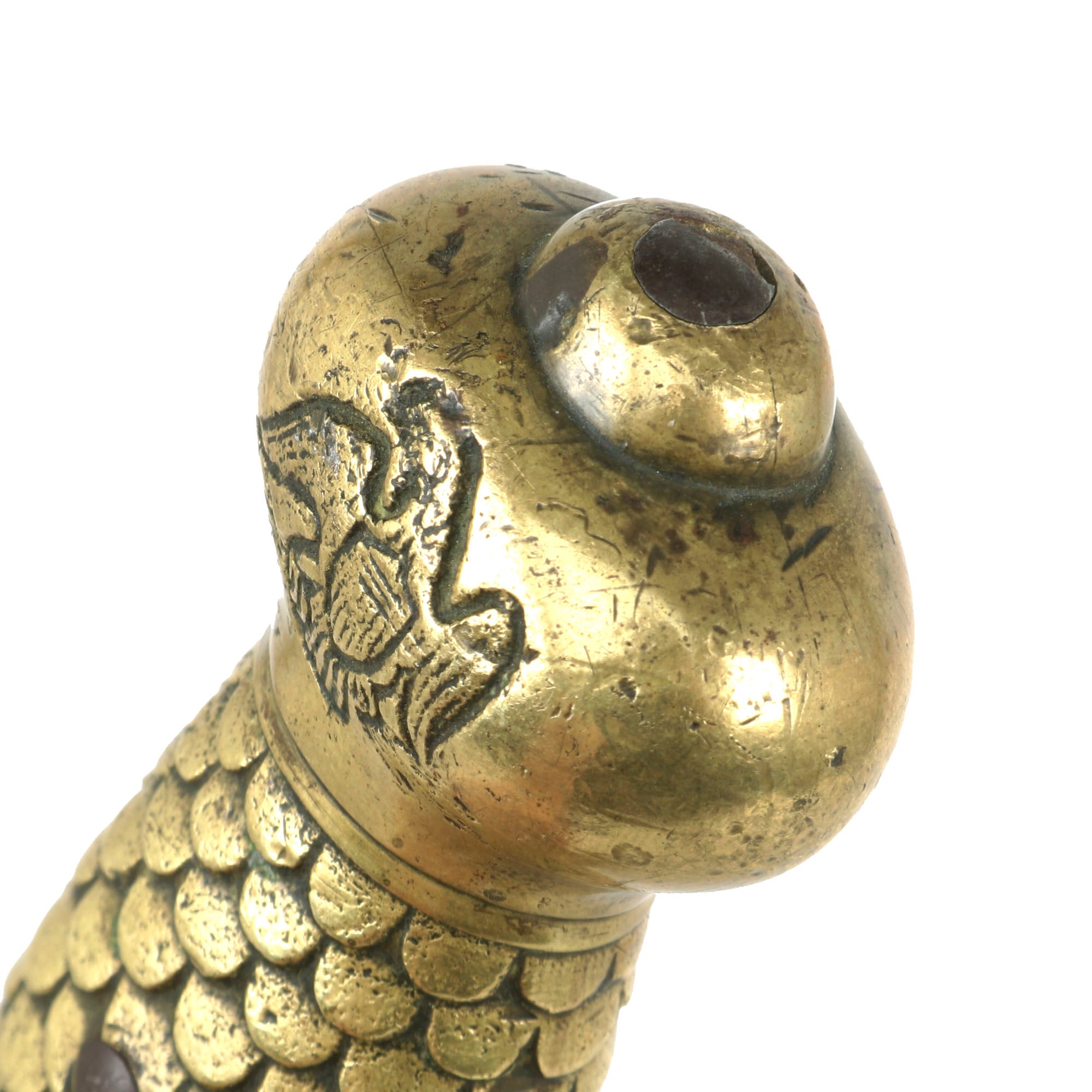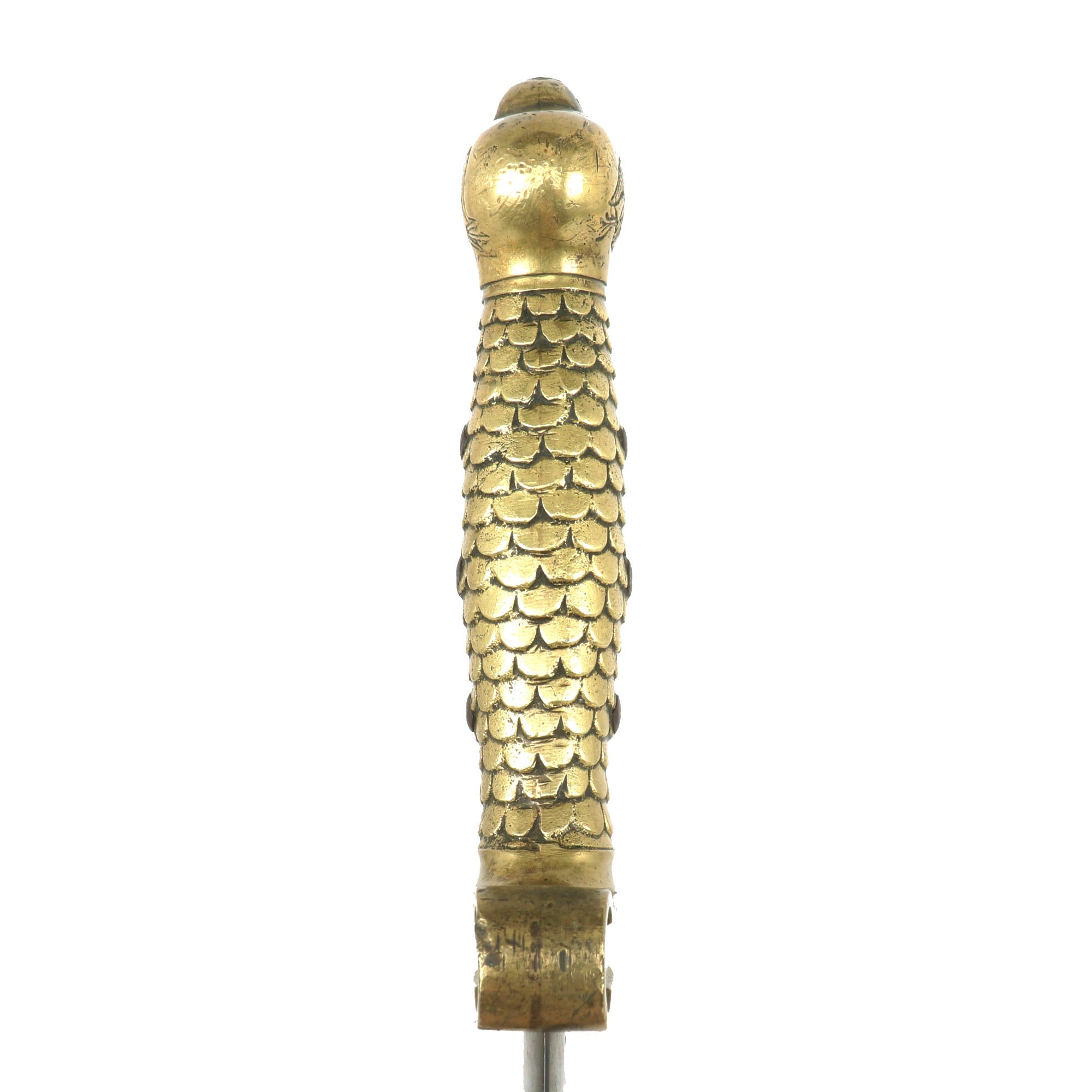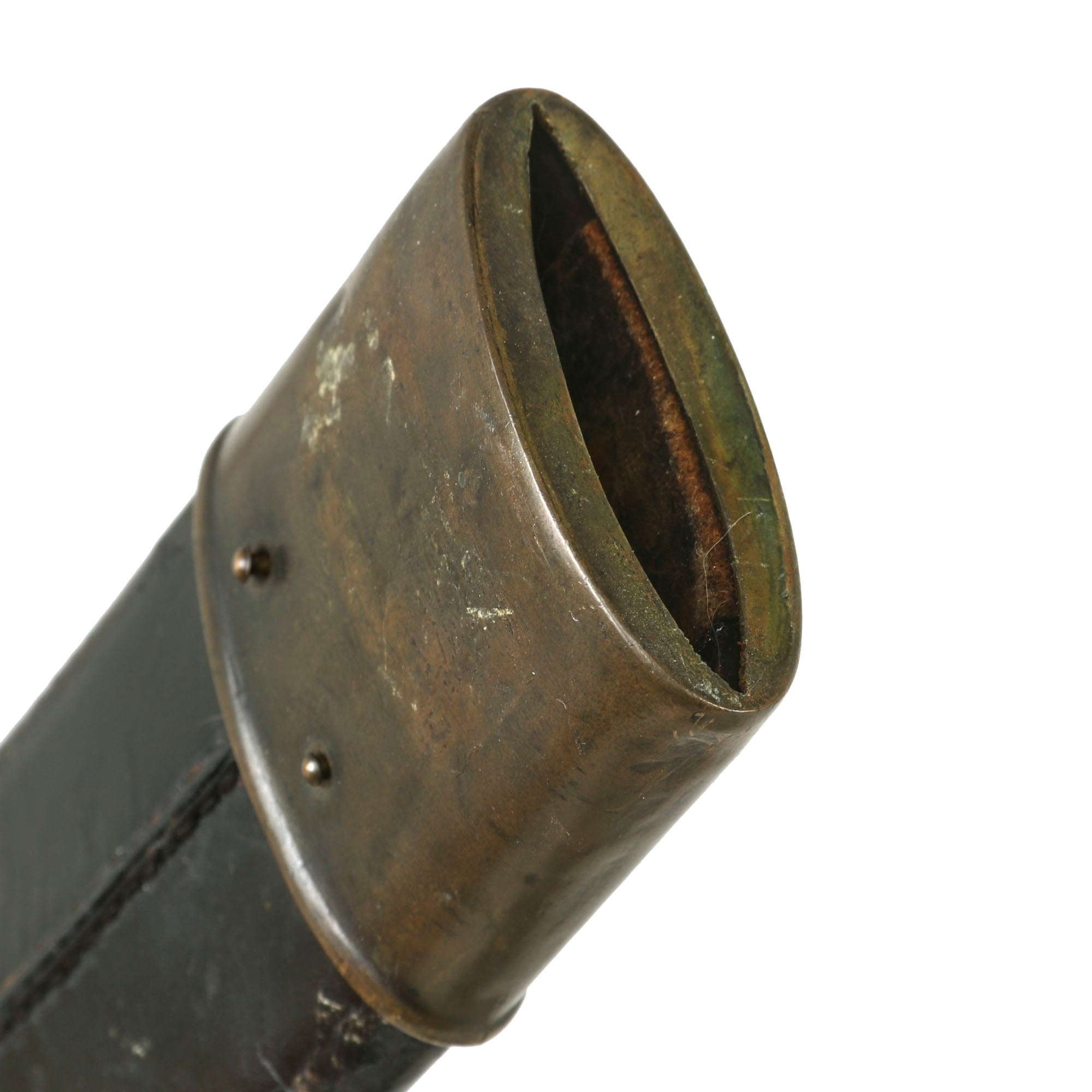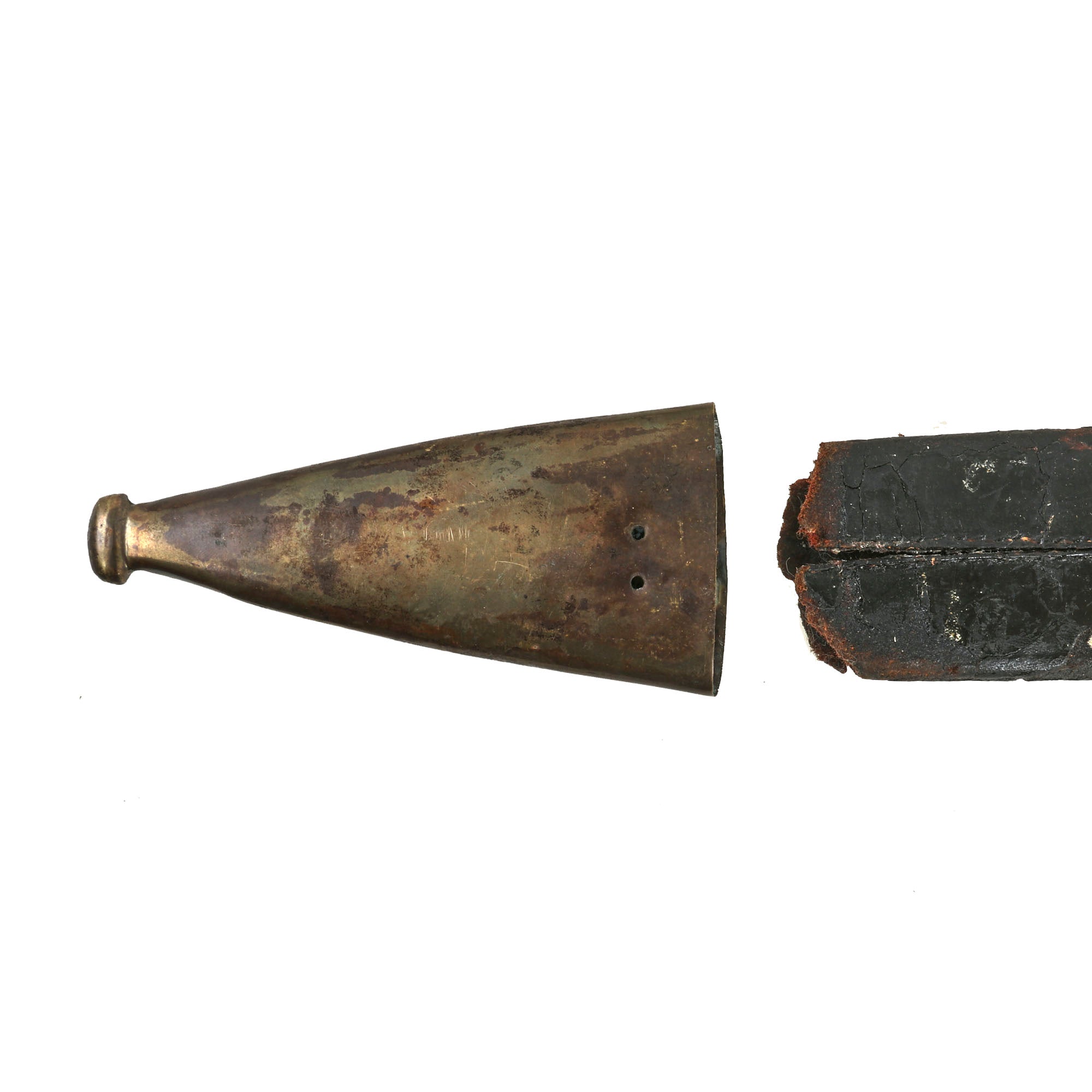 The black leather scabbard is in good condition, with a great look and mellow gold color on the brass fittings. The leather is heavily crazed and cracked in areas and the leather has become hard, pulling out all of the original seam stitching. The brass drag has torn off of the end of the scabbard and there is some leather loss as well, so the drag no longer sits on the scabbard and sits awkwardly on the tip of the blade.