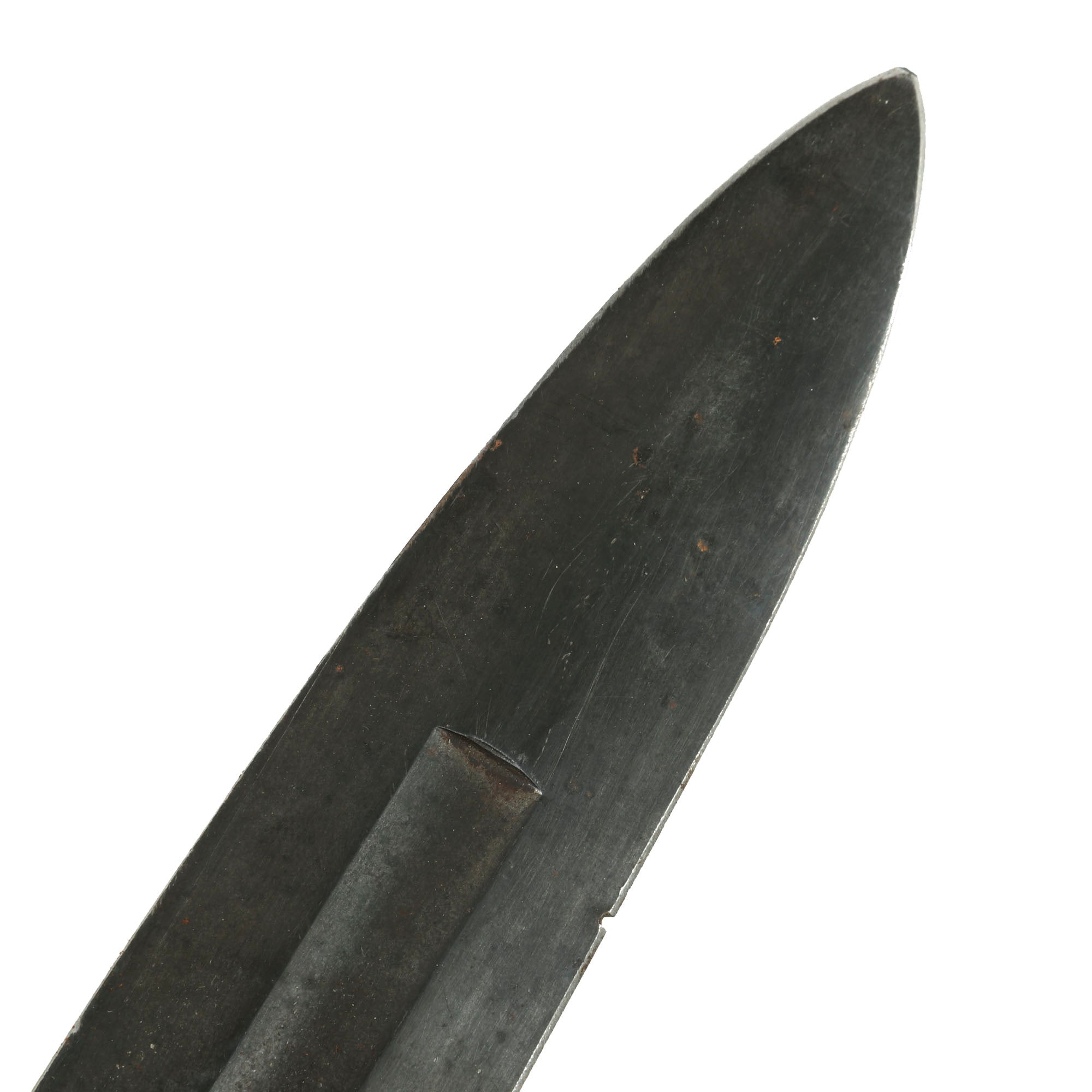 The blade on this example looks amazing and still retains much of the factory bluing. There also looks to have been some water rust staining near the point of the blade. It was not heavily cleaned, and original grind marks can still be seen in the fullers and elsewhere on the blade. There are some nicks on the edge of the blade, so it definitely did see some level of use in service. The blade is a very small bit loose in the hilt, but there is just a small wobble, nothing serious.