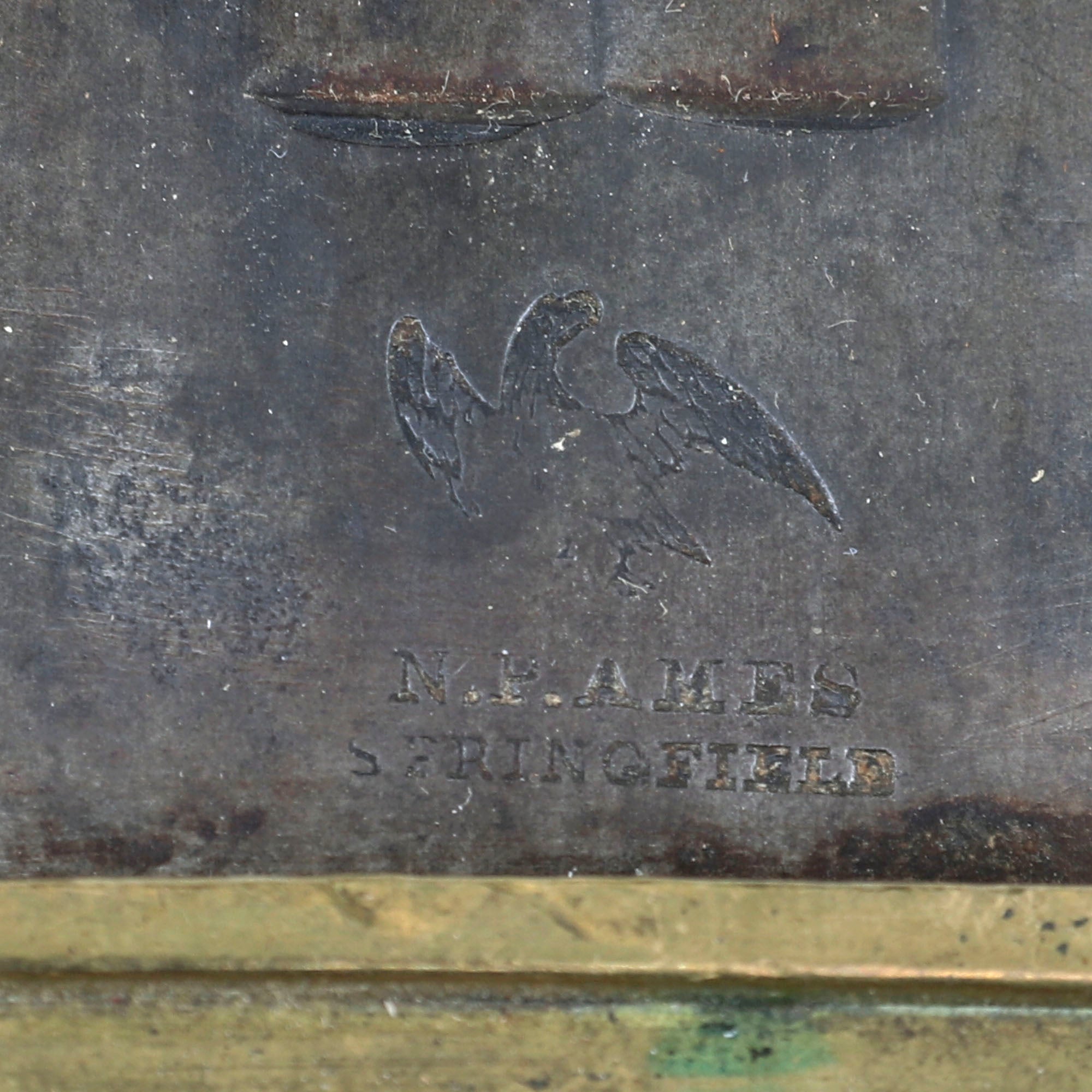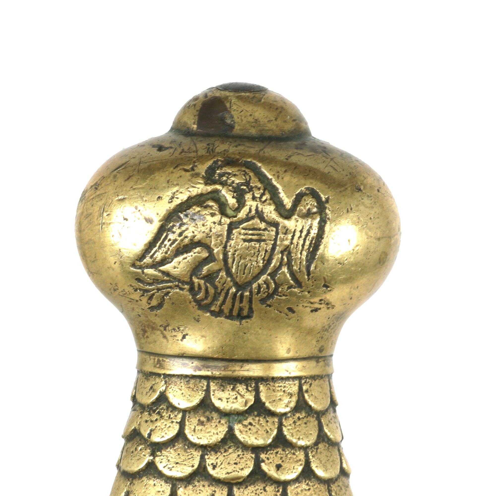 The grips have been molded in a scalloped eagle feather design. Three transverse iron rivets secure it to the tang of the blade. The pommel is decorated on each side with a heavily incised American eagle, with shield, holding arrows in his left talon and an olive branch in his right talon. The eagle's head faces towards its right. The straight cross quillons terminate in disk shaped finials, which are in great shape. Overall the grip has a lovely aged patina, with no signs of aggressive cleaning.