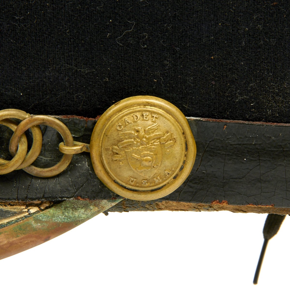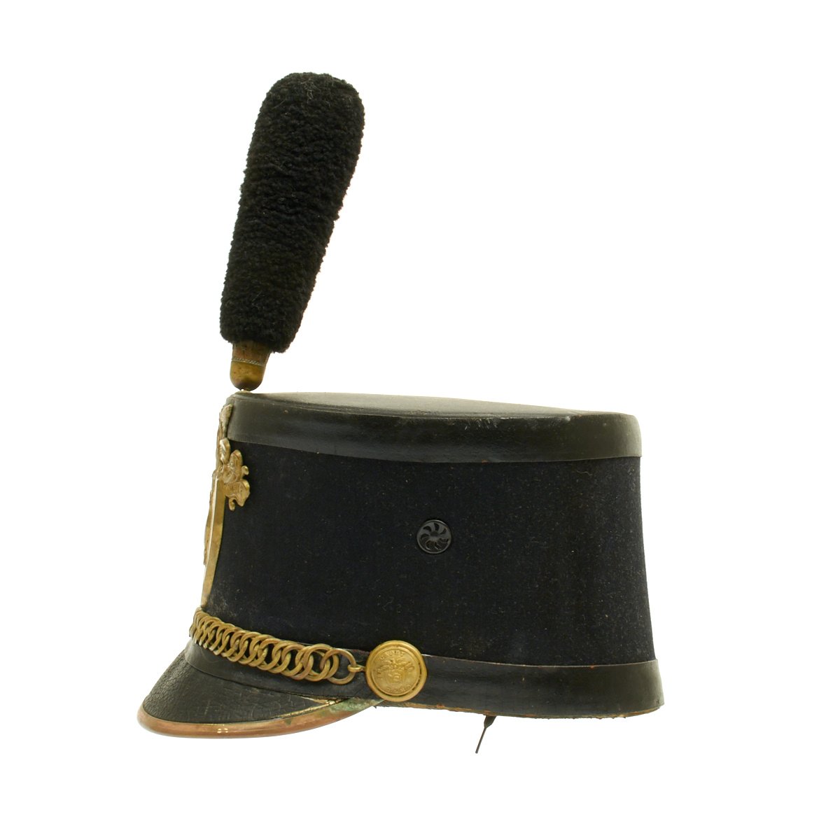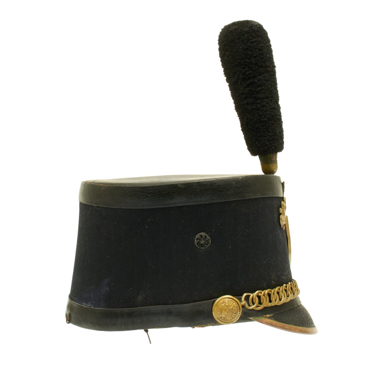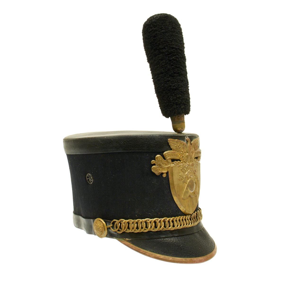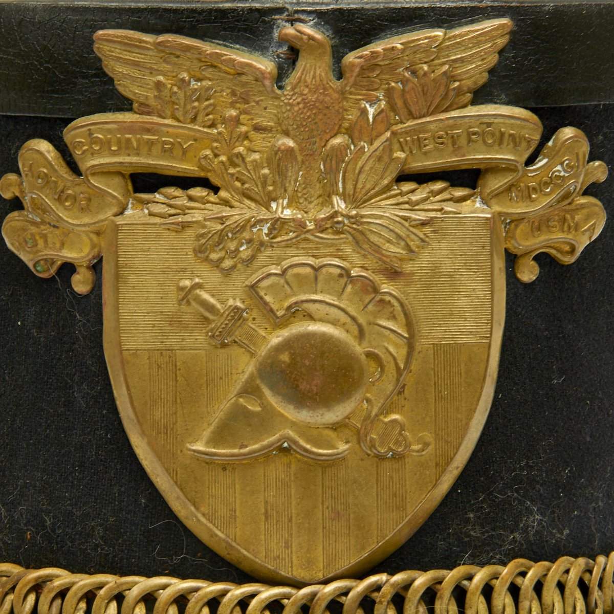 The stiff patent leather peak retains the brass edging and the Academy brass helmet plate is all present, the brass has a wonderful patina. Overall a wonderful example of a turn of the century West Point Cadet Shako.