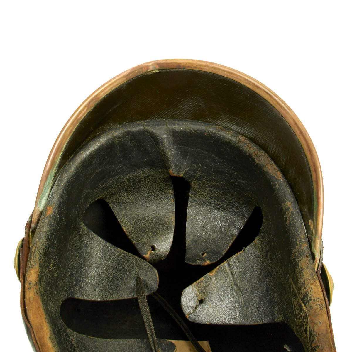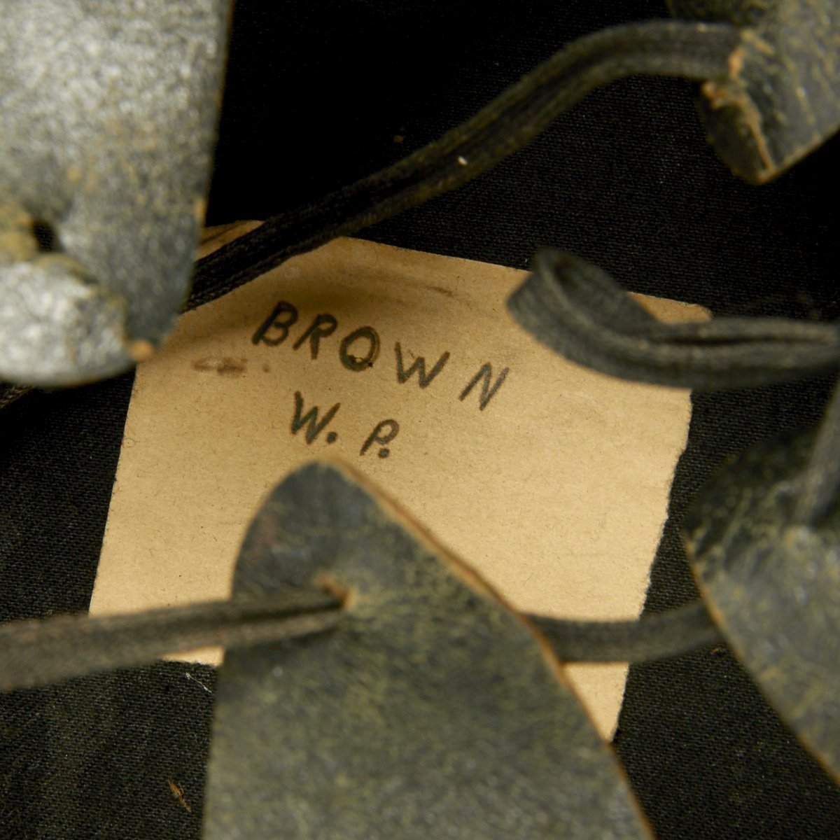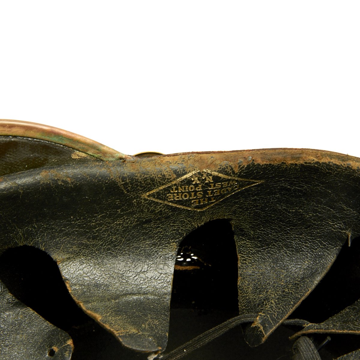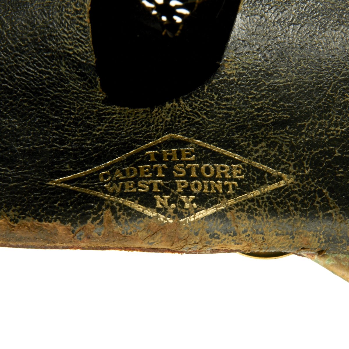 Leather liner reads The Cadet Store, West Point, N.Y. in a diamond shaped logo. West Point, New York is the home of the United States Military Academy. There is also an old paper label with hand written name in ink that reads BROWN W.P.