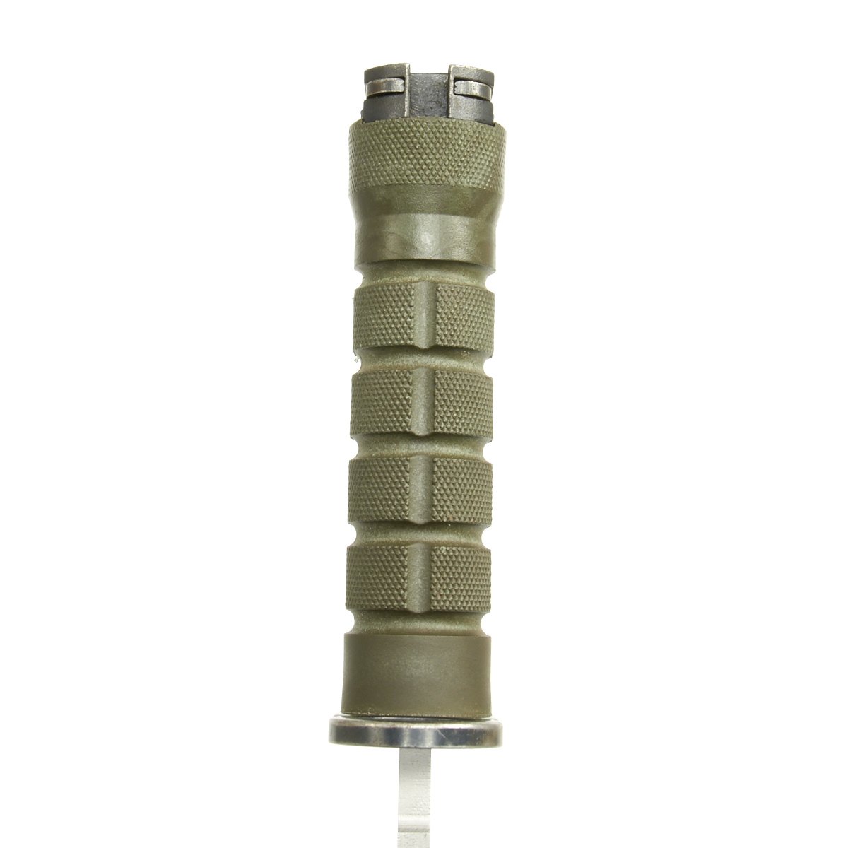 Some production runs of the M9 have a fuller and some do not, depending upon which contractor manufactured that batch and what the military specs were at the time. The M9 Bayonet partially replaced the older M7 Bayonet, introduced in 1964. Although it has been claimed that the M9 may be more prone to breakage than the older M7, the M9 bayonet has a 20% thicker blade and tang (0.235" vs. 0.195") and a 75% greater cross-sectional area of steel in the blade than the M7.