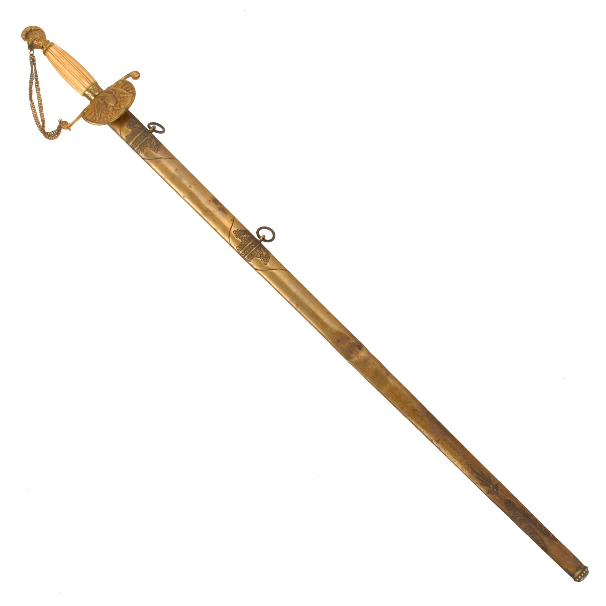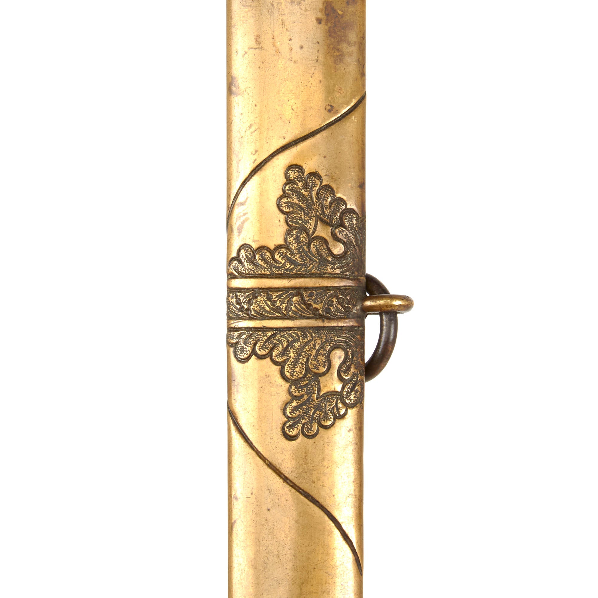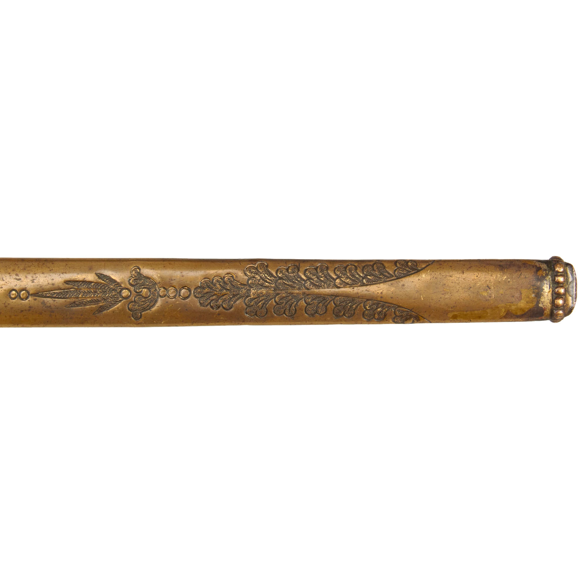 Such as with the hilt components, the scabbard is made of brass, with not much of the gilt remaining, except in a few glorious spots. There is no rusting, patina or major tarnishing to the scabbard, and all of the rings and bands are intact. One side of the scabbard is set with another traditional floral and eagle motif. Sword slides in and out with absolutely no resistance. The tension throat insert is unfortunately missing the set screw and will come out.