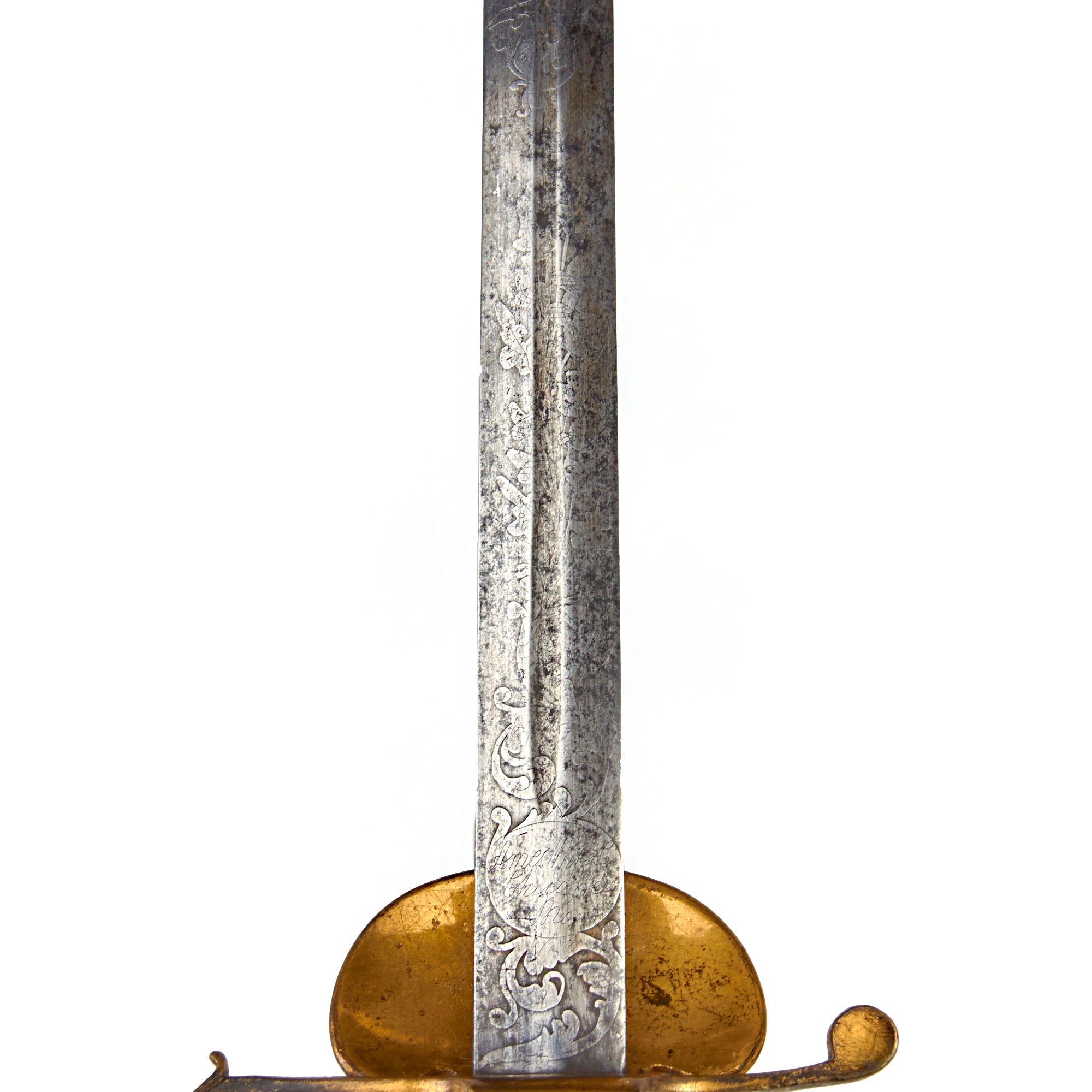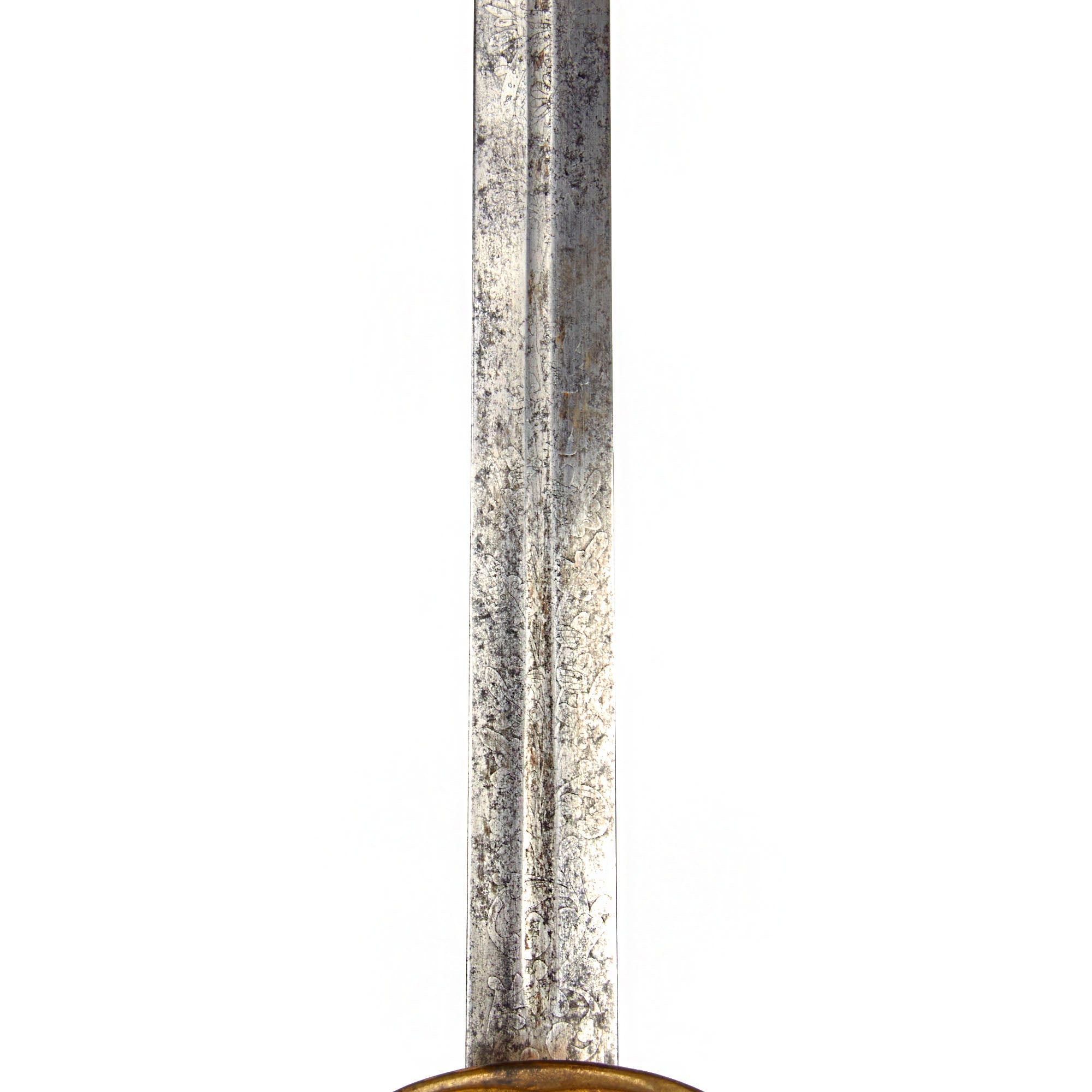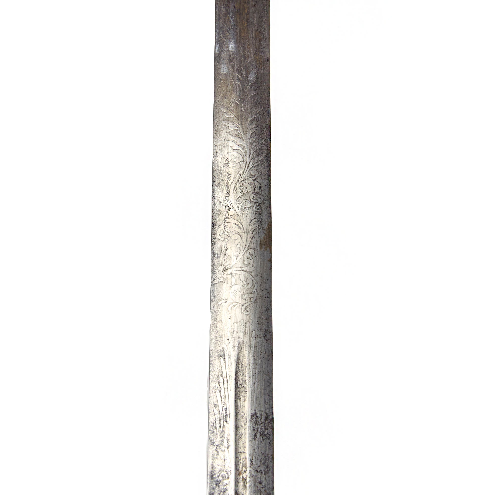 The blade is believed to be an 1834 pattern with a double-edge and thin central fuller that runs the length of the blade The steel still retains some of its original shine, with good edge and point, and lightly frosted etching. The obverse of the blade is etched with a scroll that has lovely cursive writing: