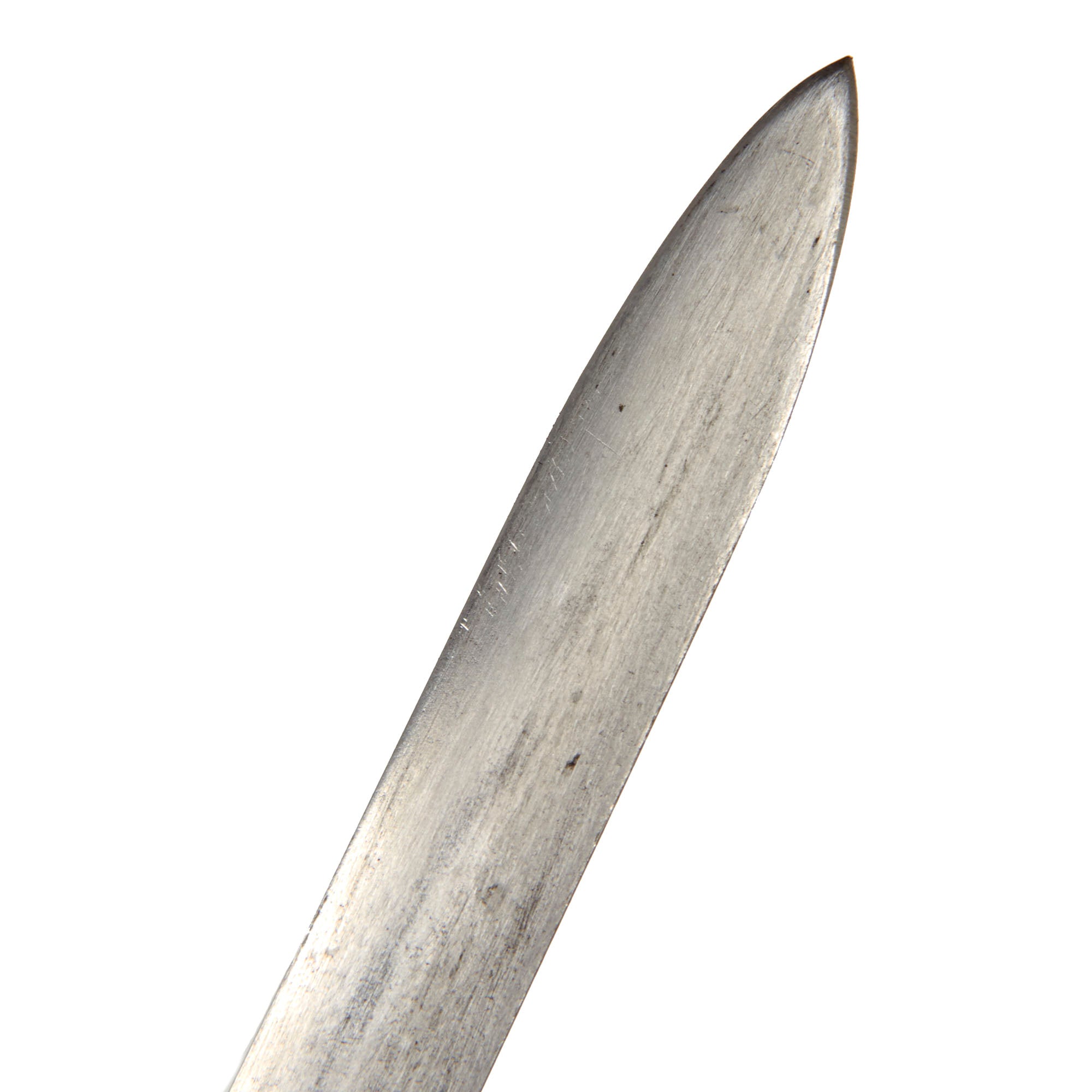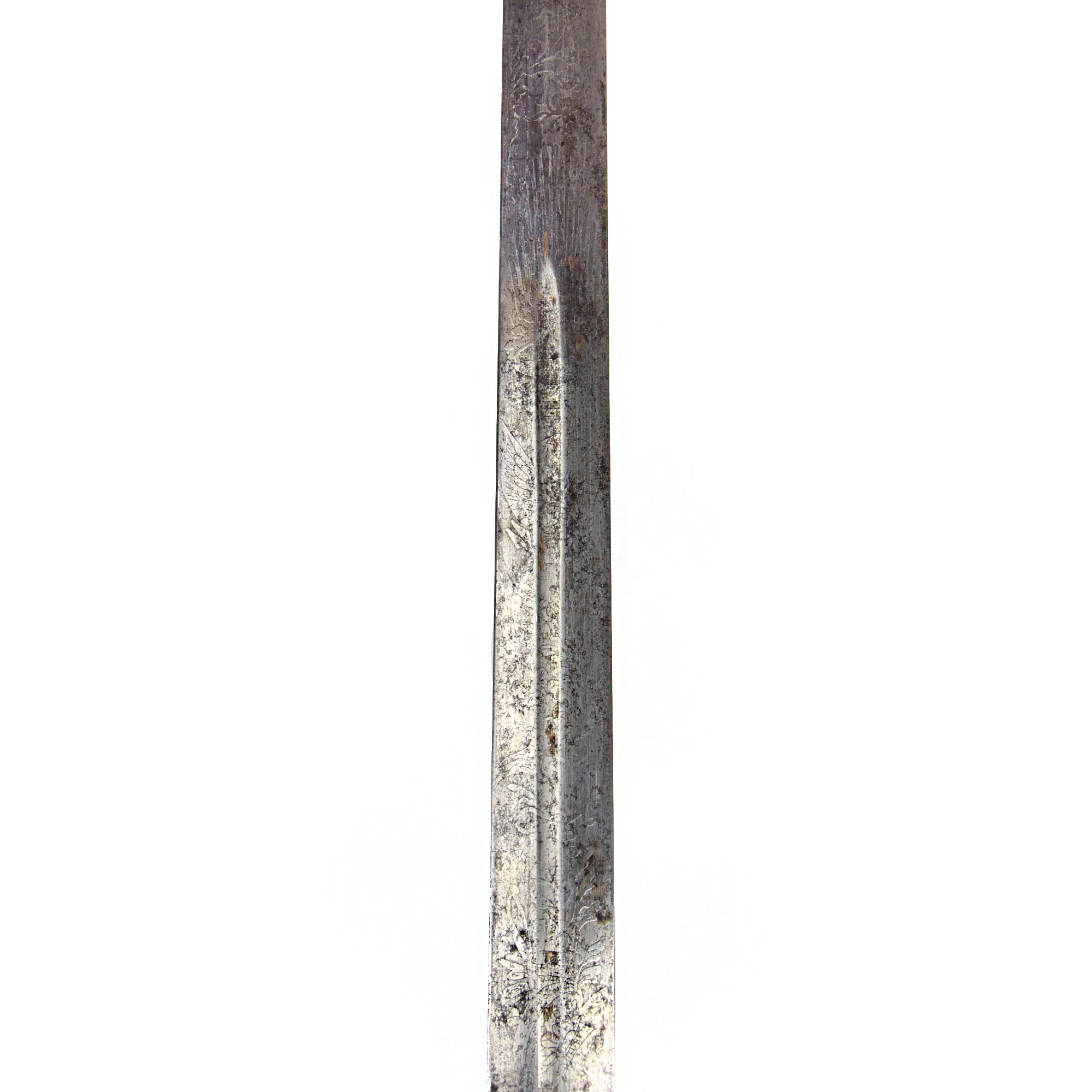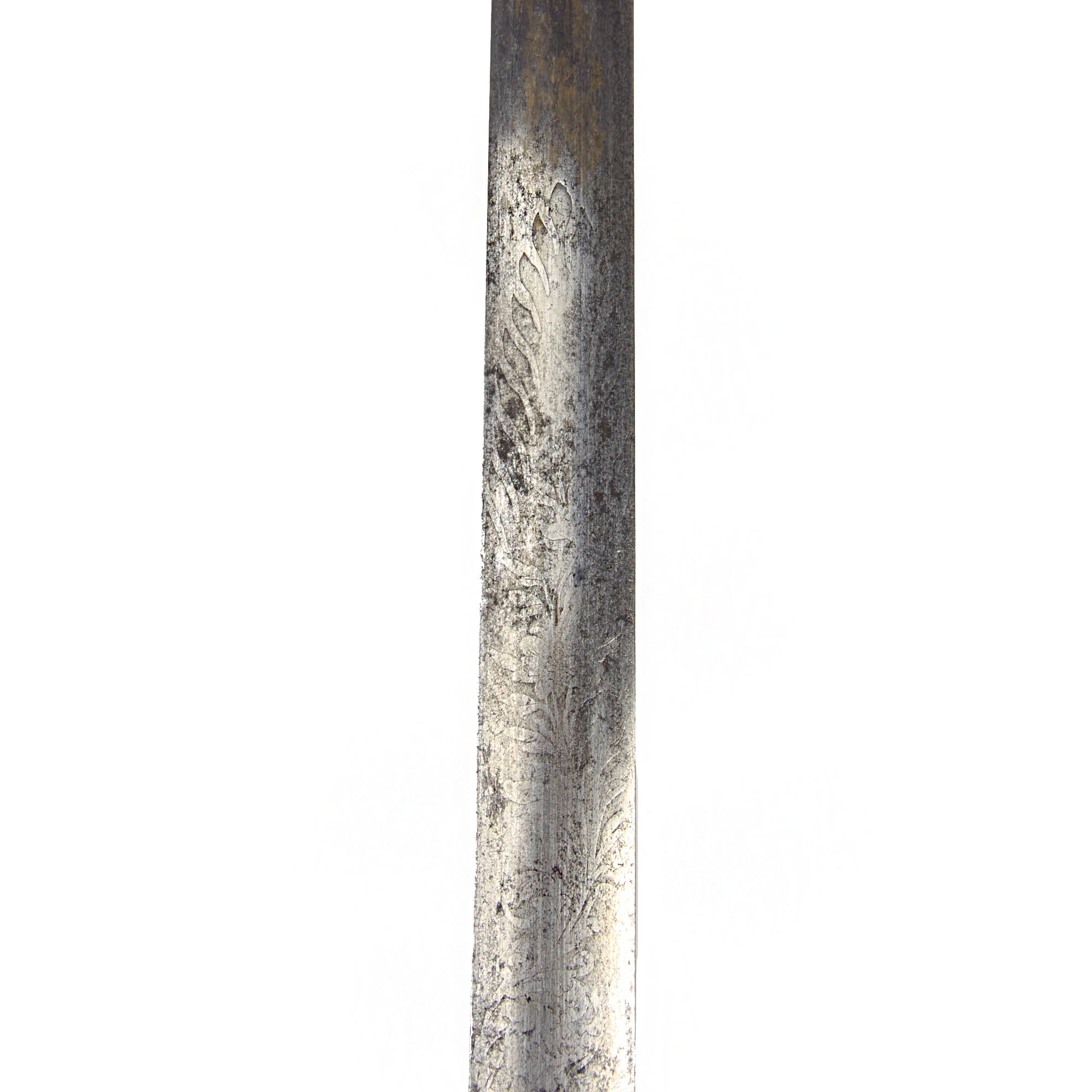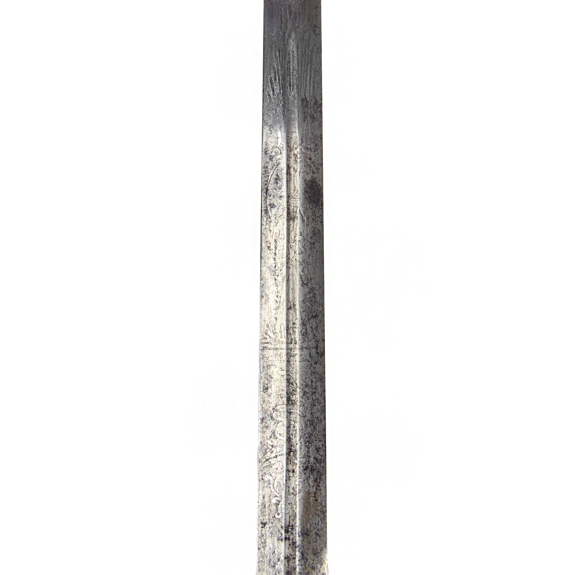 The blade is believed to be an 1834 pattern with a double-edge and thin central fuller that runs the length of the blade The steel still retains some of its original shine, with good edge and point, and lightly frosted etching. The obverse of the blade is etched with a scroll that has lovely cursive writing: