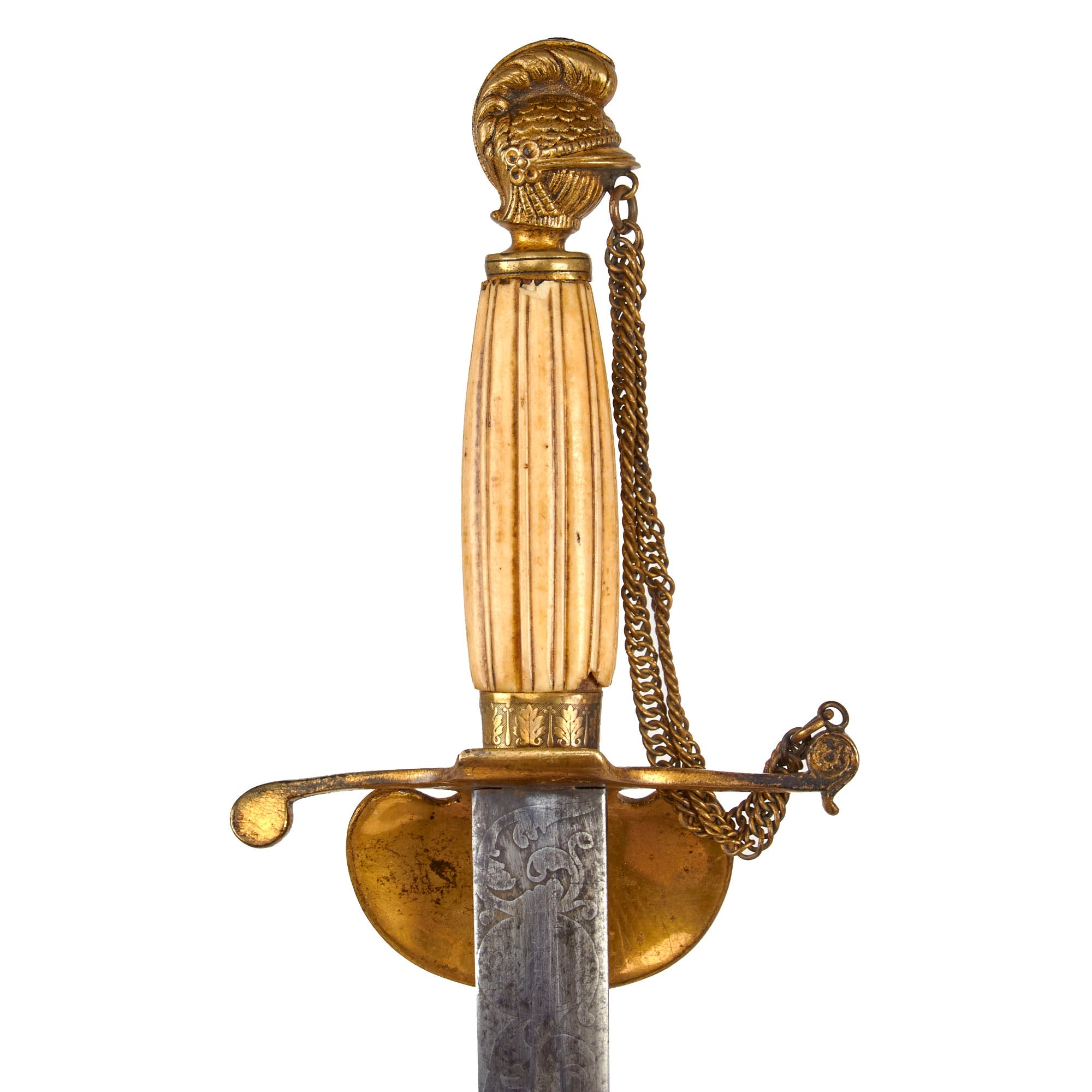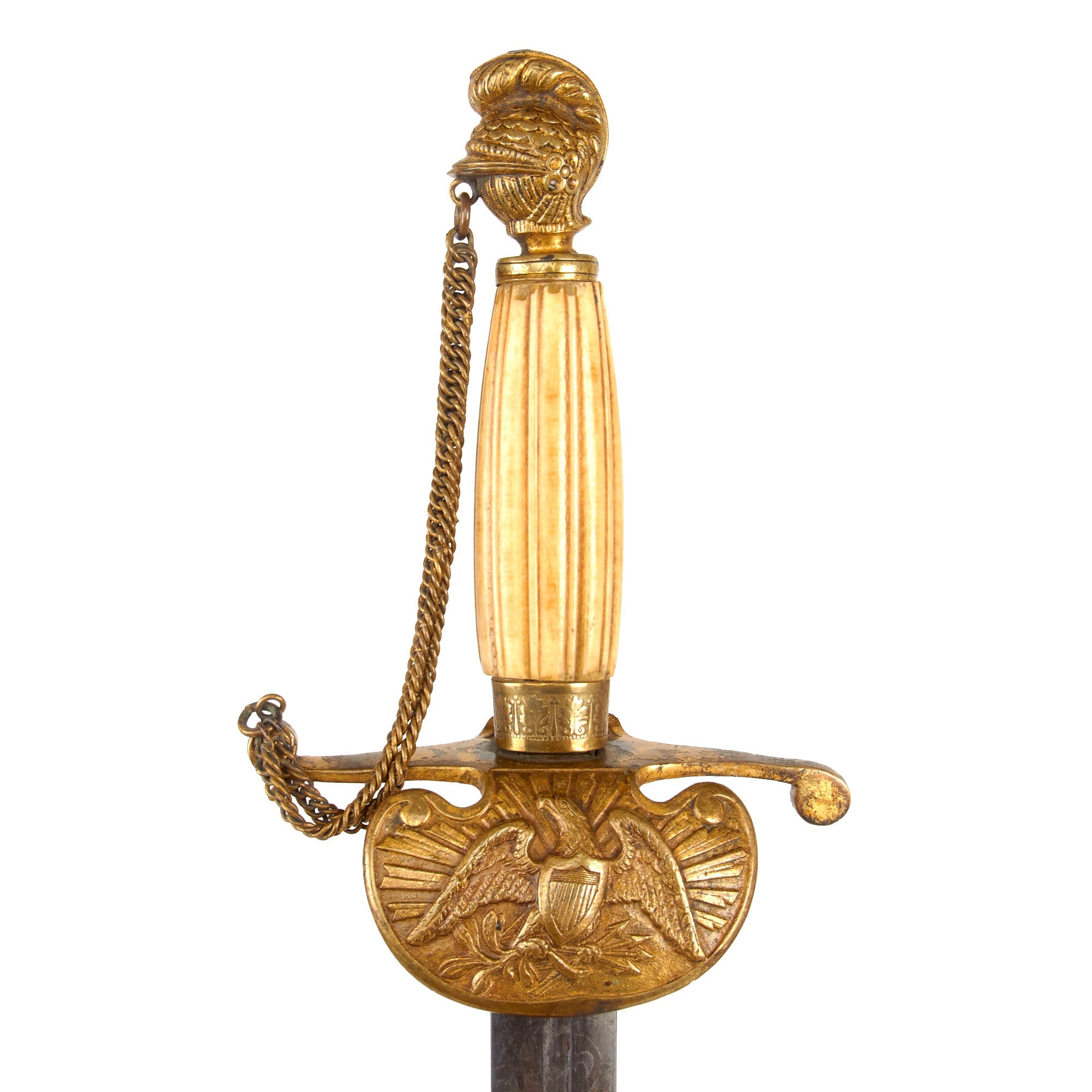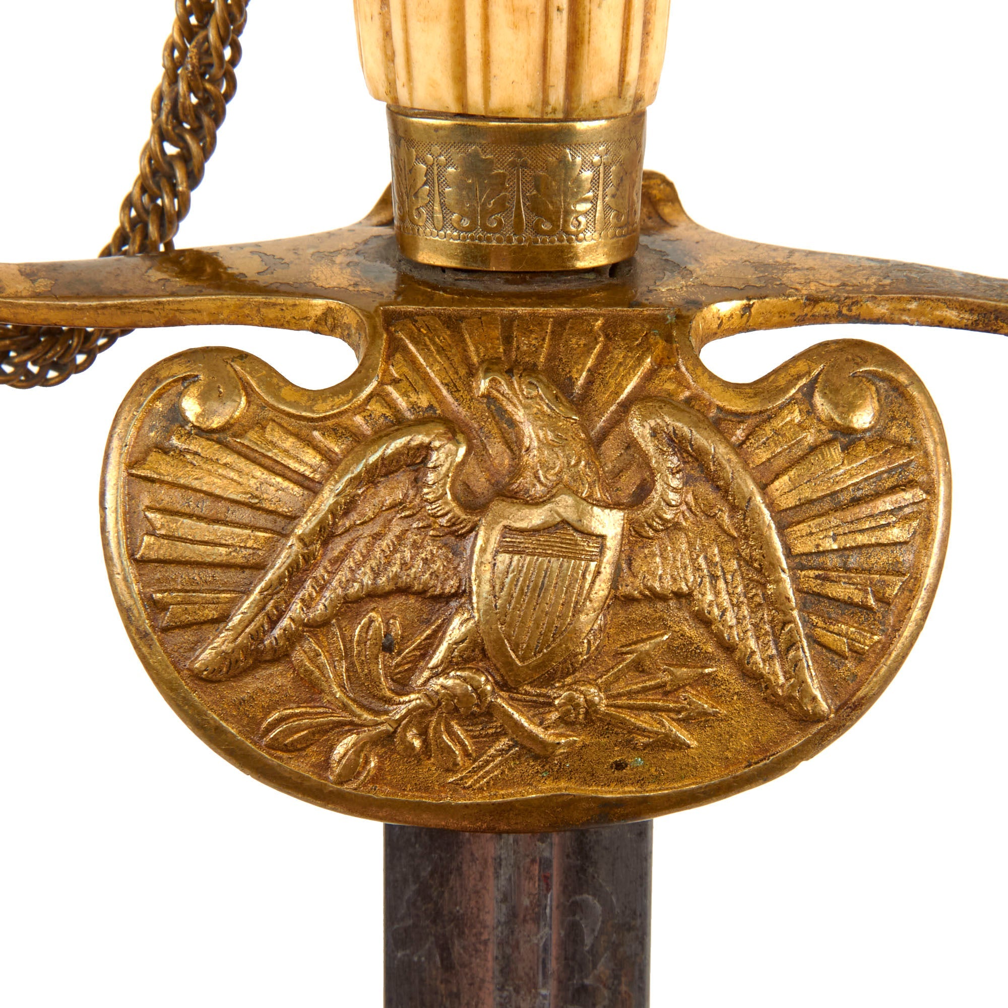 Swords of this design are pre-Civil War, rough estimated date circa 1840-1850. The cruciform-style half basket brass crossguard and chappe is in good shape, with limited patina and a much of the original gilt retained, and bears the Federal Eagle in the center of the top guard. The pommel is a cast of a medieval knight’s head and holds one end of the double chains connected to the knuckle guard. The chains are somewhat tarnished from time and exposure.
