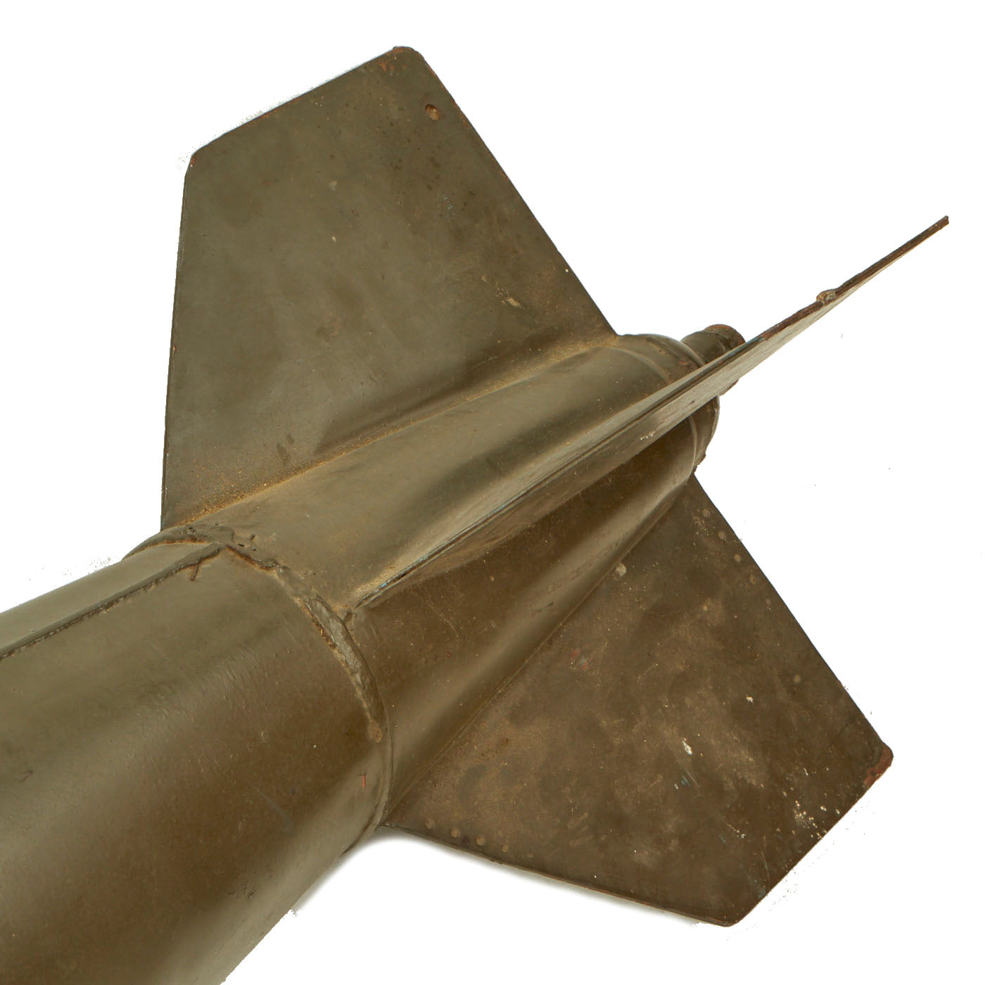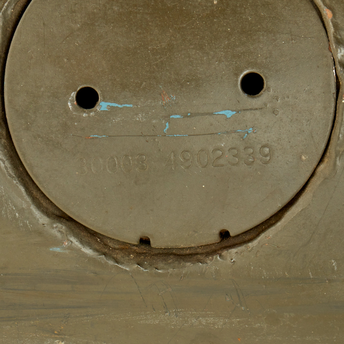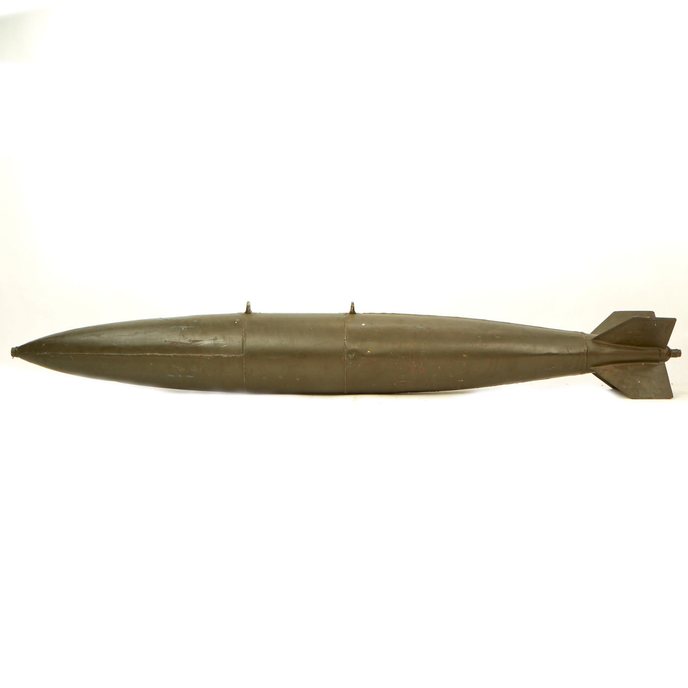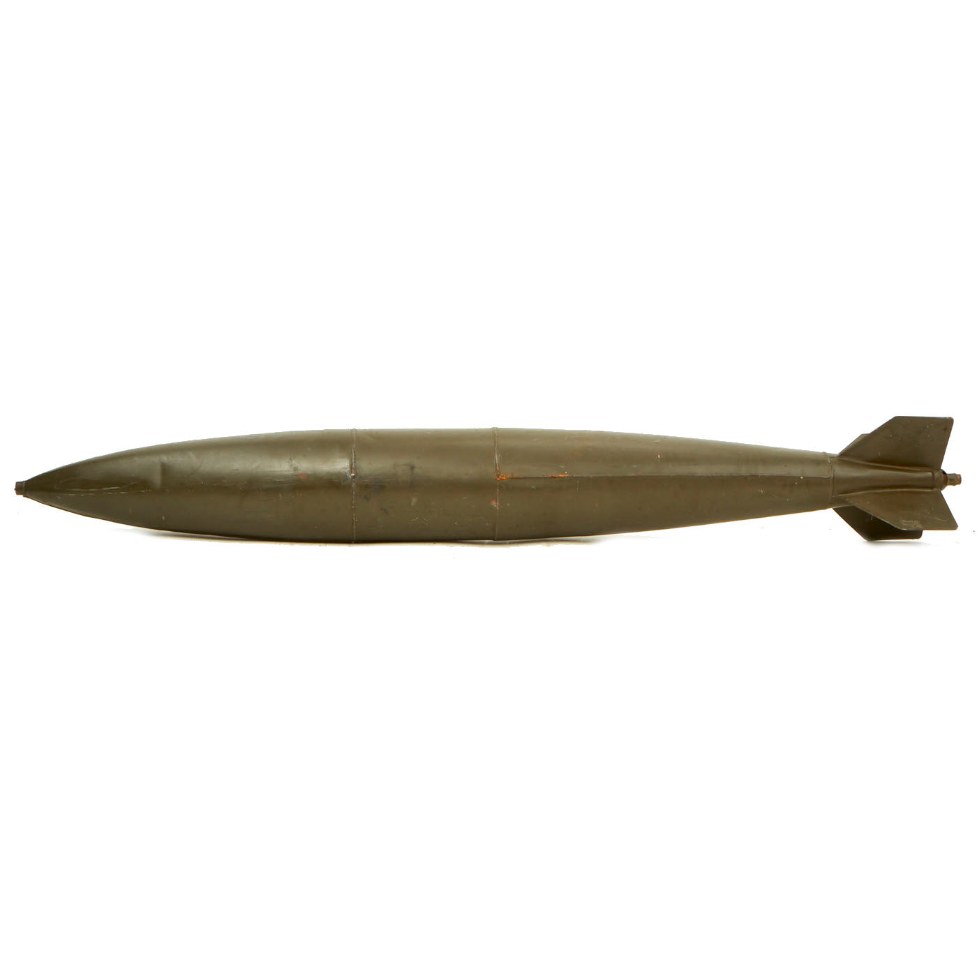 This 92” long example was designed to appear as a real Mk 83 for training purposes. It could be filled with a mixture of sand and water to supplement the weight of the explosive contents and is complete with 2 lifting lugs positioned on the top. There is no fuse or any “bolt on” attachments, this is just a bare example of the base model of the Mk 83. It is completely empty but still weighs a ton (95lbs)! It has been repainted OD green over the original "inert blue" color, which can still be seen in areas where the paint is worn. This is for sure bound to turn some heads once added to your collection!
